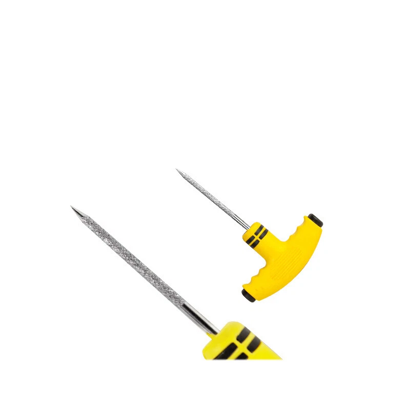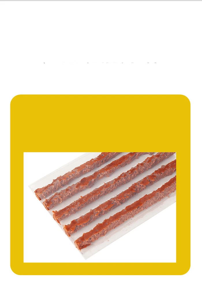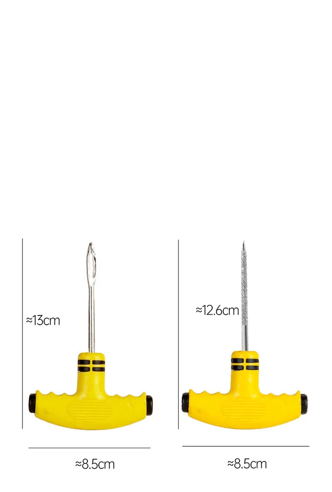 Description: Item size: 13*8.5CM Material: Rubber、 Stainless Steel Color: Yellow Contents. 1*Rasper Tool 1*Needle Tool 2*Rubber Gloves 5*Repair Strips 1*Storage Box Rasper Tool: Clockwise rotating thread design, easy to penetrate the tire and clear the debris inside the tire. Needle Tool: Made of high strength steel, no rust, good toughness. Rubber handle is comfortable and durable. Repair Strips: made of butyl rubber and natural rubber vulcanization, not easy to aging and hardening, good air tightness. Rubber Solution: If you find a little air leakage after tire repair, you can use the tire repair glue to fill and bond. Description: Item size: 13*8.5CM Material: Rubber、 Stainless Steel Color: Yellow Contents. 1*Rasper Tool 1*Needle Tool 2*Rubber Gloves 5*Repair Strips 1*Storage Box Rasper Tool: Clockwise rotating thread design, easy to penetrate the tire and clear the debris inside the tire. Needle Tool: Made of high strength steel, no rust, good toughness. Rubber handle is comfortable and durable. Repair Strips: made of butyl rubber and natural rubber vulcanization, not easy to aging and hardening, good air tightness. Rubber Solution: If you find a little air leakage after tire repair, you can use the tire repair glue to fill and bond. Instructions for use: 1.Mark the location of the tire to be repaired with a circle and pull out the puncture. 2. Probe the direction of the hole with a tire repair probe and insert it clockwise to clean up the dust in the hole. 3. Cut one end of the tape into a beveled opening and pass it into the eyelet at the front of the needle insertion tool, so that the length of the tape at both ends of the eyelet is basically the same. 4. Insert the needle with the rubber strip into the tire along the broken hole, make sure the rubber strip is inserted into 2/3 of the length, and rotate the needle 360 degrees and pull out the needle. 5. Cut off the rubber strip outside the tire.