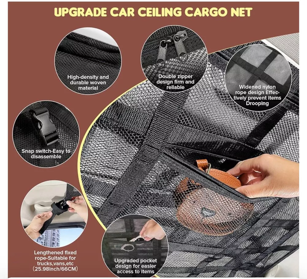 Car Ceiling Cargo Net Storage Organizer For Most Cars & Suvs 31.5” x 21.3” Double layer mesh New Item#K28