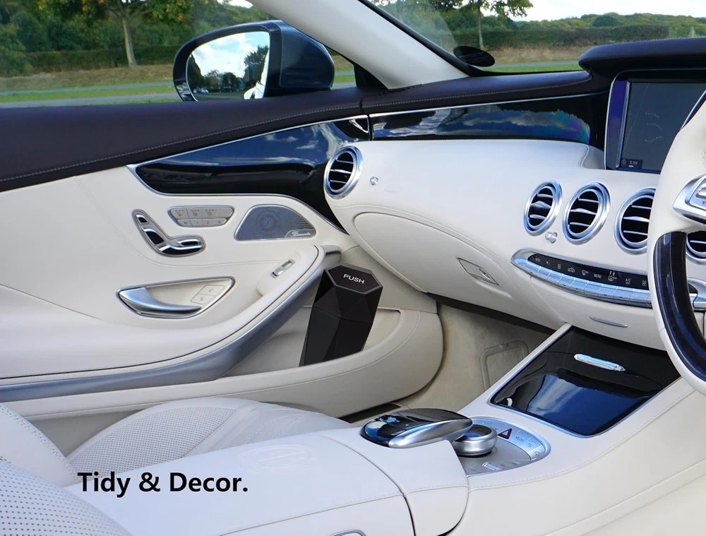 [SPACE EFFICIENT] - Mini trash can for car that are designed to fit in your vehicle’s cupholders,backseat pocket, in the center console or the water bottle holders on the car’s doors. Automotive garbage cans are easy for the driver to reach without being in the way of your driving. A compact trash can is great for cars with limited space to spare. [LEAK-PROOF DESIGH] - The cover of the plastic trash can has a spring-loaded lid: push down on it to insert your trash, and it flips back up to the closed position to keep your garbage from spilling out. It can effectively seal in any foul odor and keep the trash out of sight. This small car trash can keeps your car tidy and clean. [ADDITIONAL BAGS & HOOKS] – Mini automatic portable car trash can comes with 6 rolls (90pcs) of small trash bags and 2 ABS hooks. These mini trash bags are packed in a very delicate and light way that is convenient to store or carry, you can throw the bag without washing the trash can. The hook is easy to install and remove, can hang purses, bags, clothes, water bottle to make full use of the rear seat space. [MULTIPURPOSE-USE] - Car door trash can, the diamond cut design is fashionable. Compact trash can is a good solution for ashtray, gum and candy bar wrappers in the vehicle. Car trash can with lip can also be used as a tiny household or desktop trash receptacle in places other than your cars, such as an office, kitchen, or bedroom to keep the space clean and organized. [EASY TO CLEAN] – Car trash bin is made of ABS plastic, comes with a removable cover so that they can be easily be empty and cleaned all the way. You can easily clean out this mini garbage can with soap and water. Product Description Spring-loaded Lip Push down on it to insert your trash, and it flips back up to the closed position to keep your garbage from spilling out. Easy to clean Made of ABS material, comes with a removable cover so that they can be easily be empty and cleaned all the way. 6 rolls of Trash Bags These 90pcs mini trash bags are packed in a very delicate and light way that is convenient to store or carry, you can throw the bag without washing the trash can. 2 ABS Hooks Made of high-quality ABS materials, flexible, each can hold up to 44 lb (20 kg). The hook is easy to install and remove, can hang purses, bags, clothes, water bottle to make full use of the rear seat space.