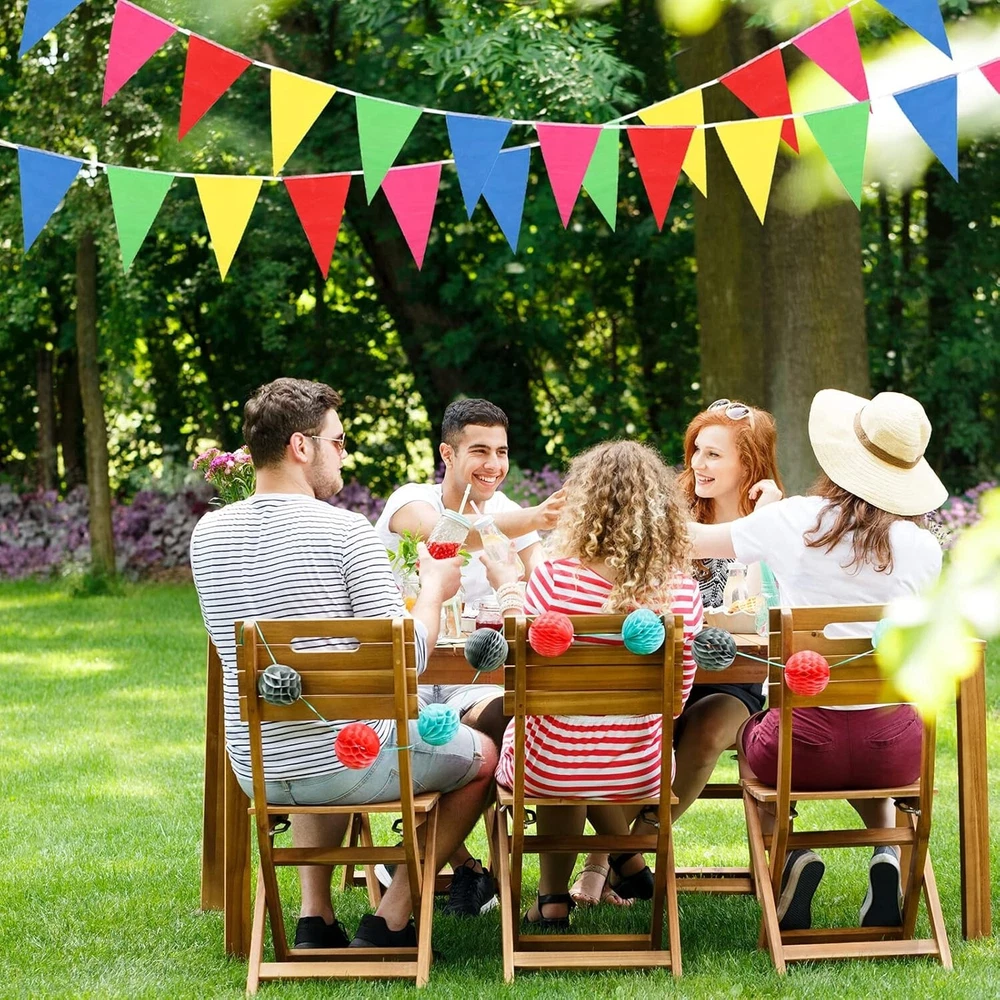 About this item Nylon Quality Selection: These flag strings are made of thick nylon rope, all pennant banner flags are laser cut and quality stitched on the white string to make it can be reused time and time again. Package Included: Total 300 pieces colorful party flags contains 5 vibrant colors, includes red, blue, green, and yellow, super easy to add an attractive and exciting addition to any party. Product Size: Single-sided pennant banners-7" x 11" (w x l), the total length of the banner-375ft.The length is enough, if large event or outdoor space is too large, it is recommended to buy more at a time to create a warm atmosphere. Wide Use: These colorful banner flags are very suitable for outdoor events or indoor decor-weddings, birthday, dance party, rainbow theme party, grand openings, carnivals, circus decorations; Christmas, sports events, school graduation ceremony and other holiday celebrations. Note: These pennants need to be connected in series by themselves. The work is convenient and simple.