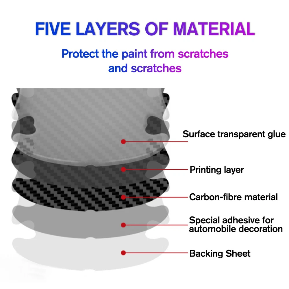 Door Sill Scuff Cover Stickers Made of high quality Carbon Fiber Textured Faux Leather, Anti Scratch and abrasion resistant, durable and effective in protecting car door sills. Easy Installation: P lease wipe the car door sill clean before installing, to ensure that there is no oil and dust first, then remove the protective paper on the back of the sticker, gently stick on the door sill above to ensure that no air bubbles are generated. Simple Maintenance: When the car door sill protector reflective sticker is stained with dirt or oil, simply wipe it with a damp rag and it will look like new with a gentle wipe. Door Cup Stickers & Door Handle Stickers Material: Carbon Fiber Texture Vinyl Stickers + Epoxy Resin Self adhesive , won’t fall of easily, will keep your door cups looking like new, without changing the appearance in any weather. No more scratches to the door handle cups Easy to Install: Clean car door handle cup and let it dry, then tear off the protector film from adhesive backing, stick film onto the cup and adjust the perfect position. Package Included : 4PCS Door Sill Scuff Cover Stickers (2 Front + 2 Rear) 4PCS Door Cup Stickers 4PCS Door Handle Stickers