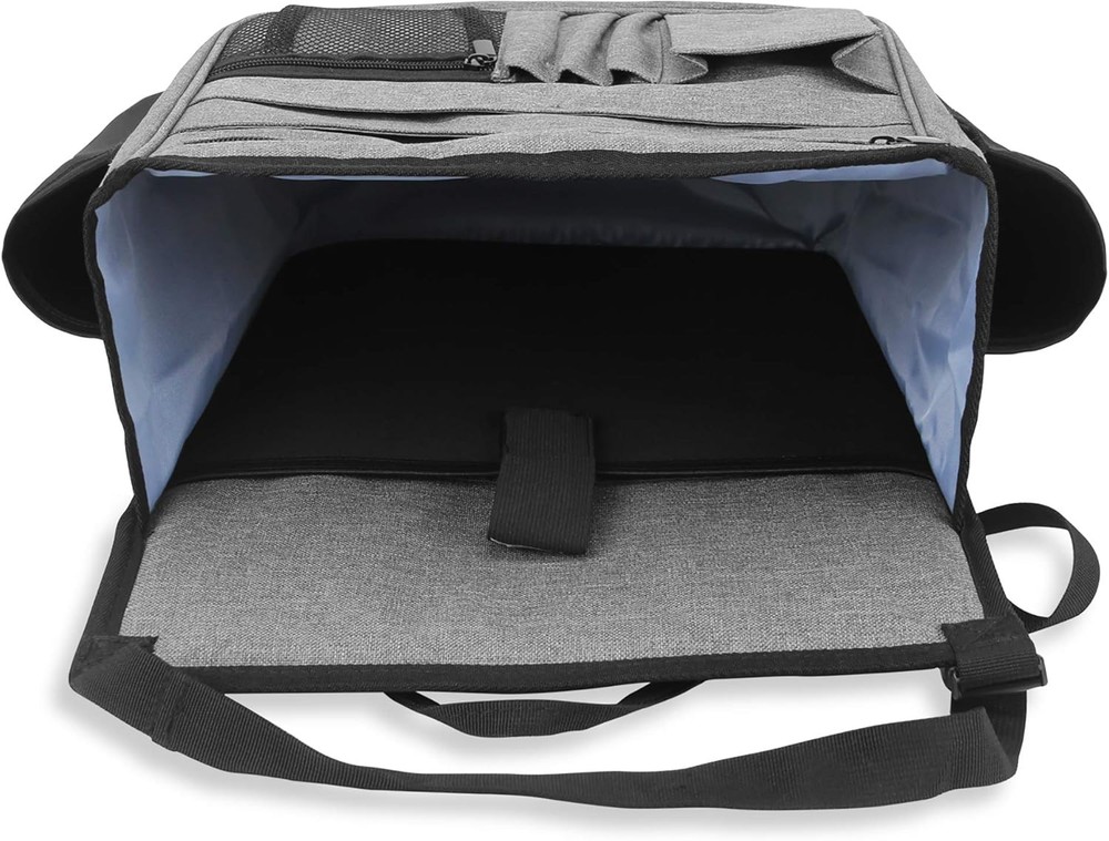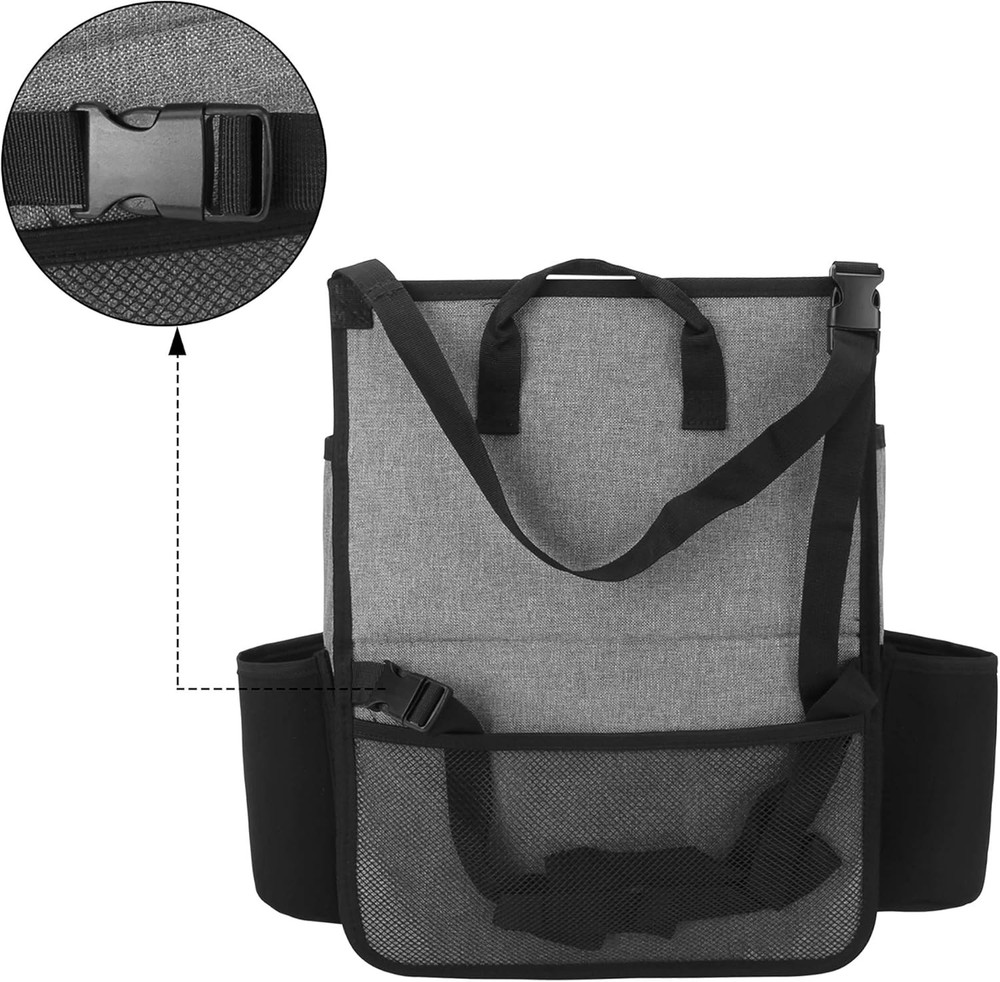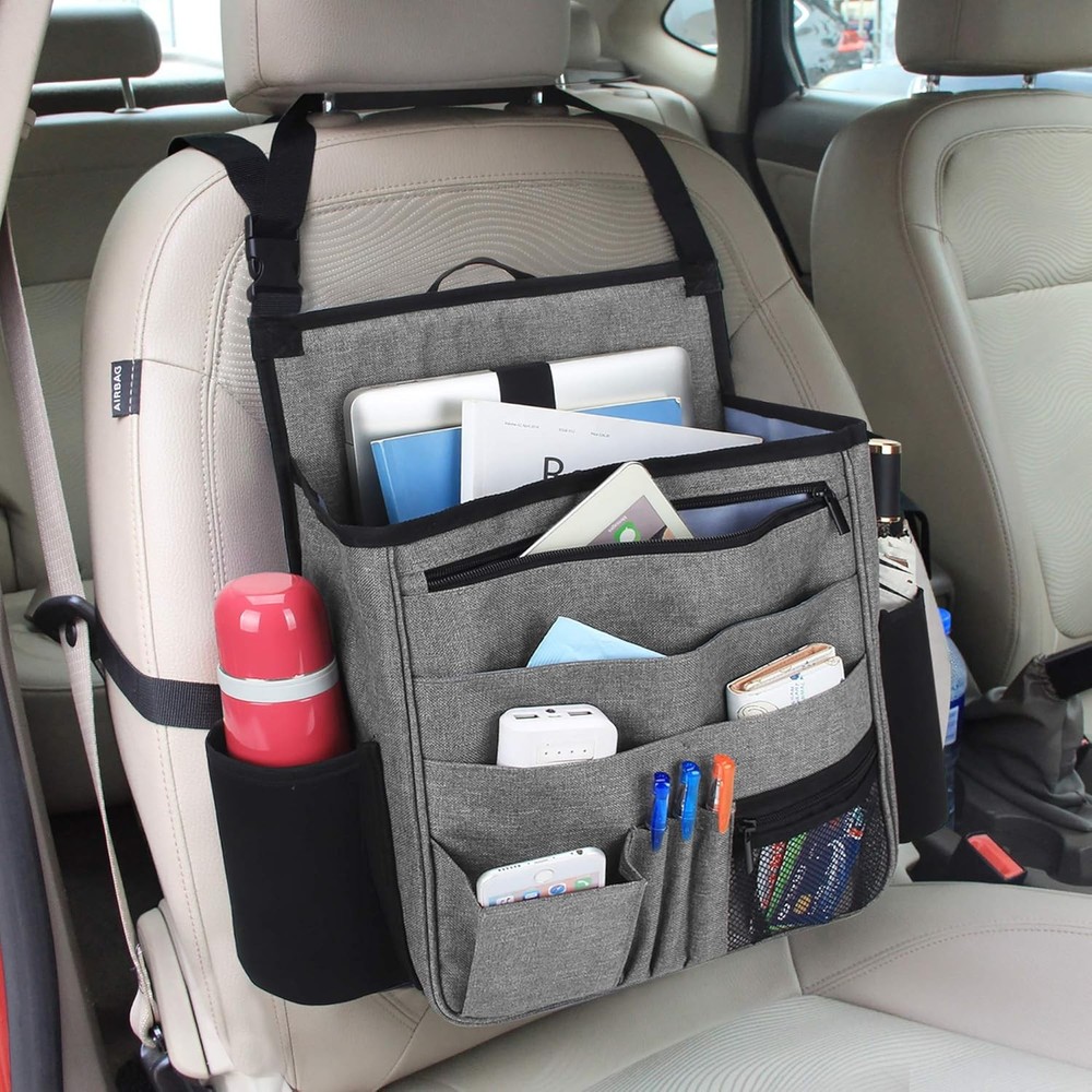 Car Front Seat Organizer with Laptop and Tablet Storage Pockets, Car Seat Organizer with Back Adjustable Straps, Gray About this item GREAT QUALITY: Made of heavy-duty nylon, water-resistant and abrasion-resistant. Soft padded lining on the main pocket protects your laptop, tablet, folder, and more. HEAVY-DUTY: Reinforced back support, strong buckles, and long adjustable straps (up to 39 inches) ensure your items remain secure. Back adjustable straps facilitate easy securing in your car. SEVERAL COMPARTMENTS: A protective neoprene sleeve for securing your laptop. A large main compartment for storing a clipboard, books, or tablet. Two neoprene holders on the side are ideal for bottles. Three slots are provided for pens and pencils. Six pockets of different sizes accommodate small tools like electronic products, labels, tissues, etc. CONVENIENT: A reinforced grab handle on top and adjustable straps make it easy to move this car seat organizer to and from your vehicle. DIMENSIONS: 12.5"(W) x 16.5"(H). This car seat organizer keeps your trunk clean and organized.