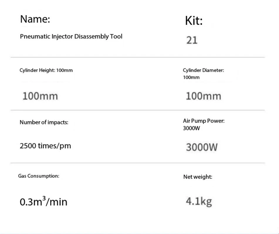 Car Fuel Injector Tool Removal Puller Pneumatic Fuel Injector Extraction Puller Packaging box color shipped randomly, no customization available Name: Pneumatic Fuel Injector Removal Tool Cylinder Height: 100mm Impact Rate: 2500 impacts/min Air Consumption: 0.3m³/min Kit: 21 Cylinder Diameter: 100mm Air Compressor Pow