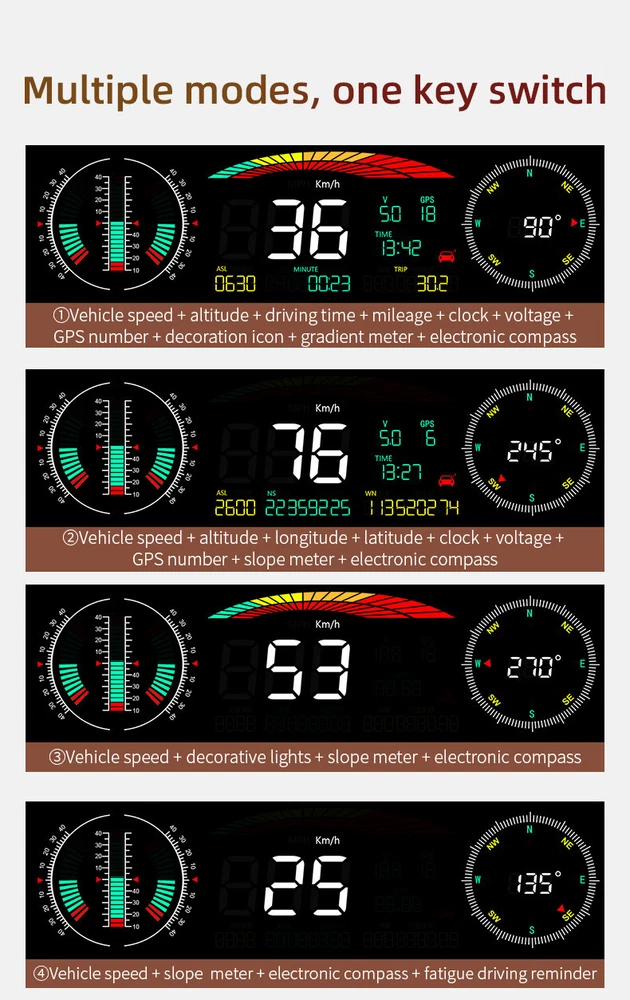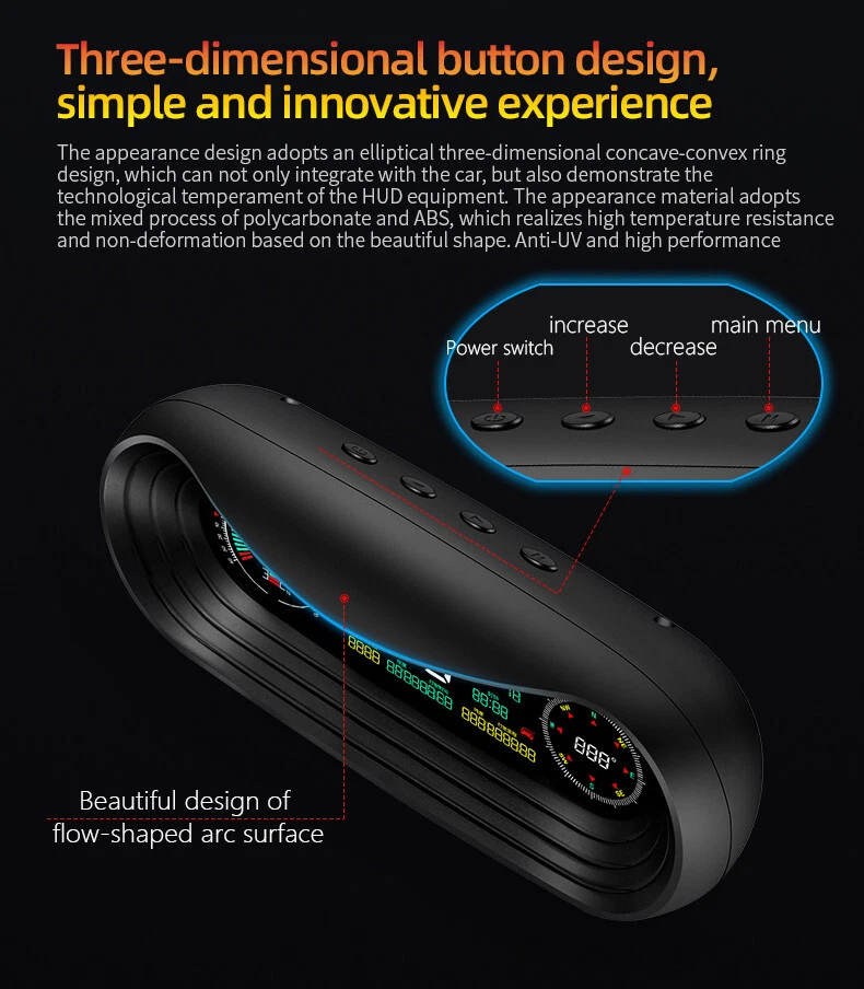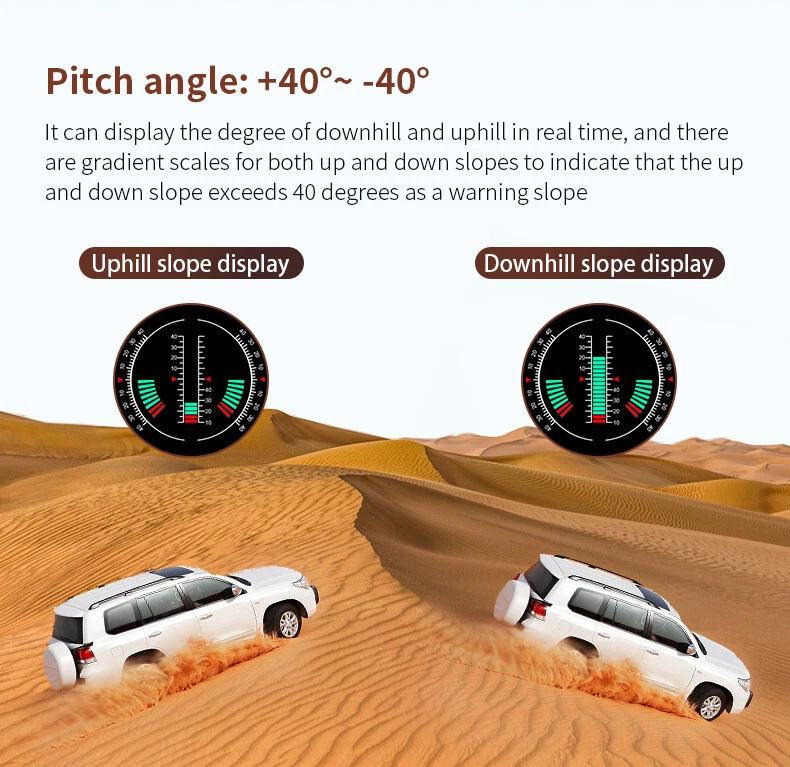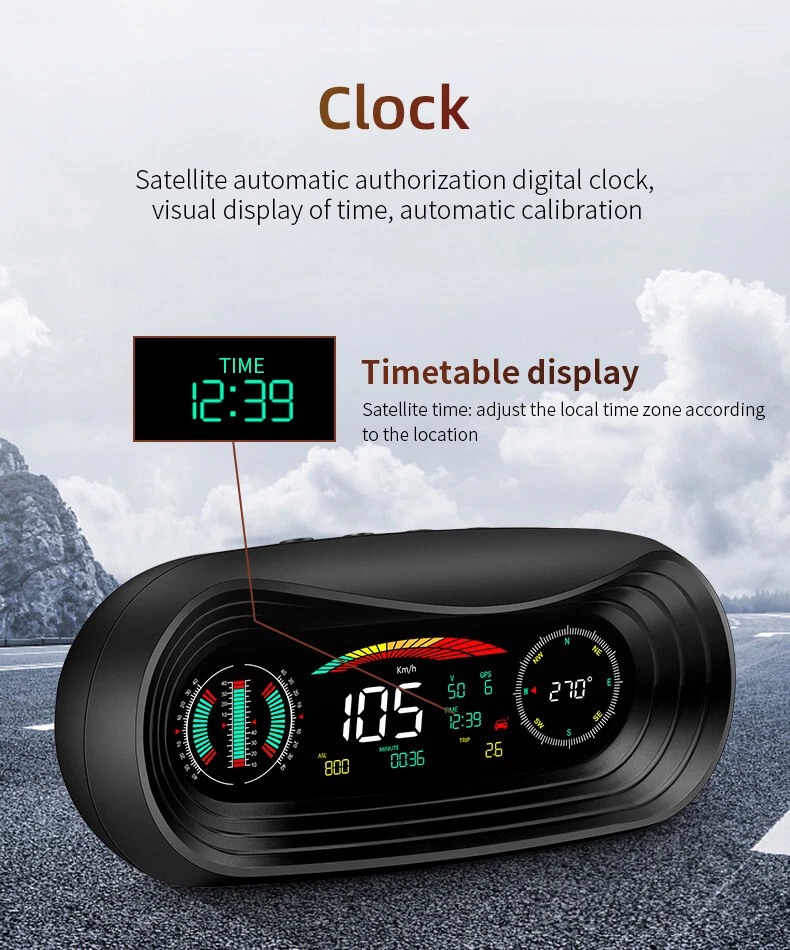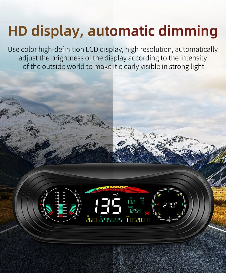 Product Description Car Compass HUD Head-Up Display Smart GPS Slope Meter Speedometer Overspeed Warning Gauge Digital Multi-Function Alarm Tool Add our listing to Watchlist Or Add to Cart , you will get more discount Main feature 1. Left tilt Slope meter 2. Front and rear Slope meter 3. Right Slope meter 4. Decorative icons 5. Voltage display 6. GPS number: flashing means searching for satellites, GPS light stops flashing and displays the number of satellites after the satellites are found 7.Driving direction: Driving direction indication:W=West, N=North, S=South, E=East when the vehicle speed >5KM / H (NW: Northwest NE: Northeast SW: Southwest SE: Southeast) 8. Altitude 9. Speed 10. Longitude display,driving time 11. The clock defaults to the UTC 8, and the time in the UTC 8 is displayed after the satellite signal is searched (adjust the local time zone according to the location) 12. Latitude display,mileage display 13. Fatigue driving icon, flashing reminder after accumulated driving for >4 hours 14. Compass direction scale Package included 1 x GPS Slope Meter 1 x Manual 1 x Suction cup holder 1 x Car Charger +USB cable Payment Returns Contact Us Shipping We accept payment by PayPal only ! Payment should be completed within 5 days after buyer places the order,or else an unpaid case will be opened in order to cancel the transaction. If you can not pay in time, please contact us. e-check from PayPal will only be processed once the payment clears. All of the items will be shipped to buyer's EBAY address,please confirm your address on Ebay before you buy.Your order will be usually shipped out the same or next business days once the payment is made and cleared. 30-day Warranty with Exchange for defective, malfunctioned, incorrect or parts-missing items. Please notify us and return the item with all parts and accessories packed and marked "FOR EXCHANGE" within 14 days of receipt. If defective, malfunctioned or parts-missing items are no longer available, a refund may be issued. All returning postage costs will be the responsibility of the buyers under all circumstances. If you encounter any problems about anything, please feel free to contact us and we will do our best to assist you solve the issue. If you are not satisfied in anyway, please feel free to let us know and give us a second chance to correct it before you decide to leave any neutral or negative feedback. Please contact us through eBay link if you have any questions. We will reply you within 24- 48 hours. Please check you spam mail if no response for 48 hours. All items will be checked before packing. All items are new and of high quality. Item will be shipped within 1 business days upon receipt of payment, excluding weekends and public holidays. If to USA,we will ship your order by USPS,it will take about 8-12 working days to you,and you can track it on line. If to other country,we will ship your order by China Post or Singapore Registered Air Mail,it will take about 14-21 working days to you,you aslo can track it on line. Delivery time is about 14-28 business days and it may take up to 8 weeks . Payment We accept payment by PayPal only ! Payment should be completed within 7 days after buyer places the order,or else an unpaid case will be opened in order to cancel the transaction. If you can not pay in time, please contact us. eCHECK from PayPal will only be processed once the payment clears. All of the items will be shipped to buyer's EBAY address,please confirm your address on Ebay before you buy.Your order will be usually shipped out the same or next business days once the payment is made and cleared. Returns 30-day Warranty with Exchange for defective, malfunctioned, incorrect or parts-missing items. Please notify us and return the item with all parts and accessories packed and marked "FOR EXCHANGE" within 14 days of receipt. If defective, malfunctioned or parts-missing items are no longer available, a refund may be issued. All returning postage costs will be the responsibility of the buyers under all circumstances. Contact Us If you encounter any problems about anything, please feel free to contact us and we will do our best to assist you solve the issue. If you are not satisfied in anyway, please feel free to let us know and give us a second chance to correct it before you decide to leave any neutral or negative feedback. Please contact us through eBay link if you have any questions. We will reply you within 24- 48 hours. Please check you spam mail if no response for 48 hours. Shipping All items will be checked before packing. All items are new and of high quality. Item will be shipped within 1 business days upon receipt of payment, excluding weekends and public holidays. If to USA,we will ship your order by USPS,it will take about 7-10 working days to you,and you can track it on line. If to other country,we will ship your order by China Post or Singapore Registered Air Mail,it will take about 14-21 working days to you,you aslo can track it on line. Delivery time is about 14-28 business days and it may take up to 8 weeks . Welcome to our Store ~