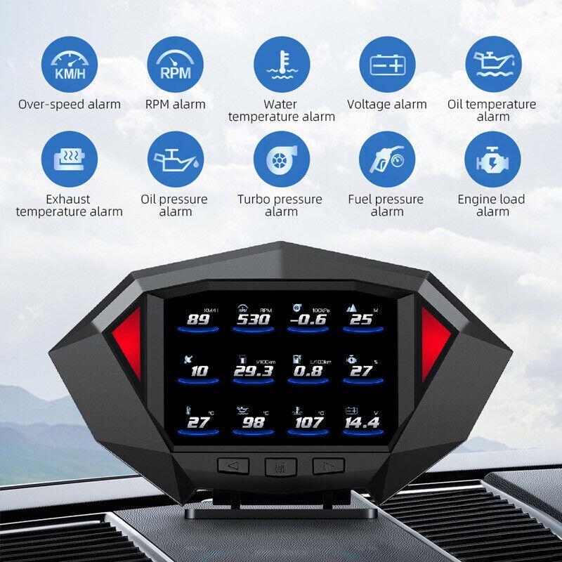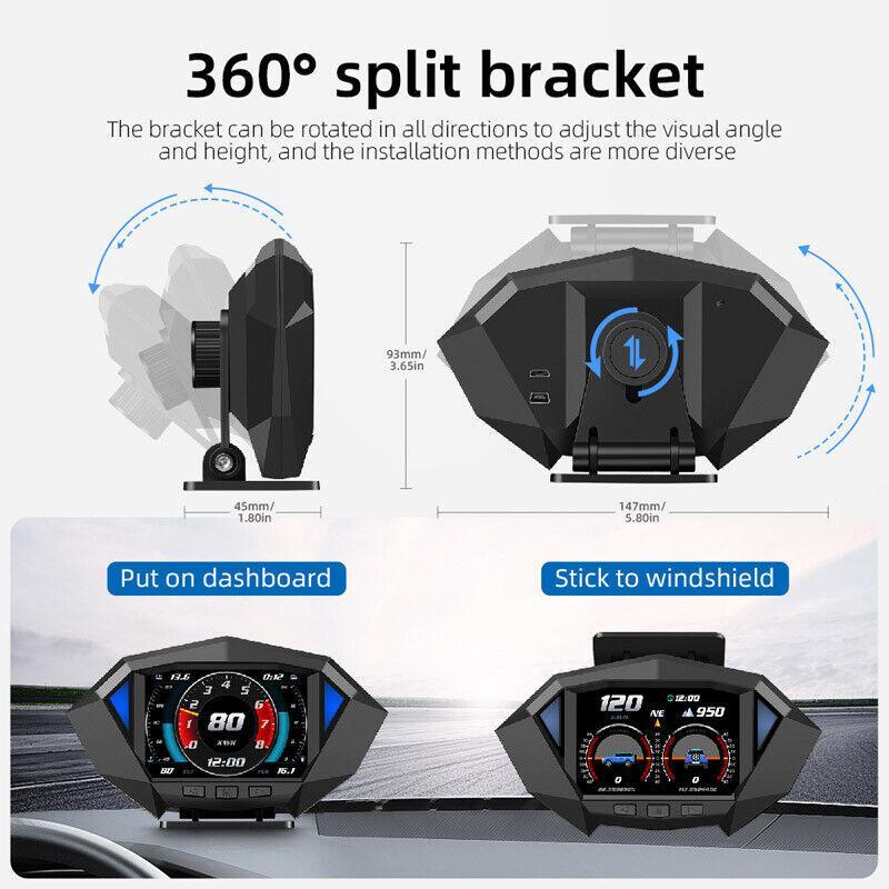 Car HUD Display with OBD GPS Clinometer Speed Voltage Temp Monitor