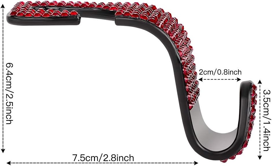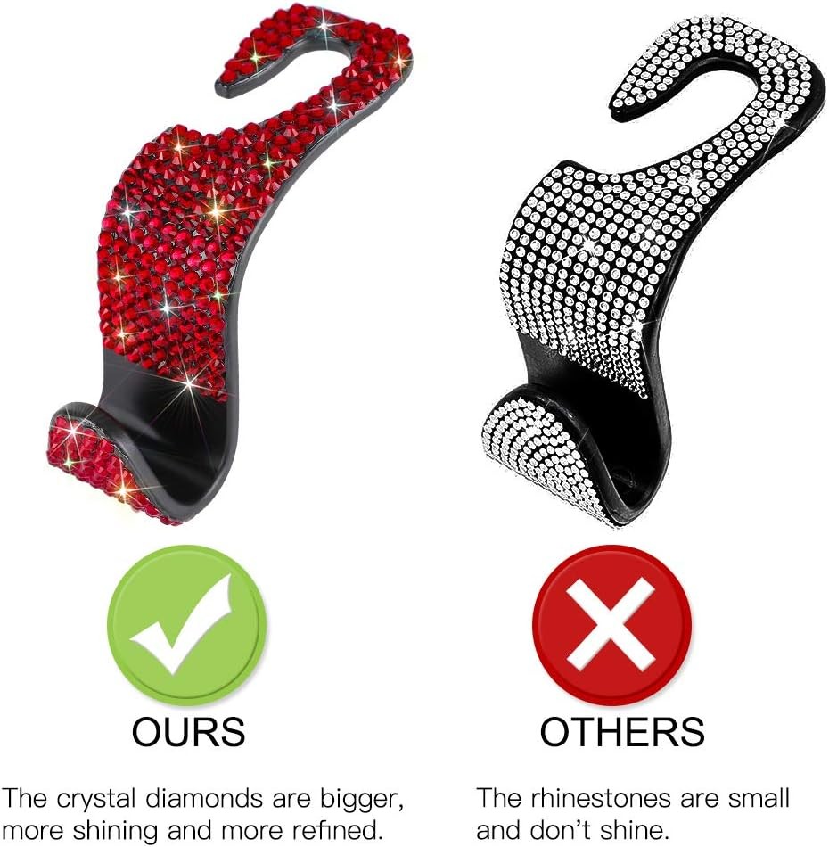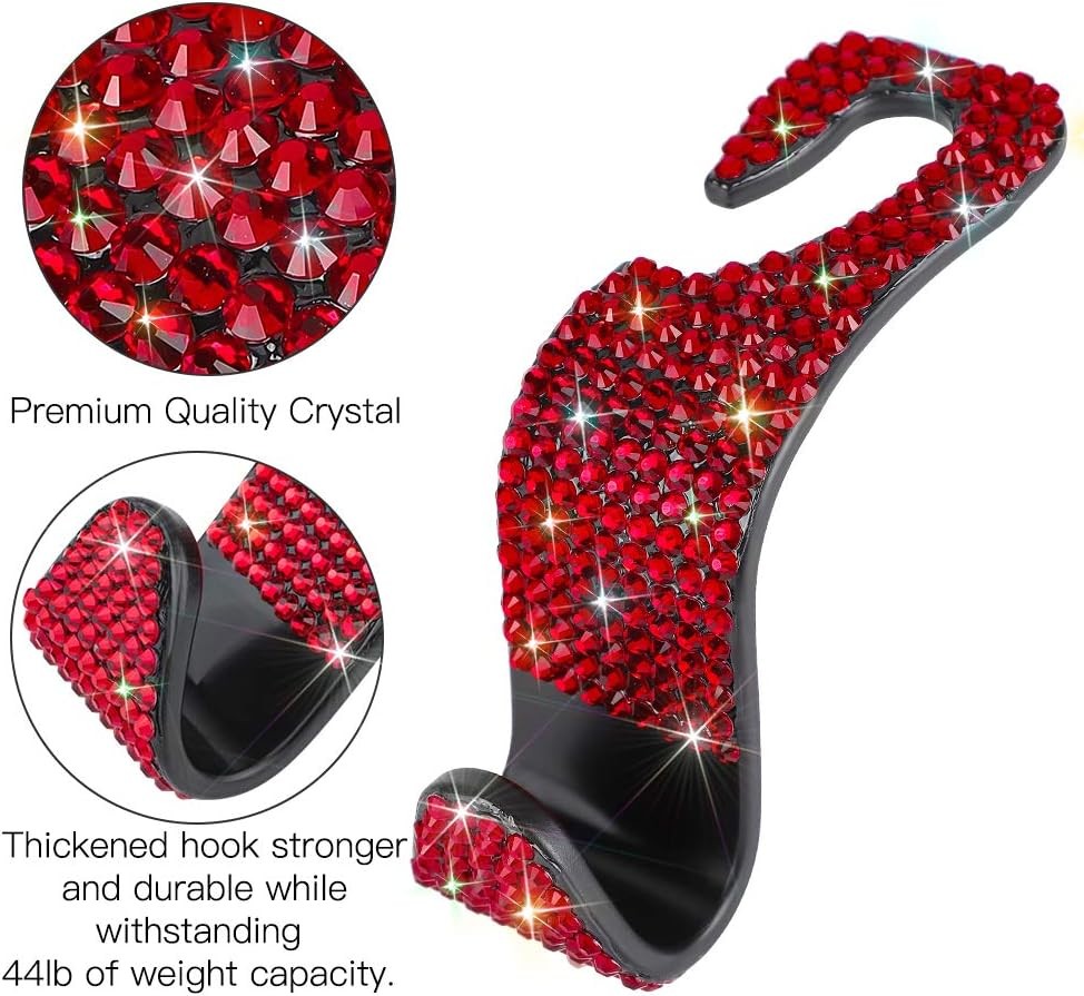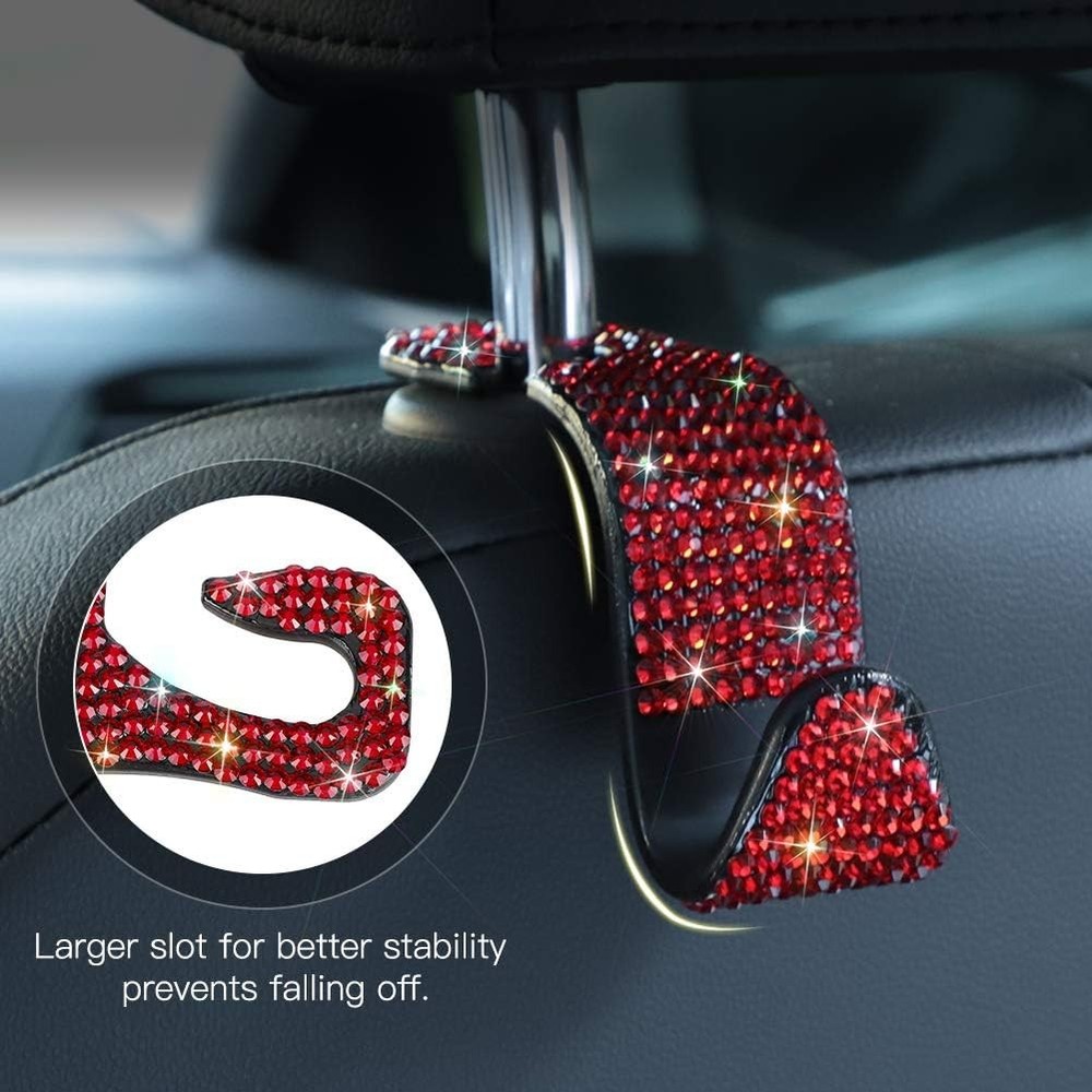 About this item 2 Pack bling car headrest hooks enhance your car's interior while providing a convenient storage solution. Transform your car's headrest into a stylish space to hang handbags, purses, schoolbags, water bottles, shopping bags, kid's toys, baby supplies and more. PURE HANDMADE - Each bling car seat hook features carefully selected premium crystals, distinct from standard rhinestone hooks. The sparkling crystals add elegance to your car as you travel. Crafted from eco-friendly PP material, these hooks are strong, durable, and resistant to cracking or breaking. The special half-open design allows for easy installation without removing the headrests or needing additional tools. Simply hook it onto the headrest posts for effortless use. Provides extra space to hang bags and purses, keeping your car organized. It frees up legroom and keeps your belongings upright, allowing for a more comfortable and enjoyable journey. UNIVERSAL - The luxurious bling crystal hook is versatile and fits most car seats, making it an ideal gift for yourself, family, and friends. Dimensions: 5.71 x 4.06 x 1.73 inches.