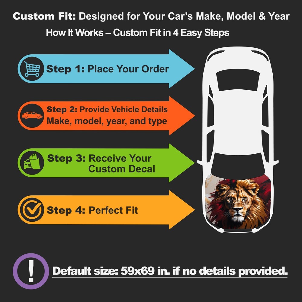 Car Hood Wrap Decal - Premium Vinyl Sticker for Any Vehicle Product Description Transform your car’s look with our premium Car Hood Wrap Decal. Crafted from top-tier polymeric vinyl, this sticker combines long-lasting quality with eye-catching style. Key Features: Custom Sizing: Share your car’s make, model, and year (e.g., sedan, SUV) for a perfect fit. Otherwise, we’ll send a default size of 59" x 69" (150 x 175 cm). Simple Installation: Equipped with Air Release technology for an easy, bubble-free application. Built to Last: Waterproof, weather-resistant, and laminated for up to 5 years of vibrant use. Superior Print Quality: Crisp, detailed graphics printed at 1440 dpi with eco-friendly solvent ink. Shipping Information Processing Time: Orders are prepared within 3-5 business days. Shipping Method: Shipped via express delivery with full tracking details. International Orders: Delivery typically takes 6-8 days, though customs may delay it up to 10 days. Buyers cover any applicable taxes or duties. Good News for U.S. Buyers This item ships via UPS Express with DDP (Delivered Duty Paid) service. All import duties and customs fees are prepaid by the seller. You won't be charged anything extra upon delivery - the total you pay on eBay is final. Terms & Conditions All Sales Final: Double-check your order before purchase. Exchanges: Available for defective or incorrect items. Contact us with evidence for assistance. Installation Tip: Professional application is advised for best results. Return Policy: No returns after 7 days from delivery. Reach out before returning items, especially if damaged.