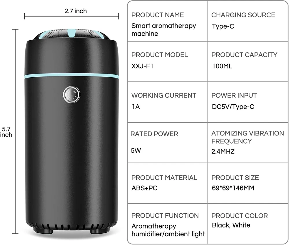 Smart Car Air Freshener Diffuser: Car diffusers for essential oils humidifier features a silent operation, 7 LED light colors, safety auto switch to prevent it from over heating in case it runs out of water Car Humidifier 100 ML: Car humidifier is equipped with an upgraded fan to expand and increase the mist coverage. Car Diffuser Humidifier has 2 mist modes Lightweight Compact: This Car Humidifier Diffuser, Car cup design, delicate, you can be convenient to use and carry, strong ability to produce cold fog with aroma, humidified fresh air on the road Mini car air freshener diffuser: Car Diffusers for essential oils with Cool Mist Humidification technology; even and continuous aromatherapy spray that keeps fresh, long-lasting fragrance experience Car Diffuser: With millions of units sold every year, this car diffusers for essential oils; Aroma diffuser; car humidifier is an exquisite car room accessory for mom, dad, wife Product Description Aroma Diffuser Add water and 1-3 drops of essential oil to quickly create an ultra-fine/smooth, even aromatherapy mist. WARM TIP: Please purchase your favorite essential oils separately. Humidifier Mini cute humidifier . Ultrasonic cool mist technology humidifies the space to provide a comfortable and moist environment. Air Freshener Ultrasonic nano spray technology can effectively reduce air drying and generate a large number of negative ions, safe and clean. If you add essential oils, you can also achieve odor removal and deodorization effects. Don't tilt. After filling this product with liquid, it is prohibited totilt or stand upside down; To avoid liquid overflow. Steps To Use Aromatherapy Diffuser Humidifier 1. Open the upper cover of the water tank clockwise. Add water to the water tank water. 2. When adding water, be careful not to exceed the maximum water level marked by MAX. 3. Fill up with water and add two drops of aromatherapy oil. 4. Insert the power cord and turn the switch on. No need to add swabs for use Packing List: 1x USB Diffuser Humidifier 1x TYPE-C USB Cable(No adapter included) 1x User Manual TYPE-C USB DESIGN Applicable USB interface USB Adapter PC/Laptop Mobile Power Car Cigarette Lighter Click once to open a continuous spray, and RGB light has a 7-color gradient. Click again. ntermittent spray for 30 seconds and 15 seconds. Colorful gradient. Click again, and the buzzer beeps twice when the power off button ls pressed fog and light areturned off at oncel. In a water shortage state, the red light flashes 5 times and automatically shuts down. Friendly Reminder This product does not have a built-in battery and cannot be used wirelessly. Please add water before using this product. It is forbidden to use the humidification function if there is a lack of water. This product can add a small amount of essential oil. It is recommended to use water-soluble essential oil and add it to the water tank. The water addition capacity must not exceed the maximum water level which will not produce a spray or small mist. The spray of this product is equipped with an automatic shut-off function and the product will automatically stop spraying in case of water shortage. When cleaning the product, do not rinse directly from a tap to avoid the possibility of product short circuits. Wipe with a soft cotton cloth. Parameter Product Size 2.7inch Diameter X 5.7inch High Product Weight 180g(6.4ounces) Power Input DC=5V/Type-C Working Power/Working current 5W/1A Spray Size 20~25ML/H Tank capacity About 100ml/3.4oz Main Materials PP,ABS Product Standard 1x USB Diffuser Humidifier, 1x TYPE-C USB Cable(No adapter included), 1x User Manual