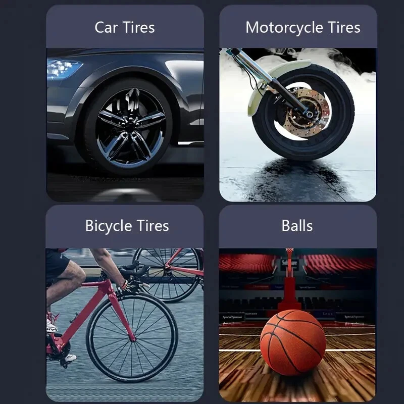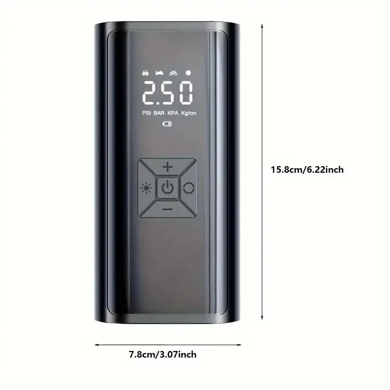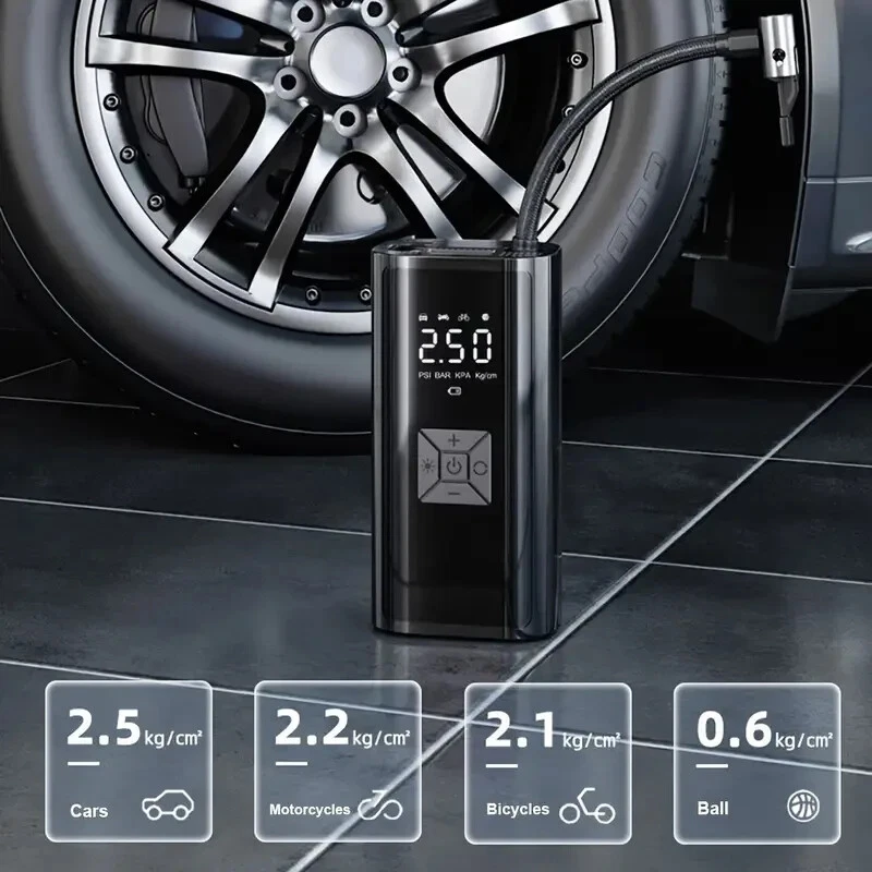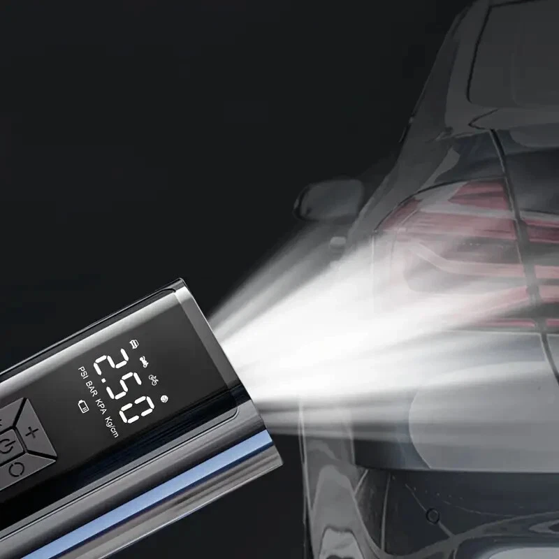 High-Power Portable Car Tire Inflator with Auto-Stop & LED Light - Fast, Convenient, Compact Automotive Air Compressor for Quick Inflation This portable car inflator is a must-have for every driver. With its wireless and cordless design, it can easily inflate your car's tires without the need for a professional mechanic. The digital display ensures accurate pressure readings, making it easy to inflate your tires to the perfect pressure. This air pump is designed for recharging (USB) and is 12V and 120 Watts of Power along with up to 150psi. It is available in a sleek black color and is highly portable, making it easy to carry around with you wherever you go. Whether you need to inflate your tires at home or on the go, this portable car inflator is the perfect solution. This product also charges electronic products such as mobile phones and tablets. Highly Rated (4.8 Stars) product