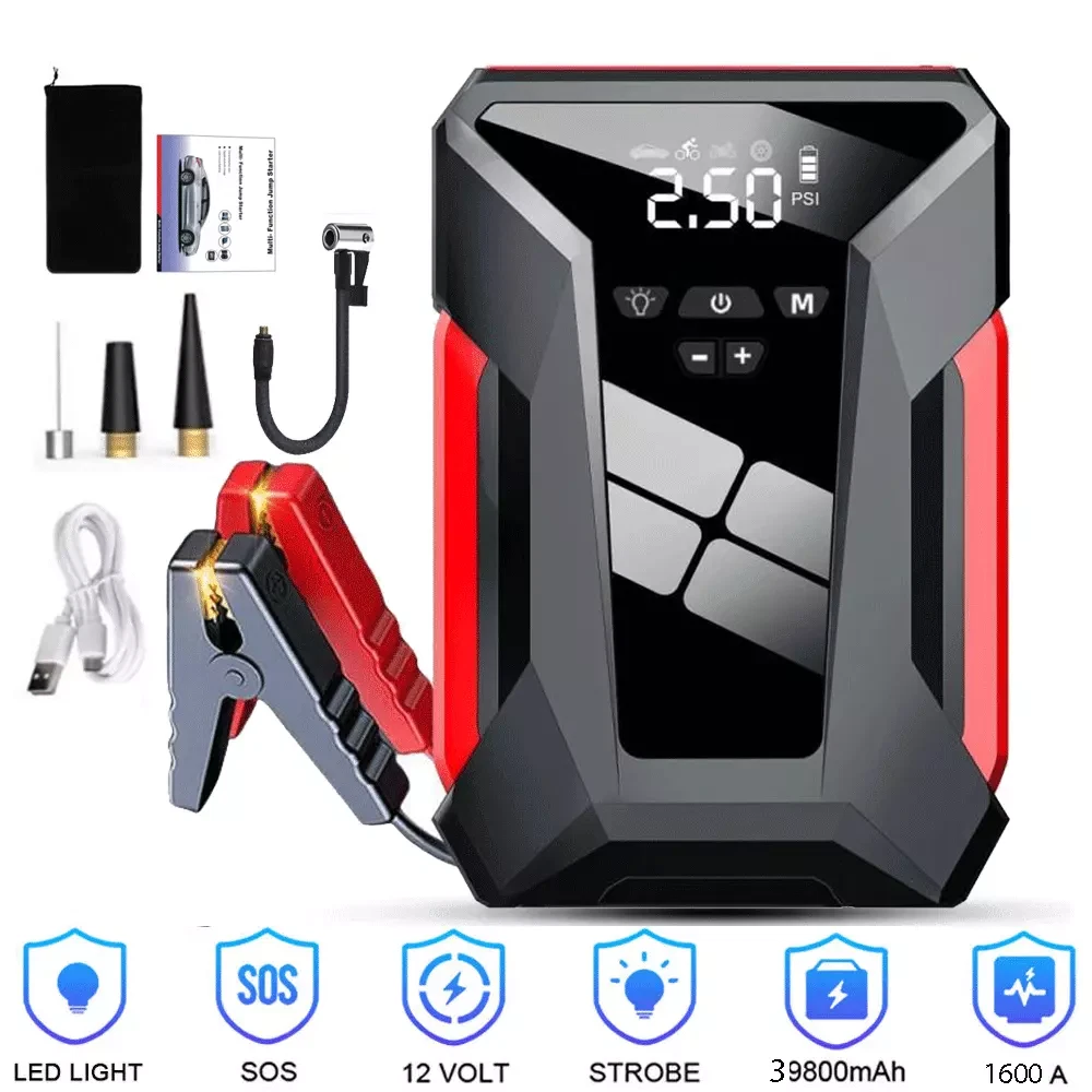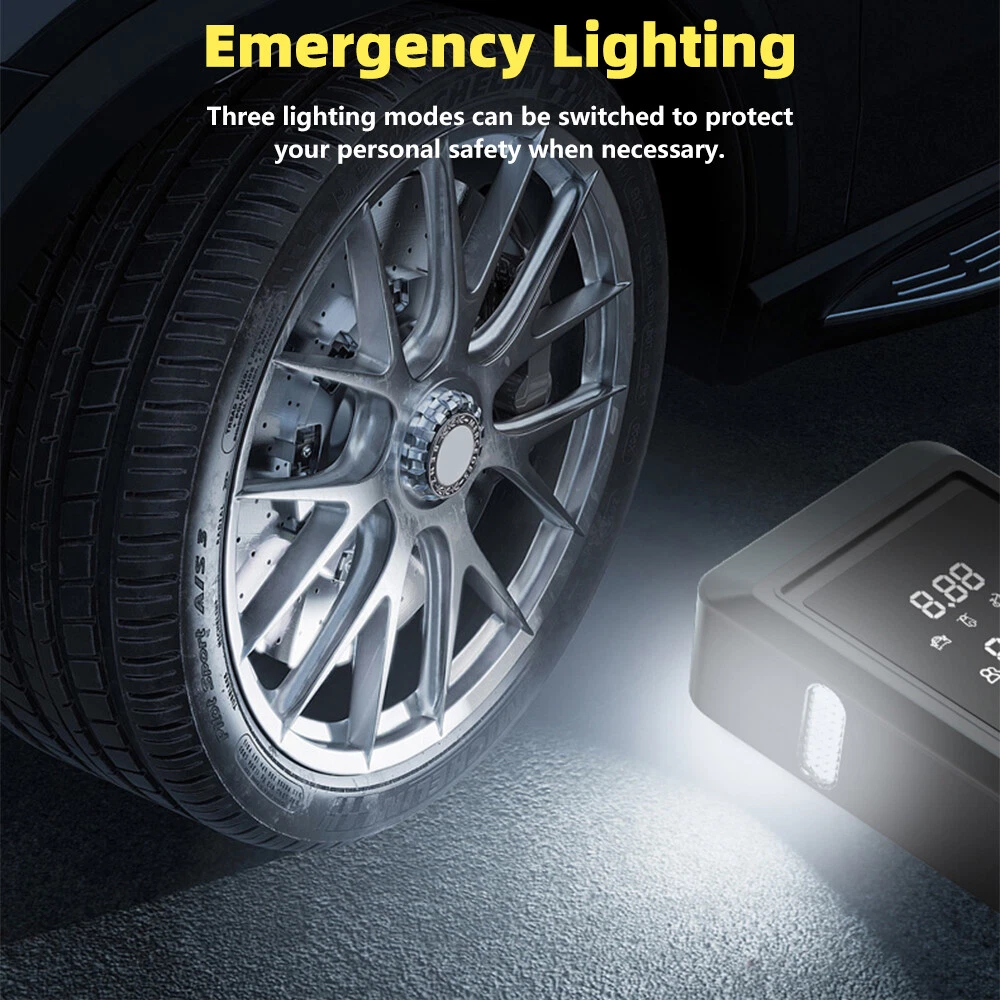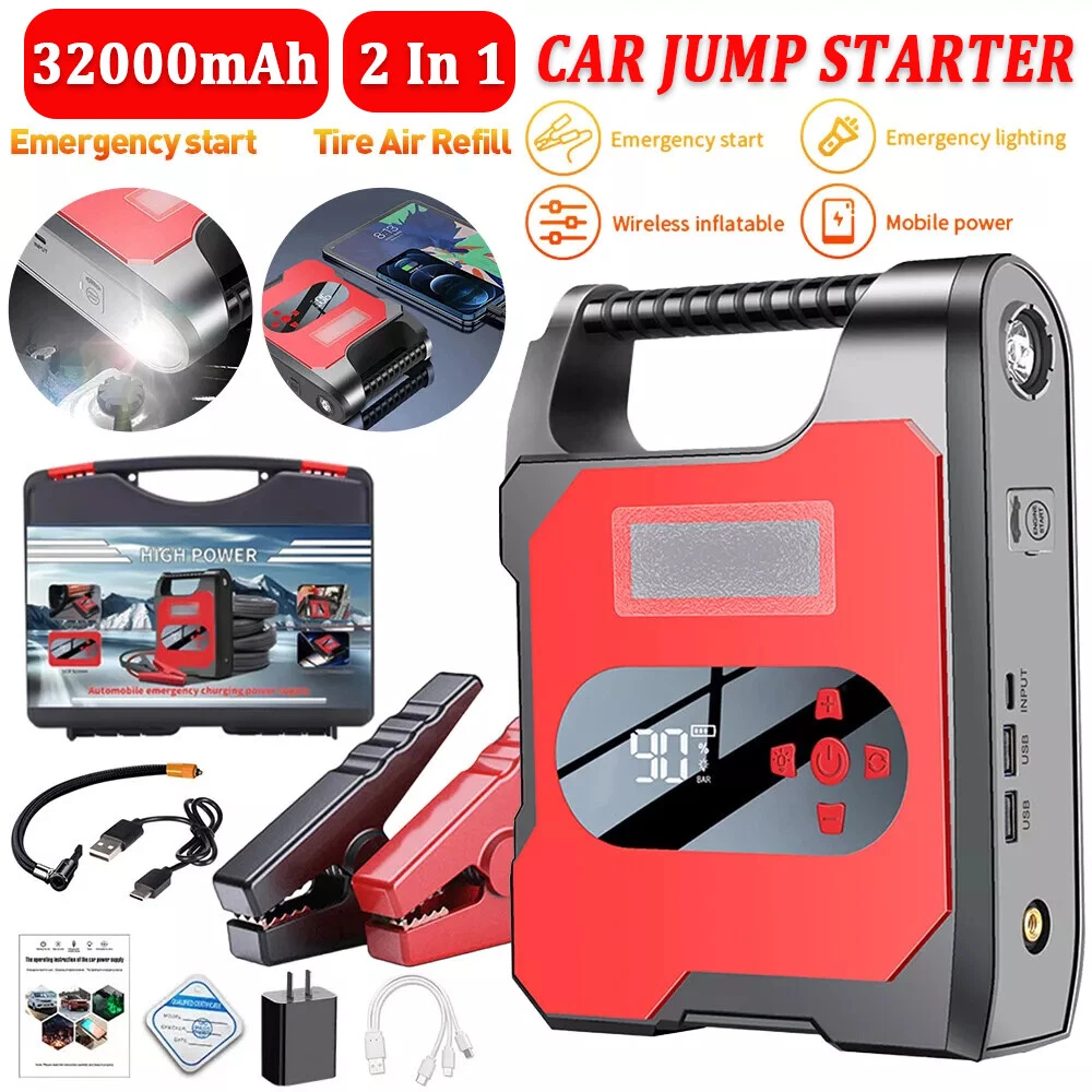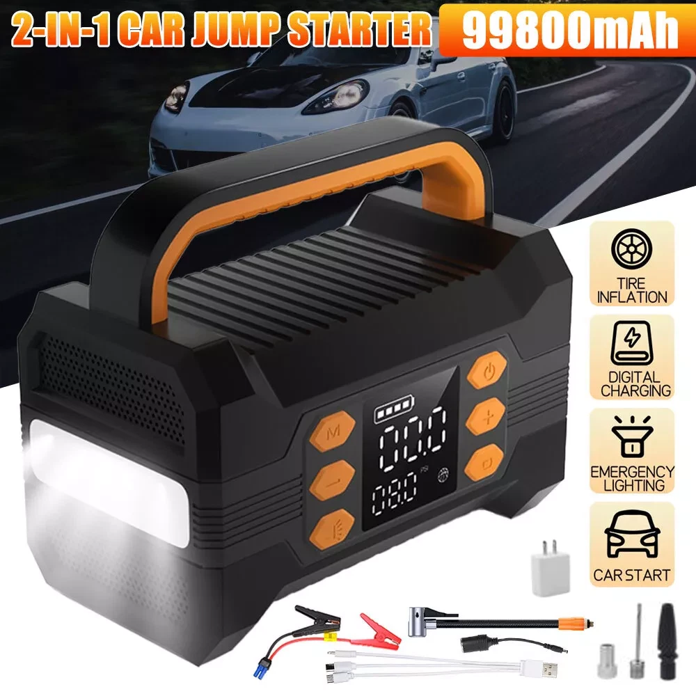 Car Jump Starter Jumper Power Bank 99800mAh Battery LCD Display Tire inflator US Item Description 32000mAh Jump Starter&Air Compressor Specifications: Capacity: 32000 mAh Charging Time: 4 hours Interface Type: 2USB Input Voltage: 5V Adapted Model: 12V Protection Type: Intelligent Protection Working Temperature:-40 ~ 80. Cycle Times: 3000 times Overall Dimensions: 22*17*6cm Starting Current: 1000A. Peak Current: 2000A Additional Functions: Mobile Phone Charging, Lighting, Battery Clip. Output Voltage: 12V Display Mode: Digital Display Suitable Car Series: 12V, ≤6.0L gasoline and ≤2.0L diesel vehicle. Product advantages: Large peak current can start 12V gasoline and diesel vehicles. The product has 5V/2.1A*2, 12V-16.8V=3A output port, which can be used for charging mobile phones, MP3/MP4, PSP, cameras and other electronic products. Automobile tire pump, and other 12V equipment for power supply. LED light (lighting, flashing, emergency help) The main components of the product are high-end imported chips, which have strong stability and strong startup. Equipped with intelligent battery clip, it is safer to use. The product adopts imported material shell, which increases the safety performance. Power supply has passed CE, quality inspection report and MSDS. Package includes: 1 x Car Jump Starter 1 x USB Charge Cable 1 x Battery Clip 3 x Gas Nozzle 1 x US Plug 1 x Phone Charging Cable 1 x Storage Box 1 x User Manual A-99800mAh Jump Starter&Air Compressor Features: 8-IN-1 JUMP STARTER: Not only is it a car jump starter, it can also be used as a pump, portable battery pack, emergency LED light with 3 modes (flashlight, SOS, strobe) and power bank to charge mobile phones, tablets and other USB devices. hard press power button 3 seconds to turn on. HIGH POWER BOOSTER: The car battery charger with a 1600A peak current, can start the 12V vehicles up to 10L Gas or 8.5L Diesel engines. The powerful battery booster works even in extreme temperatures. Suitable for car, truck, motorcycle, boat, RV or tractor and so on. INFLATION FUNCTION: The car battery jump starter is equipped with tire inflation and 3 types nozzles, supporting 3 optional units (PSI, BAR, KPA), which can inflate various tires and balls. In addition, there are smart screen and tire pressure detection function. EMERGENCY LED LIGHT: The jump starter battery pack features 3 LED light modes. First of all, it can be used as a flashlight, which is very bright and lasts long time. Secondly, when you need rescue for survival, turn on SOS and strobe mode. Ideal for camping and long drives. PROTABLE POWER BANK: The car battery starter capacity is very large and can charge for phone, laptop, camera and all USB digital devices. Apart from that, charging is very fast and it is very convenient to use, just long press the power button and plug in the USB data cable. SAFETY PROTECTION: The upgraded jumper cable adds a smart chip, so you don't have to worry about connecting the wrong positive and negative poles of the car battery, or short circuits and sparks. It is very safe and can be connected to any car below 12V. WHAT YOU WILL GET: You will get 1 X jump starter with air compressor, 1 X smart jumper cable, 1 X type-c cable, 1 X carrying bag, 1 X pump tube, 3 X air nozzle(note:pump tube and air nozzle in the top side storage area of the jump starter), 1 X user manual. If you have any after-sales questions about jump starter, please feel free to contact us B-99800mAh Jump Starter&Air Compressor Feat ures : 1. Emergency Power Supply & Air Pump Integration: This device combines an emergency power supply with an air pump, allowing for instant power recovery and rapid tire inflation during emergencies. 2. Four-in-One Functionality: Equipped with four major functions - tire inflation, vehicle starting, digital charging, and emergency lighting - providing comprehensive support for various roadside situations. 3. Smart Anti-reverse Battery Clamp: Featuring a smart anti-reverse battery clamp with 12 layers of safety protection, ensuring safe and secure operation during use. 4. Real-time Monitoring & Intelligent Display: The device offers real-time monitoring and intelligent digital display, providing clear and accurate tire pressure status at a glance, with an error value of ≤0.05Bar. 5. Cold Weather Resilience: Capable of starting without pressure in temperatures as low as -20°C, making it resistant to freezing and ideal for use in cold weather conditions. 6. Emergency Lighting: Offers three lighting modes for emergency illumination, providing added safety and visibility during roadside emergencies. 7. Simple Operation: Easy-to-follow operation steps - connect, clamp, ignite, and remove - ensuring hassle-free usage for users of all levels. Specifica tions : - Charging Input Voltage: 5V - Working Voltage: 14.8V - Maximum Power Consumption: 60W - Maximum Current: <6A - Start-up Current: <300A - Maximum Inflation Flow Rate: 25L/min - Battery Capacity: 99800mAh - Suitable Displacement: Gasoline vehicles up to 5.0L, diesel vehicles up to 4.0L - LED Brightness: 20LM - Maximum Inflation Pressure: 150PSI - Measurement Accuracy: ±1.5PSI - Pressure Units: PSI, KPA, KG/c㎡ - External Hose Length: 100MM±10MM - Operating Temperature: -30℃~60℃ - Product Dimensions: 20*8.75*4.3cm Package Contents: 1 x Main Unit 1 x Battery Clamp 1 x Air Hose 1 x Accessory Pack 1 x Charging Cable 1 x Cloth Bag 1 x User Manual C-99800mAh Jump Starter&Air Compressor Features: 1. Emergency Power Supply & Air Pump Integration: This device combines an emergency power supply with an air pump, allowing for instant power recovery and rapid tire inflation during emergencies. 2. Four-in-One Functionality: Equipped with four major functions - tire inflation, vehicle starting, digital charging, and emergency lighting - providing comprehensive support for various roadside situations. 3. Real-time Monitoring & Intelligent Display: The device offers real-time monitoring and intelligent digit