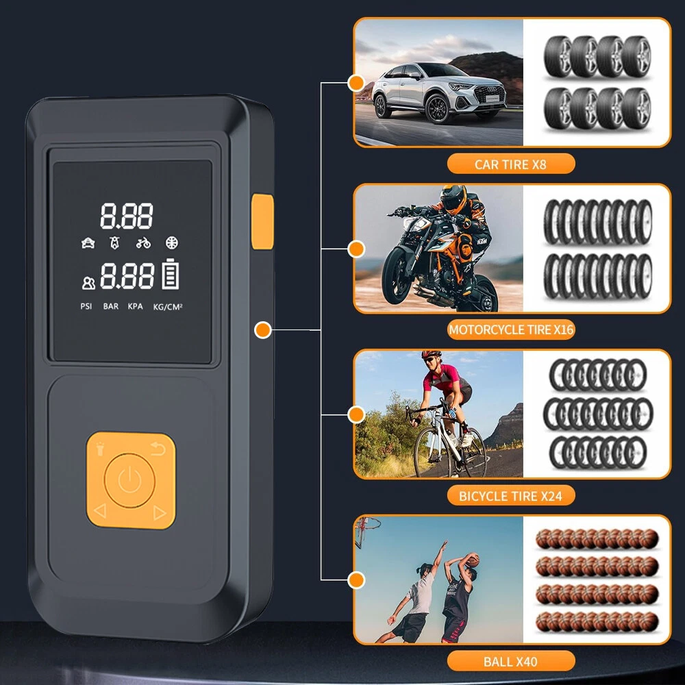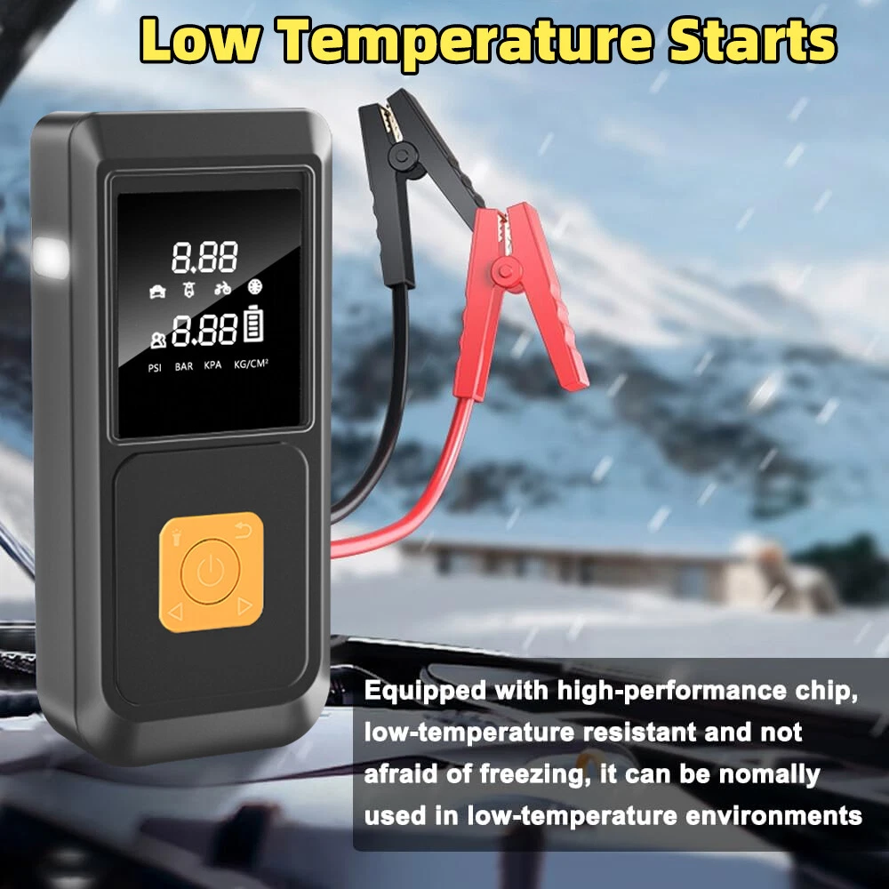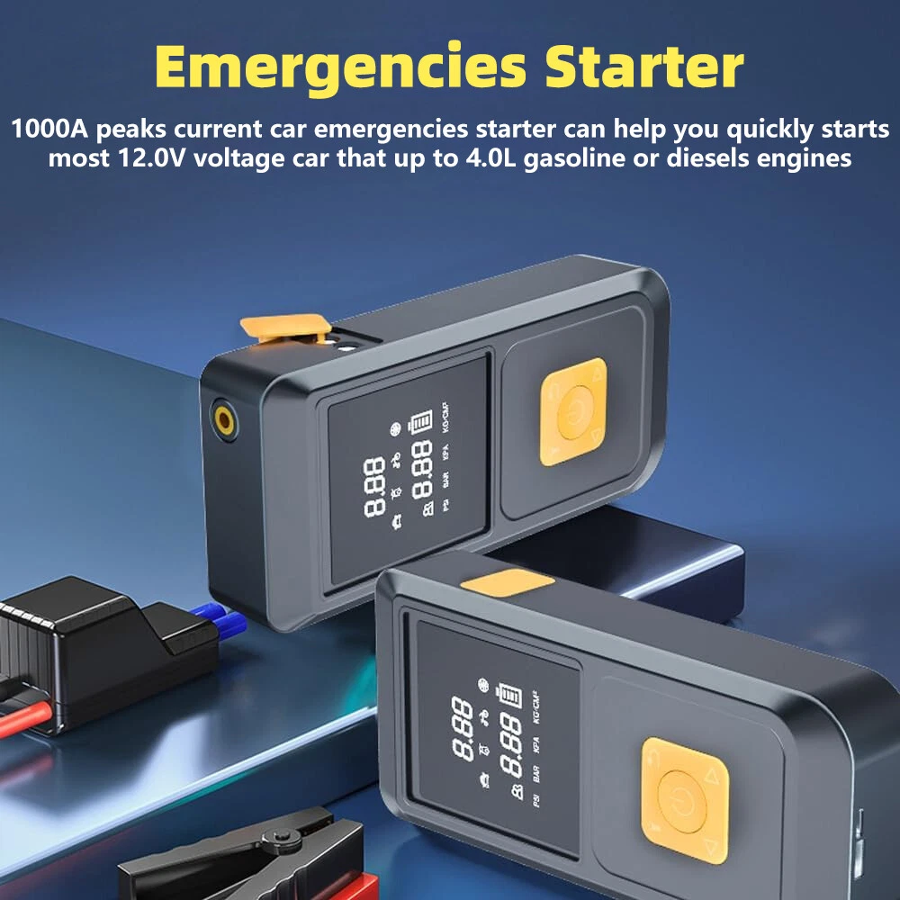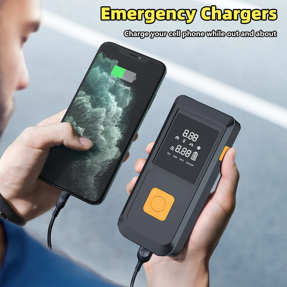 Car Jump Starter Jumper Power Bank 99800mAh Battery LCD Display Tire inflator US Item Description 32000mAh Jump Starter&Air Compressor Specifications: Capacity: 32000 mAh Charging Time: 4 hours Interface Type: 2USB Input Voltage: 5V Adapted Model: 12V Protection Type: Intelligent Protection Working Temperature:-40 ~ 80. Cycle Times: 3000 times Overall Dimensions: 22*17*6cm Starting Current: 1000A. Peak Current: 2000A Additional Functions: Mobile Phone Charging, Lighting, Battery Clip. Output Voltage: 12V Display Mode: Digital Display Suitable Car Series: 12V, ≤6.0L gasoline and ≤2.0L diesel vehicle. Product advantages: Large peak current can start 12V gasoline and diesel vehicles. The product has 5V/2.1A*2, 12V-16.8V=3A output port, which can be used for charging mobile phones, MP3/MP4, PSP, cameras and other electronic products. Automobile tire pump, and other 12V equipment for power supply. LED light (lighting, flashing, emergency help) The main components of the product are high-end imported chips, which have strong stability and strong startup. Equipped with intelligent battery clip, it is safer to use. The product adopts imported material shell, which increases the safety performance. Power supply has passed CE, quality inspection report and MSDS. Package includes: 1 x Car Jump Starter 1 x USB Charge Cable 1 x Battery Clip 3 x Gas Nozzle 1 x US Plug 1 x Phone Charging Cable 1 x Storage Box 1 x User Manual A-99800mAh Jump Starter&Air Compressor Features: 8-IN-1 JUMP STARTER: Not only is it a car jump starter, it can also be used as a pump, portable battery pack, emergency LED light with 3 modes (flashlight, SOS, strobe) and power bank to charge mobile phones, tablets and other USB devices. hard press power button 3 seconds to turn on. HIGH POWER BOOSTER: The car battery charger with a 1600A peak current, can start the 12V vehicles up to 10L Gas or 8.5L Diesel engines. The powerful battery booster works even in extreme temperatures. Suitable for car, truck, motorcycle, boat, RV or tractor and so on. INFLATION FUNCTION: The car battery jump starter is equipped with tire inflation and 3 types nozzles, supporting 3 optional units (PSI, BAR, KPA), which can inflate various tires and balls. In addition, there are smart screen and tire pressure detection function. EMERGENCY LED LIGHT: The jump starter battery pack features 3 LED light modes. First of all, it can be used as a flashlight, which is very bright and lasts long time. Secondly, when you need rescue for survival, turn on SOS and strobe mode. Ideal for camping and long drives. PROTABLE POWER BANK: The car battery starter capacity is very large and can charge for phone, laptop, camera and all USB digital devices. Apart from that, charging is very fast and it is very convenient to use, just long press the power button and plug in the USB data cable. SAFETY PROTECTION: The upgraded jumper cable adds a smart chip, so you don't have to worry about connecting the wrong positive and negative poles of the car battery, or short circuits and sparks. It is very safe and can be connected to any car below 12V. WHAT YOU WILL GET: You will get 1 X jump starter with air compressor, 1 X smart jumper cable, 1 X type-c cable, 1 X carrying bag, 1 X pump tube, 3 X air nozzle(note:pump tube and air nozzle in the top side storage area of the jump starter), 1 X user manual. If you have any after-sales questions about jump starter, please feel free to contact us B-99800mAh Jump Starter&Air Compressor Feat ures : 1. Emergency Power Supply & Air Pump Integration: This device combines an emergency power supply with an air pump, allowing for instant power recovery and rapid tire inflation during emergencies. 2. Four-in-One Functionality: Equipped with four major functions - tire inflation, vehicle starting, digital charging, and emergency lighting - providing comprehensive support for various roadside situations. 3. Smart Anti-reverse Battery Clamp: Featuring a smart anti-reverse battery clamp with 12 layers of safety protection, ensuring safe and secure operation during use. 4. Real-time Monitoring & Intelligent Display: The device offers real-time monitoring and intelligent digital display, providing clear and accurate tire pressure status at a glance, with an error value of ≤0.05Bar. 5. Cold Weather Resilience: Capable of starting without pressure in temperatures as low as -20°C, making it resistant to freezing and ideal for use in cold weather conditions. 6. Emergency Lighting: Offers three lighting modes for emergency illumination, providing added safety and visibility during roadside emergencies. 7. Simple Operation: Easy-to-follow operation steps - connect, clamp, ignite, and remove - ensuring hassle-free usage for users of all levels. Specifica tions : - Charging Input Voltage: 5V - Working Voltage: 14.8V - Maximum Power Consumption: 60W - Maximum Current: <6A - Start-up Current: <300A - Maximum Inflation Flow Rate: 25L/min - Battery Capacity: 99800mAh - Suitable Displacement: Gasoline vehicles up to 5.0L, diesel vehicles up to 4.0L - LED Brightness: 20LM - Maximum Inflation Pressure: 150PSI - Measurement Accuracy: ±1.5PSI - Pressure Units: PSI, KPA, KG/c㎡ - External Hose Length: 100MM±10MM - Operating Temperature: -30℃~60℃ - Product Dimensions: 20*8.75*4.3cm Package Contents: 1 x Main Unit 1 x Battery Clamp 1 x Air Hose 1 x Accessory Pack 1 x Charging Cable 1 x Cloth Bag 1 x User Manual C-99800mAh Jump Starter&Air Compressor Features: 1. Emergency Power Supply & Air Pump Integration: This device combines an emergency power supply with an air pump, allowing for instant power recovery and rapid tire inflation during emergencies. 2. Four-in-One Functionality: Equipped with four major functions - tire inflation, vehicle starting, digital charging, and emergency lighting - providing comprehensive support for various roadside situations. 3. Real-time Monitoring & Intelligent Display: The device offers real-time monitoring and intelligent digit
