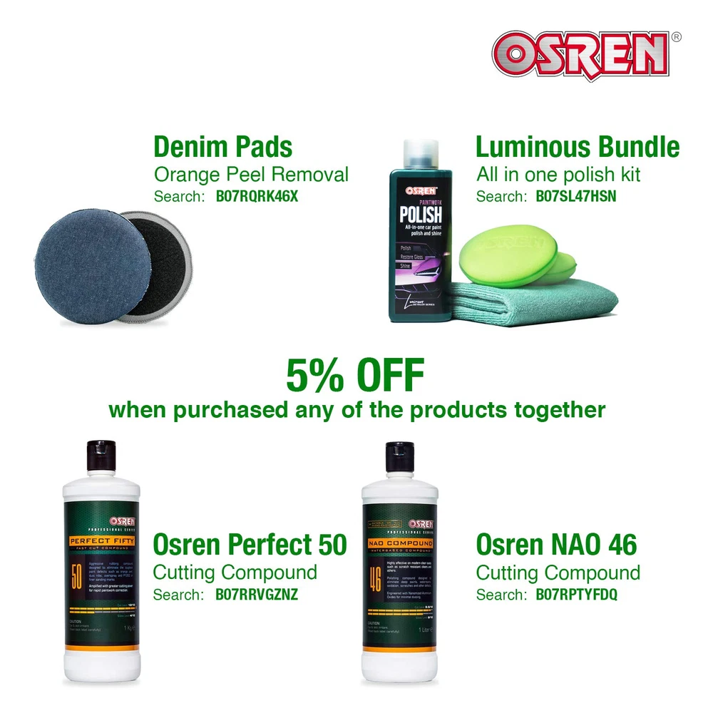 Menu Other Items Feedbacks About Us Contact Us Add To Favorites Car Polish NAO 46 (34 Oz) Waterbased High Cutting Compound Removes Deep Swirls, Scratches Etchings, Oxidation and Other Tough Defects Removes watermarks, deep swirls, scratches, etchings, and other tough defects Water-based formulation Contains no silicone Suitable for rotary and dual action polisher Pairable with all types of pads including wool, microfibre and foam pads Product Description Why Osren? We are a company that dedicates our best to offer auto detailing products that clean, shine and protect every possible surface of a car. Our passion is to drive a clean and shiny car everyday and we want to share what we love with you! What gives us an edge over the others in this trade for more than 15 years is simply because works on research and development to deliver better products have never tire us. We constantly strive to introduce new, if not better products that benefits professionals and car owners alike. We believe that there will always be something simpler yet more effective. Top Products Premium Denim Pad Pioneered and designed specially by Osren. Osren’s Denim Pad is designed as a coarse and sturdy pad for orange peel leveling. Capable of consistently suspending the abrasives between paint and pad to provide even shaving. In addition, Its unique design prevents the pad from conforming with the hilly/wavy texture of the paint and results in a uniformed leveling that’s unprecedented compared to conventional pads. Professional Detailing - Perfect 50 Paint shines the most when reflection of lights are even and uniform (A phenomenon know as orange peel). Osren Perfect 50 applies the same approach when it comes to leveling the surface by abrading the uneven surface. Usage of Osren Perfect 50 and Denim pad greatly reduces time required compared to conventional sanding method. Professional Detailing - NAO46 Compound Osren NAO46 Compound rapidly removes defects such as scratches, machine swirls, marrings and waterspots on paint. Versatile on both rotary polisher and dual action polisher. Formulated with zero silicone to ensure defects paint can be observed during polishing process. To be used together with Perfect 50 and Denim Pads. Starters Luminous paintwork polish is formulated to deep clean, polish and wax in one step! The versatile formulation is user-friendly and does not require elbow grease to restore your car’s shine. Removes light scratches and leaves behind a high-gloss wax finish on your paintwork. Item Specification Material Wool Grit Material Wool Item Weight 34 Ounces Package Dimensions 10.16 x 3.27 x 3.23 inches; 2.13 Pounds Dimensions Shipping Returns Additional Info Product Dimensions: 3.27 inches x 10.16 inches x 3.23 inches. Weight: 34.0 oz Fast shipping is very important for us. Our standard shipping service is FREE. Your order will be shipped within 1-3 business days upon full payment received. Most items are delivered within 3-5 business days, however, please allow 3-10 business days. We are shipping only to USA. We only ship to the confirmed Paypal address. We reserve the right to cancel any order for any reason at any time. We are not responsible for undeliverable addresses. We offer a 30 day return policy from checkout winning date. Your satisfaction is guaranteed! If for any reason you are unhappy with your item, just return it within 30 days for a full refund, minus shipping cost. Please contact us prior to initiating a return so that we can issue you a refund authorization. Items defective upon receipt must be packaged in their retail packaging as if new and returned with a detailed description of the problem. Return shipping fees are not refundable. We reserve the right to decline any returns if the above guidelines are not followed. All of our items, unless otherwise stated, will only run on 120 volts. Please check to make sure your country complies with these specifications. If you have a problem or question regarding your transaction please contact us before leaving any type of feedback. We will work with you to resolve any problem you may have.