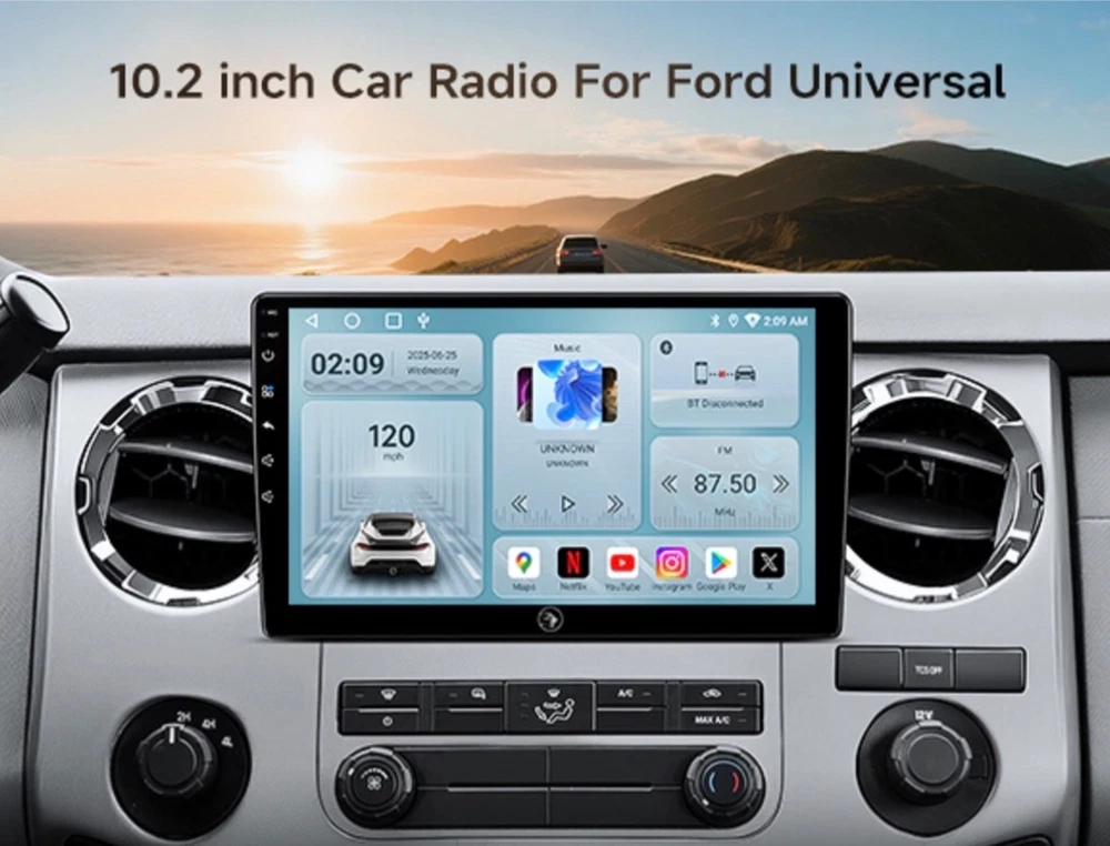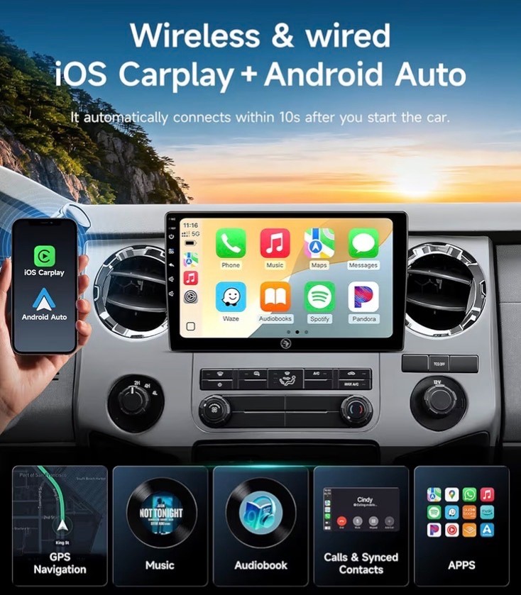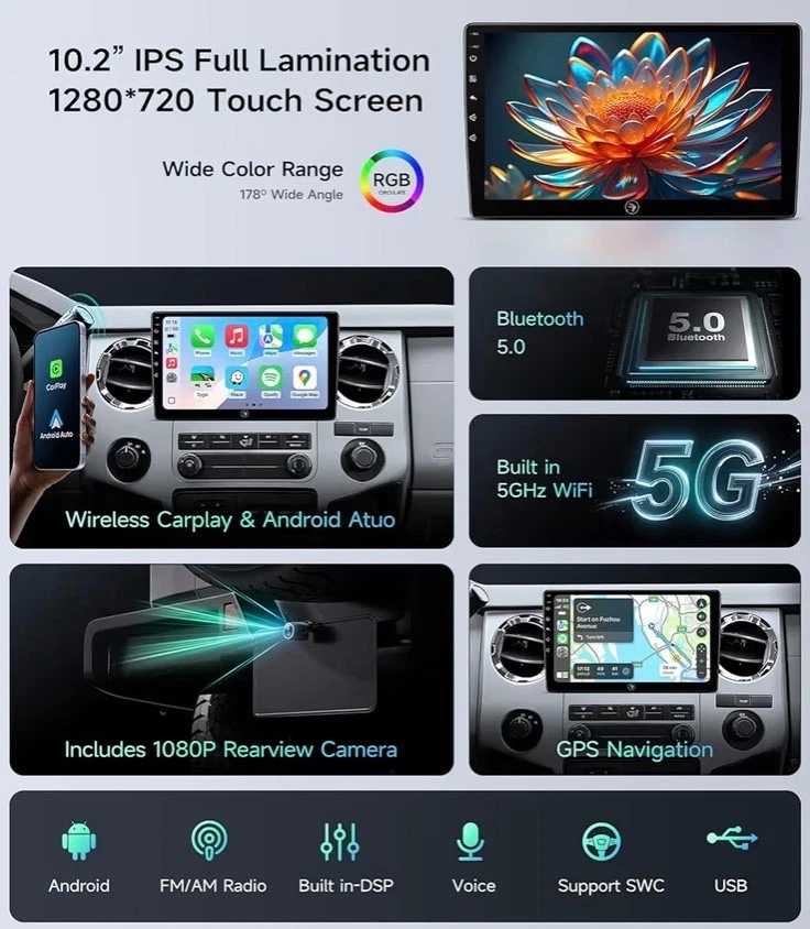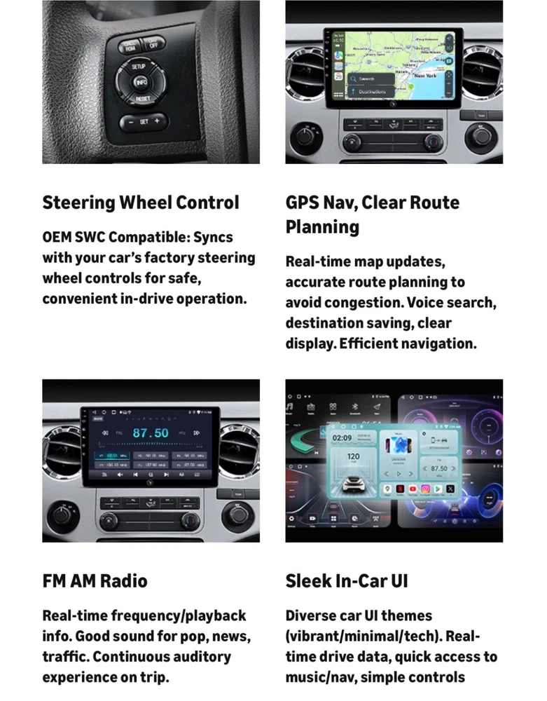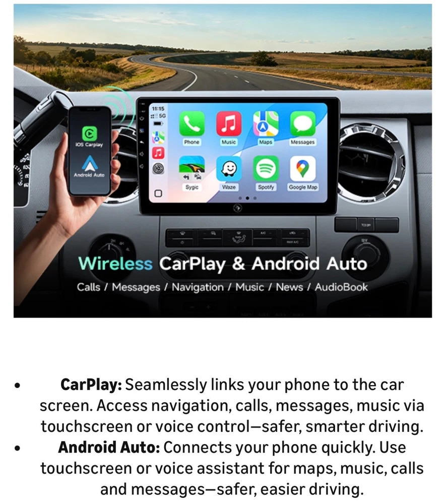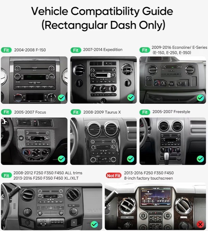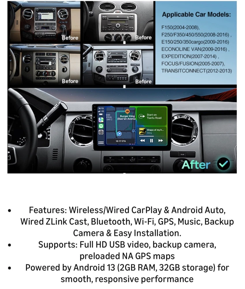 #3503 10” Car Radio Stereo for Ford F150 (2004-2008), F250/F350/F450/F550 (2008-2016), E150/E250/E350/Econoline Van (2009-2016), Focus/Fusion (2005-2007) WiFi/Wireless CarPlay/Android Auto, Touchscreen, GPS Brand AINAVIGO Vehicle Service Type For Ford Screen Size 10.2 Inches Special Feature Bluetooth, IPS HD Touchscreen Connectivity Technology Bluetooth, Ethernet, Wi-Fi, Wired/Wireless CarPlay & Android Auto Map Type North America 【Applicable Models】This for Ford radio fits the original factory-style radio: F150 (2004-2008), F250/F350/F450/F550 (2008-2016), E150/E250/E350 Cargo (2009-2016), Econoline Van (2009-2016), Expedition (2007-2014), Focus/Fusion (2005-2007), Transit Connect (2012-2013). Please check your vehicle’s year, center console size, and shape before ordering. If you have any doubts, send us a message or photo, and we will assist you. 【Car Radio Stereo for Ford】This Android car stereo features a 10.2-inch IPS touchscreen, paired with 2GB RAM and 32GB ROM for smooth, responsive performance and generous storage for your favorite apps. Built-in Wi-Fi and network connectivity support online browsing and seamless app installation from the Android App Store. Upgrade your driving experience with this smart, tablet-like infotainment system designed for Ford vehicles. 【Wired/Wireless CarPlay & Android Auto】This car stereo supports both wired and wireless CarPlay & Android Auto, enabling seamless smartphone integration. Effortlessly access your favorite apps, use Siri or voice assistant for hands-free control, and enjoy GPS navigation, phone calls, messaging, music streaming, and more—all while keeping your eyes safely on the road. 【GPS Navigation and WiFi Connection】This car stereo comes preloaded with North American maps, enabling efficient route planning. With the included GPS antenna, you can enjoy stable, reliable navigation to any destination. It also supports seamless WiFi connectivity via your phone’s hotspot, allowing you to easily browse online and download navigation apps, social media, and other applications from the Android app marketplace. 【AHD 1080P Rear Camera & Professional Technical Support】This For Ford stereo includes a 170° wide-angle, waterproof AHD 1080P backup camera. It automatically displays a clear rearview on the screen when reversing, helping you park more safely and easily. Our professional technical support team is ready to assist with installation and setup. Feel free to contact us for fast, reliable support. 【Bluetooth Call, Built-in EQ & FM/AM Radio】Bluetooth 5.0 enables fast pairing, seamless music streaming, and convenient contact syncing with your smartphone. Both built-in and external microphones deliver crystal-clear hands-free calls, while the built-in EQ supports customized sound tuning for personalized audio. The integrated FM/AM radio provides real-time traffic, news, weather updates, and more for a safer, more informed drive. What's in the box Touchscreen host Touchscreen radio install kit HD reversing camera Complete set of special harness