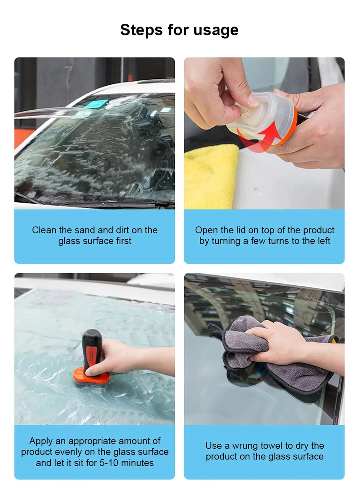 Features: Oil film remove 100ml : 1. You can drive safely by removing the oil film on the front glass of the car! 2. If there is an oil film on the front glass, it will seriously affect driving safety, because your eyes will be severely blocked. Unclear road conditions and pedestrians ahead easily cause traffic accidents. You need a cleaner to remove the oil film to help you eliminate potential driving hazards. 3. However, ordinary cleaners cannot completely clean the oil film, only lotions can clean it! 4. The emulsion contains abrasive particles that can remove oil film, repair minor scratches and protect the window glass for a long time, so you have a new vision. Anti-fogging agent 100ml : 1. Instant Clarity: This glass anti-fogging agent will keep your mirrors and countless other types of surfaces fog-free and ready to use! It is compatible with car windshields, goggles, glasses, etc. 2. Wet or Dry Application: Spray once, scrub, rinse-protect your surface and keep it fog-free. 3. Protect your car from scratches and make the car more shiny like a new car. 4. Protect your car from aging, weathering and erosion, sun, acid powder, etc. 5. Increase the smoothness of the glass surface and keep the glass clean. 6. The hydrophobic effect causes water to bead up and roll off the surface. Coating agent 100ml : 1. Super hydrophobic glass coating, h9 hardness 2. It can be used as a paint protective coating on the surface of a car to protect the car from aging, fading, weather and sun erosion, acid rain, industrial powder, etc. To avoid car scratches, and to make the car brighter like a new car, excellent High gloss effect, not mirror gloss