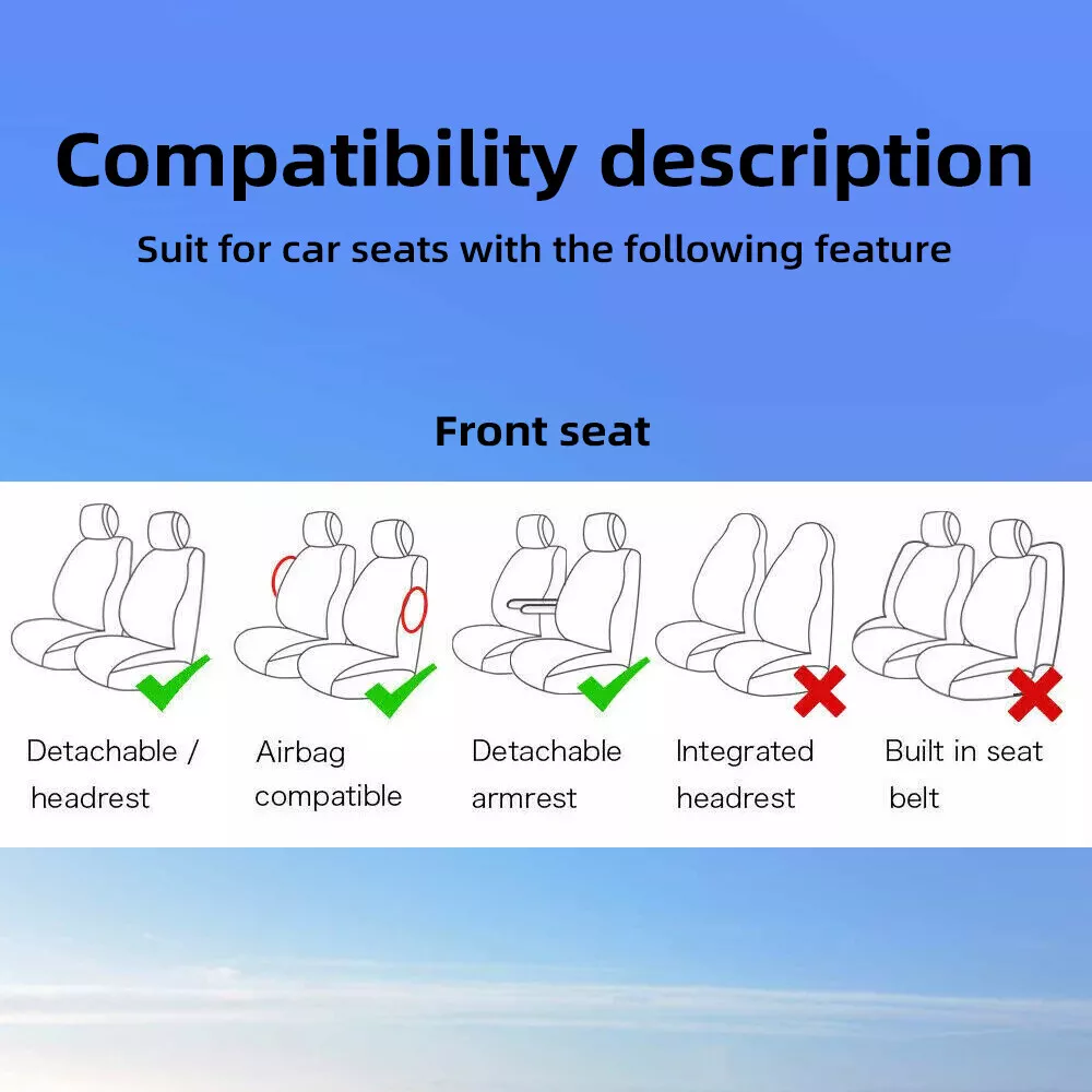 Features: Adopt full enclosed design, which better protects the original seat and is more beautiful. The airbag exit and seat belt buckle are reserved to provide you with safety protection in an emergency. Using high-quality materials, soft and comfortable. It is non-toxic, tasteless, and breathable. It is easy to install and clean, dustproof, resistant to dirt and abrasion. Humanized design, does not affect the function of the original car. Specification: Material: PVC+ composite sponge Suitable for the season: Four seasons Color: Black Fit: Universal fit Package Lists: 2 Front Seats: 2 x Front Seats 5 Front Seats: 2 x Front Seats 1 x Rear Seats 7 Front Seats: 4 x Front Seats 1 x Rear Seats
