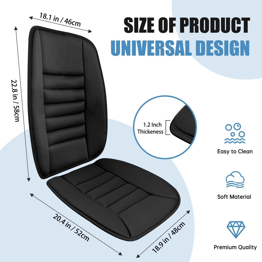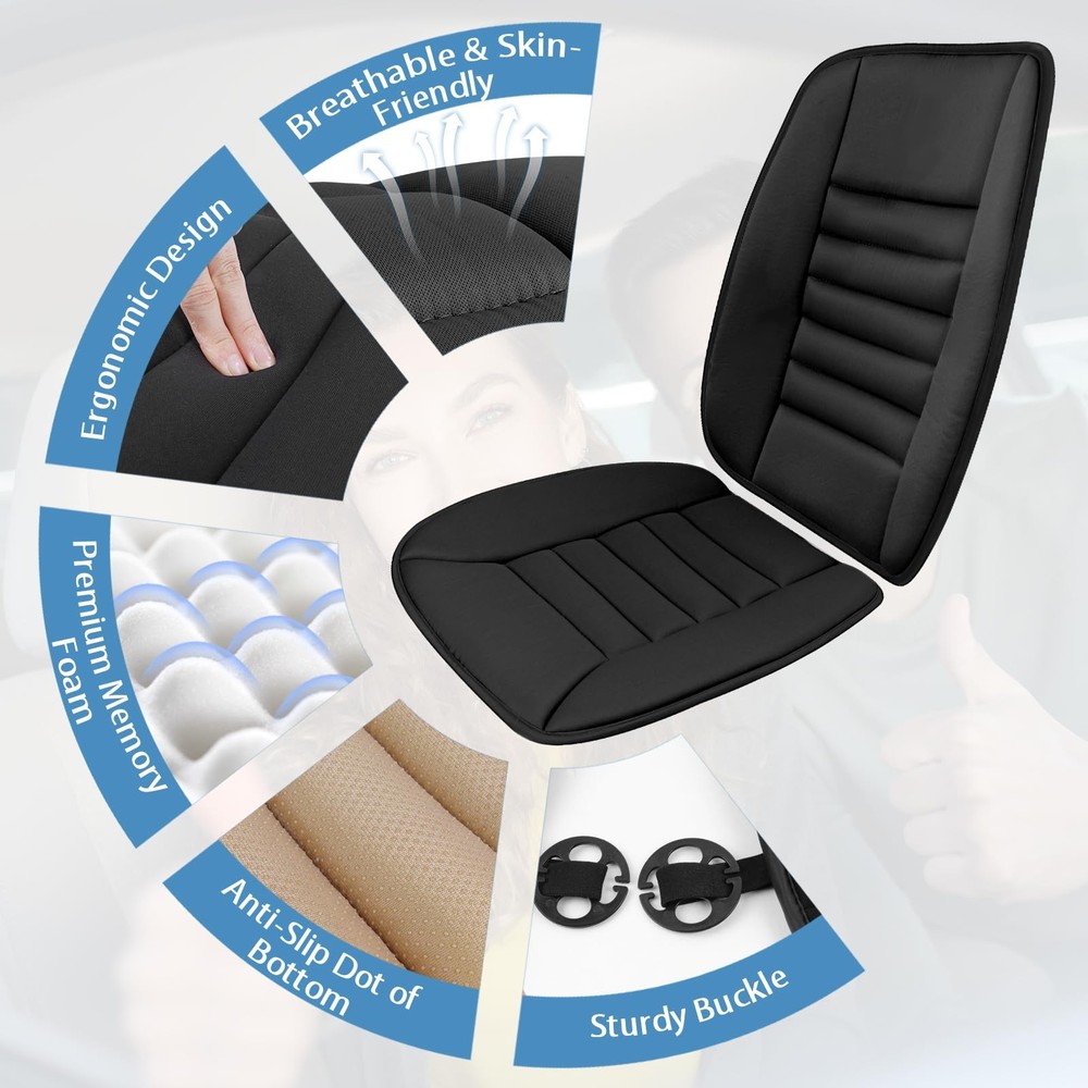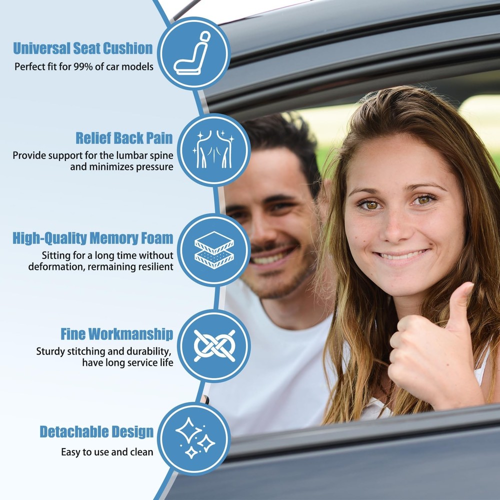 This auto seat cushion is made of high-density memory foam material, providing not only excellent comfort but also maintaining its shape even after long-term use. In addition, the drivers seat cushion uses breathable materials, offering a comfortable and well-ventilated touch. In terms of safety design, the lumbar support for car is equipped with anti-slip rubber and straps to securely fix it in place, preventing any unexpected movement or sliding while driving. Besides providing comfort and safety benefits, this car seat back support also offers long-term protection for car seats. Lastly, memory foam car seat cushion is suitable for various types of seats such as cars, trucks, office chairs, or airplane seats. Whether you want to improve your driving experience or find a practical gift option for friends or family members who spend a lot of time sitting in vehicles or at desks - this car seat cushion is an excellent choice! Strong Support: Our car cushions for driving are made with high-density memory sponge to maintain their shape and prevent deformation even after extended use. The combination of the backrest and seat cushion effectively reduces stress on your hips, waist, and back, alleviating fatigue from prolonged sitting or driving. Stay Comfortable: The car back support is constructed with a breathable material, providing a comfortable touch and excellent air permeability. This effectively prevents discomfort caused by sweat and heat accumulation, ensuring enhanced comfort during long drives or commutes. Safety Design: Adopting an anti-slip silicone bottom cloth design, the automotive seat cushion does not slide and fits better with the original car seat. The elastic band strap design allows for easy access to the safety plug without obstruction, while also not obstructing the airbag. Long-term Protection: The car seat back cushions for driving is designed to maintain their supportive function without distortion for an extended period of time, ensuring exceptional durability. The car driver seat cushion effectively safeguards against dust, wear, wrinkles, scratches, and other potential damages of your car seat. Widespread Use: The car lumbar support for driving seat is suitable for a wide range of seating options, including car seats, truck seats, office chairs, home chairs, game chairs, wheelchairs and more. One pad, multiple uses, convenient and comfortable. They significantly enhance comfort and make an excellent considerate choice for both family members and friends.