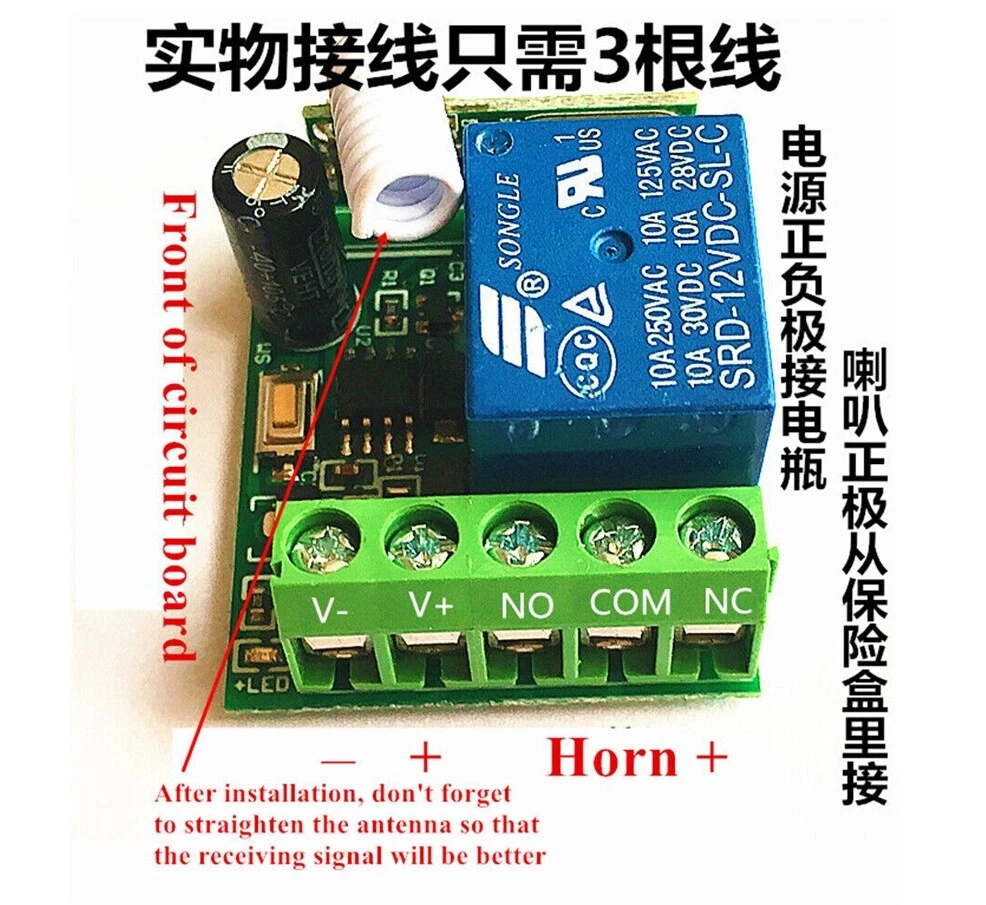 Feature: It Solves The Problem That The Horn Of The Original Car Is Very Hard To Press Wireless Receiving Technology, Compact And Beautiful Buckle Design, High Elasticity, Suitable For Any 12V Vehicle Only Need To Connect Three Wires, Easy To Install(Com —— Horn + ;+V —— 12V Battery + ;-V —— 12V Battery -) Installation Warning: Com —— Horn + +V —— 12V Battery + -V —— 12V Battery - (Cable Not Include) Fitment:12V Universal Note:Please Straighten The Antenna Of The Receiver Before Use, So That The Signal Will Be Stronger Package: 1x Horn Button 1x Receiver Box Car Steering Wheel Horn Button Kit 12V Auto Truck Universal Wireless Horn Button Feature: It Solves The Problem That The Horn Of The Original Car Is Very Hard To Press Wireless Receiving Technology, Compact And Beautiful Buckle Design, High Elasticity, Suitable For Any 12V Vehicle Only Need To Connect Three Wires, Easy To Install(Com —— Horn + ;+V —— 12V Battery + ;-V —— 12V Battery -) Installation Warning: Com —— Horn + +V —— 12V Battery + -V —— 12V Battery - (Cable Not Include) Fitment: 12V Universal Note:Please Straighten The Antenna Of The Receiver Before Use, So That The Signal Will Be Stronger Package: 1x Horn Button 1x Receiver Box Brand Unbranded Color Black Country/Region of Manufacture China Manufacturer Warranty 3 Months Universal Fitment Yes Fitment 12V Car Universal Type Horn