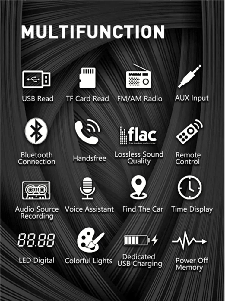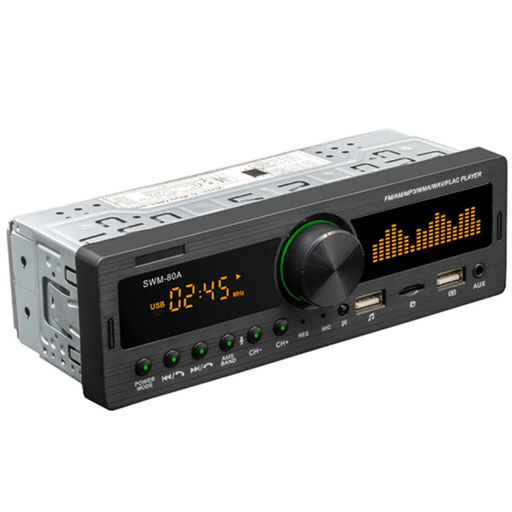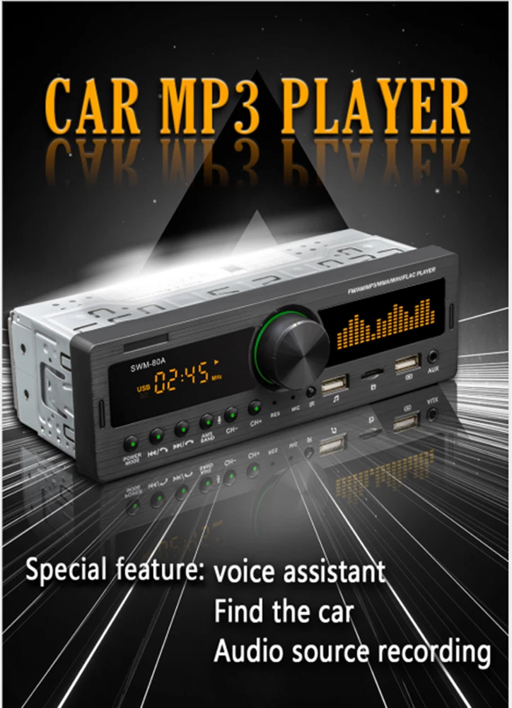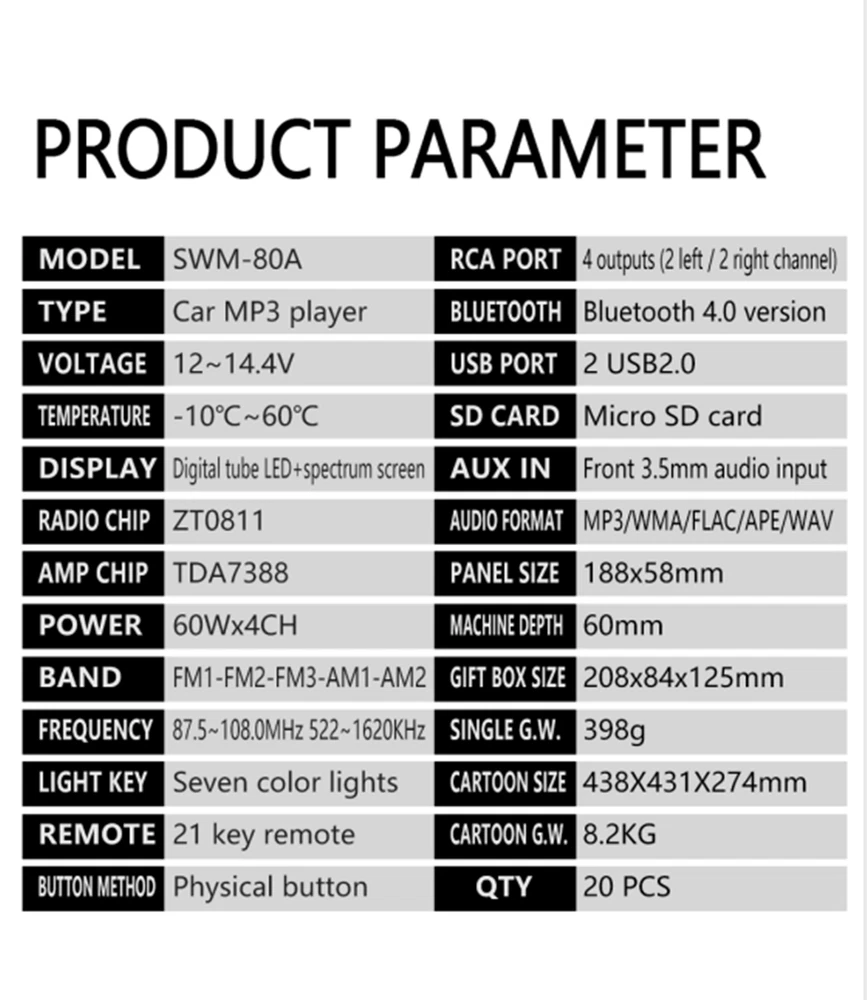 Product Description Car Stereo MP3 Player Bluetooth AUX USB TF FM Radio Audio In-dash Handsfree MIc Features: Model: SWM-80A Voltage: 12V Type: Car MP3 Software solution: SWT6D801 Screen model: LED digital tube + frequency screen Screen size: LED digital tube + frequency screen Panel size: 188*58mm Panel lighting: colorful lighting Gift box size: 208*84*125mm Host depth: 60mm Single machine: 398g Mobile phone connection: mobile phone APP connection Radio band: FM/AM Radio chip: ZT0811 Power: 60W Working temperature: -10~60 degrees Bluetooth model: version 5.0 Power amplifier chip: TDA7388 Radio frequency: FM 87.5~108MHz/A522~1620KHZ TF card slot: TF small card Remote control: card remote control USB interface and version: 2 USB ports, one charging, one USB2.0 reading Reset button: Yes Buttons: physical buttons RCA terminal introduction: 4 RCA outputs (red/white lotus jack) Front aux audio input: Yes Supported audio format: MP3/WMA/WAV/FLAC Complete machine list: Main unit + power cord + remote control + manual + disassembly key basic skills 1. Radio (FM/AM) 2. Card reader, U disk (audio) 3.AUX function 4. Bluetooth function 5. RCA audio output can be connected to subwoofer 6. Mobile APP connection 7. Locate and find car function 8. Mobile phone voice assistant (voice control) 9. Audio source copy function 10. Colorful lights Note: Please allow 1-3mm differs due to manual measurement. Due to the different display and different light, the picture may not show the actual color of the item. Thanks for your understanding. Payment Returns Contact Us Shipping We accept payment by PayPal only ! Payment should be completed within 5 days after buyer places the order,or else an unpaid case will be opened in order to cancel the transaction. If you can not pay in time, please contact us. e-check from PayPal will only be processed once the payment clears. All of the items will be shipped to buyer's EBAY address,please confirm your address on Ebay before you buy.Your order will be usually shipped out the same or next business days once the payment is made and cleared. 30-day Warranty with Exchange for defective, malfunctioned, incorrect or parts-missing items. Please notify us and return the item with all parts and accessories packed and marked "FOR EXCHANGE" within 14 days of receipt. If defective, malfunctioned or parts-missing items are no longer available, a refund may be issued. All returning postage costs will be the responsibility of the buyers under all circumstances. If you encounter any problems about anything, please feel free to contact us and we will do our best to assist you solve the issue. If you are not satisfied in anyway, please feel free to let us know and give us a second chance to correct it before you decide to leave any neutral or negative feedback. Please contact us through eBay link if you have any questions. We will reply you within 24- 48 hours. Please check you spam mail if no response for 48 hours. All items will be checked before packing. All items are new and of high quality. Item will be shipped within 1 business days upon receipt of payment, excluding weekends and public holidays. If to USA,we will ship your order by USPS,it will take about 8-12 working days to you,and you can track it on line. If to other country,we will ship your order by China Post or Singapore Registered Air Mail,it will take about 14-21 working days to you,you aslo can track it on line. Delivery time is about 14-28 business days and it may take up to 8 weeks . Payment We accept payment by PayPal only ! Payment should be completed within 7 days after buyer places the order,or else an unpaid case will be opened in order to cancel the transaction. If you can not pay in time, please contact us. eCHECK from PayPal will only be processed once the payment clears. All of the items will be shipped to buyer's EBAY address,please confirm your address on Ebay before you buy.Your order will be usually shipped out the same or next business days once the payment is made and cleared. Returns 30-day Warranty with Exchange for defective, malfunctioned, incorrect or parts-missing items. Please notify us and return the item with all parts and accessories packed and marked "FOR EXCHANGE" within 14 days of receipt. If defective, malfunctioned or parts-missing items are no longer available, a refund may be issued. All returning postage costs will be the responsibility of the buyers under all circumstances. Contact Us If you encounter any problems about anything, please feel free to contact us and we will do our best to assist you solve the issue. If you are not satisfied in anyway, please feel free to let us know and give us a second chance to correct it before you decide to leave any neutral or negative feedback. Please contact us through eBay link if you have any questions. We will reply you within 24- 48 hours. Please check you spam mail if no response for 48 hours. Shipping All items will be checked before packing. All items are new and of high quality. Item will be shipped within 1 business days upon receipt of payment, excluding weekends and public holidays. If to USA,we will ship your order by USPS,it will take about 7-10 working days to you,and you can track it on line. If to other country,we will ship your order by China Post or Singapore Registered Air Mail,it will take about 14-21 working days to you,you aslo can track it on line. Delivery time is about 14-28 business days and it may take up to 8 weeks . Welcome to our Store ~