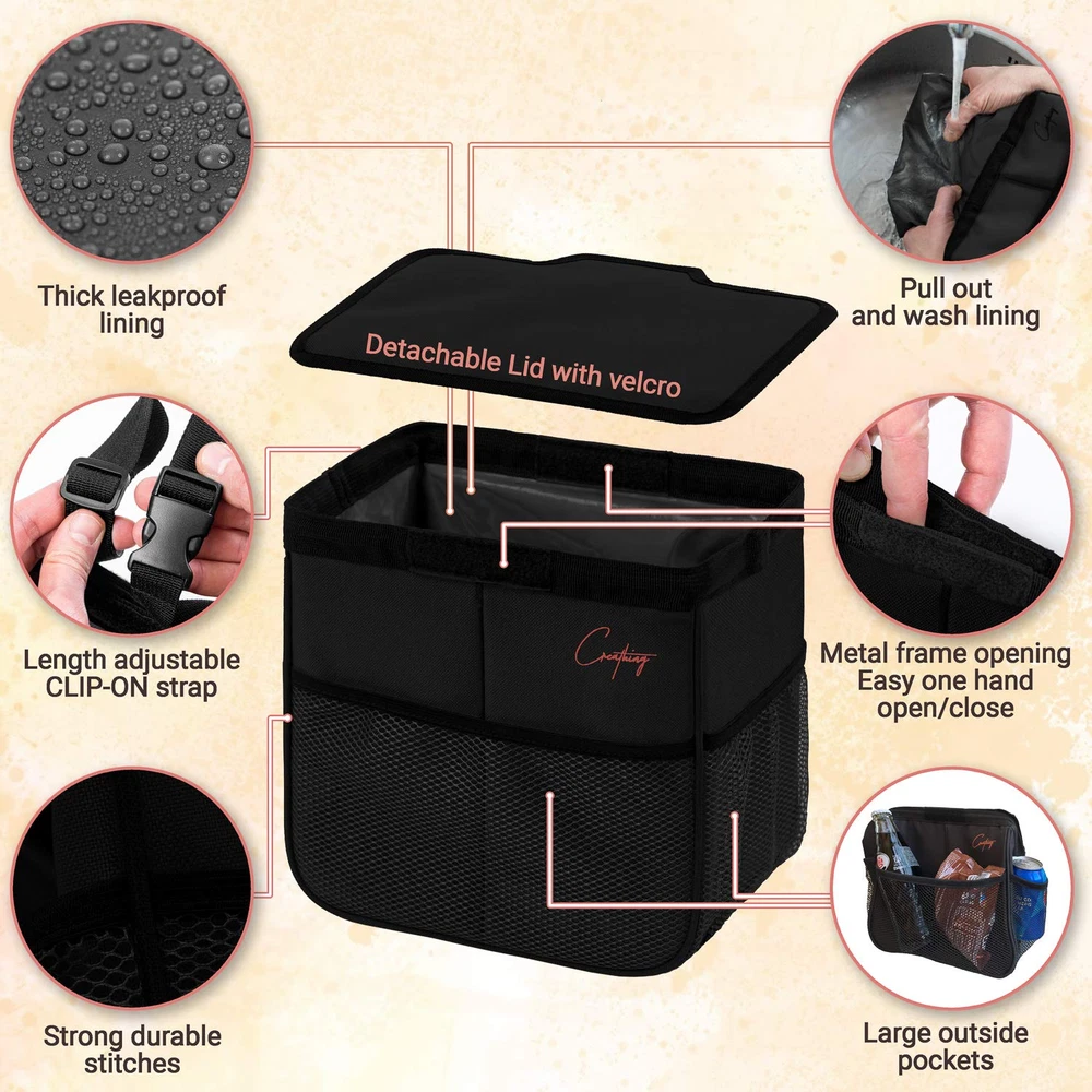 Store New Arrivals Add to Favorite View Feedback Contact Car Trash Can Foldable, Waterproof | Organizer Bag or Garbage Can for Console/Seat (Medium, Black), 2 Gallons Description Item model number CL-03 Manufacturer Lab Room Type vehicles Capacity 2 Gallons Color Black Special Feature Collapsable Product Dimensions 9 x 9.5 x 5.5 inches; 9.6 ounces Material Polyester Shape Rectangular Opening Mechanism fasteners Recommended Uses For Product inside vehicles to contain car trash Is Discontinued By Manufacturer No Finish Type Painted Size 2 Gallons Seamless integration in any vehicle. This car trash bin easily folds flat when not in use, while offering a generous 2-gallon capacity. The large adjustable strap ensures a perfect fit in any vehicle, from small or compact cars, to SUVs, trucks, vans, campers, and even boats Convenient and Easy to Clean. With a robust seal and a durable leakproof lining, this car garbage can effectively contains both dry and wet waste, safeguarding your car's upholstery. Cleaning is a breeze with the stain-resistant material - just wipe it down. The lining is also easy to pull out when it needs cleaning Sturdy and Reliable. Made of 3 layers of high-quality materials and reinforced by stitching, this car trash bag is built to last and withstand daily use. Its strong construction and durable straps ensure it stays firmly in place, preventing any unwanted spills or messes Multipurpose Bag. This trash can for car easily doubles as a storage bag for toys, car care products and pet accessories or as a handy and efficient cooler bag due to its waterproof capability and foam insulation layer. Plus, take advantage of the three outer pockets for additional car storage space Trusted Brand. With years of industry experience, Creathing Lab guarantees utmost customer satisfaction. Our car trash cans are carefully made, tested against odors, and resistant to wear and tear. It’s time to free your car from clutter! Product Description It’s not just about where you’re going, it’s about how you get there... The video showcases the product in use. The video guides you through product setup. The video compares multiple products. The video shows the product being unpacked. 1 Detachable Lid 2 Leakproof Lining 3 Outer Pockets 4 Adjustable Strap 5 Easy Open/Close The extra foam layer makes it your handy cooler bag! Your car trash bag may be used to store useful items or to chill your favourite drinks. Just add some ice or chilled gel packs and enjoy the party! Our car garbage cans, to trust and rely on. Choose yours now! Add to Cart Add to Cart Add to Cart Add to Cart Add to Cart Add to Cart Customer Reviews 4.5 out of 5 stars 2,461 4.5 out of 5 stars 2,461 4.7 out of 5 stars 867 4.7 out of 5 stars 412 4.5 out of 5 stars 2,461 4.5 out of 5 stars 2,461 Price $19.95 $ 19 . 95 $19.95 $ 19 . 95 $22.25 $ 22 . 25 $22.25 $ 22 . 25 $16.87 $ 16 . 87 $17.75 $ 17 . 75 Leakproof Lining ✔ ✔ ✔ ✔ ✔ ✔ Detachable lining ✘ ✘ ✔ ✔ ✘ ✘ Adjustable strap included ✔ ✔ ✔ ✔ ✔ ✔ Extension strap included ✔ ✔ ✔ ✔ ✘ ✘ Anti-slip bottom ✘ ✘ ✔ ✔ ✘ ✘ Recommended use: Large family car, truck, SUV Large family car, truck, SUV Any vehicle Any vehicle Small / compact cars Small / compact cars ABOUT US We offer the best prices around on high quality products. Our E-store includes media such as books, movies, music and games while offering electronics, toys, sporting apparel, clothing, tools, general home, garden items and more. SHIPPING We are always working hard to ensure your package arrives as soon as possible. Please understand that some factors like weather, high postal traffic, and the performance of shipping companies are outside of our control. We offer free shipping to the lower 48 states and ship within 2 business days of payment, usually sooner. We do not accept P.O. Boxes. Please provide a physical address. For shipping outside of the continental USA, we only use eBay's Global Shipping Program.The item is shipped to KY and then sent to the rest of the world. International customers are responsible for all duties and taxes. Continue to check out in order to calculate costs for shipping the item to your country. Messages regarding eBay's Global Shipping Program MUST be directed at eBay EXCLUSIVELY. RETURNS We offer a 30-Day Return Policy on items which you are not completely satisfied with. You have the option for a full-refund or an exchange of the item. No returns are available on items shipped outside of the USA. PAYMENT We accept PayPal. CONTACT US This page content is yet to come Please ad us to your favorite seller and visit again later Thank You CUSTOMER SATISFACTION We try our very best to make sure every customer is completely satisfied. If there's a problem, message us! We're happy to help. WE ACCEPT Copyright © 2021 AutoDS. | All Rights Reserved