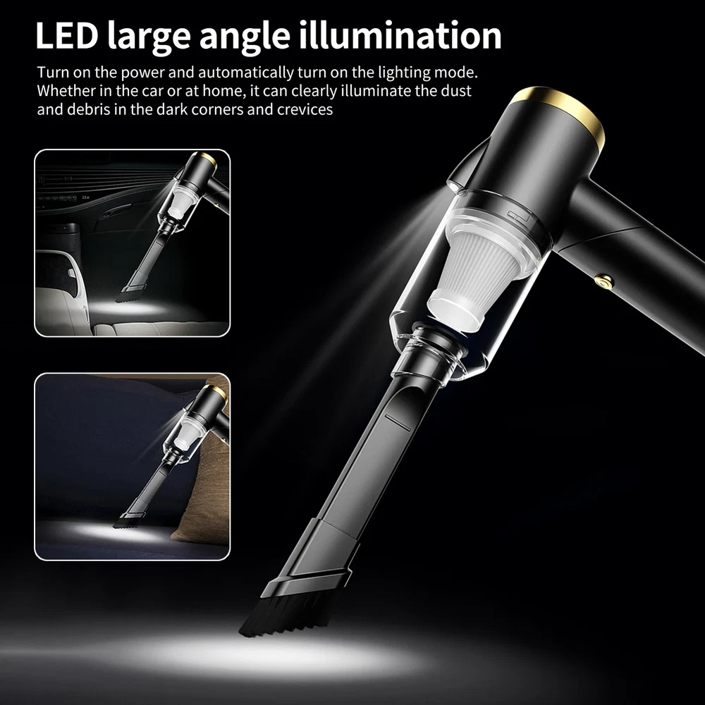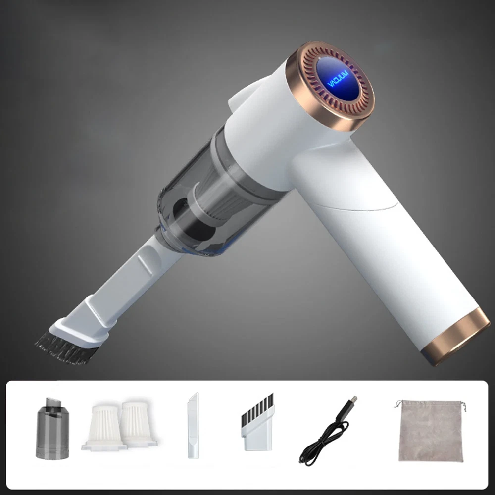 The car vacuum cleaner is a versatile and powerful cleaning tool designed to make your cleaning tasks effortless. With its three types of nozzles, you can easily tackle different cleaning needs. The wide nozzle efficiently handles large areas, such as the car floor, while the brush nozzle effectively removes dust from the gaps between air conditioning vents. The flat nozzle is perfect for reaching small and hidden corners that are often overlooked. Car Vacuum Cleaner Cordless Handheld Car Vacuum Cleaner Versatile nozzle options: The car vacuum cleaner comes with three types of nozzles: wide nozzle, brush nozzle, and flat nozzle. Each nozzle is designed for specific cleaning purposes, such as large areas, gaps between air conditioning vents, and small corners. Powerful and foldable: The vacuum cleaner is equipped with a 4000mAh rechargeable battery that provides up to 30 minutes of continuous use. It offers a strong suction power of 9000pa and features a foldable design for convenient storage and portability. Noise reduction: The optimization of the air duct and tight engagement of components help reduce wind resistance, vibration noise, and rotor friction noise, resulting in a quieter cleaning experience. LED illumination: The vacuum cleaner has a built-in LED light that automatically turns on when the power is switched on. This feature allows for clear visibility of dust and debris in dark corners and crevices, both inside the car and at home. Wide range of applications: Apart from car cleaning, this vacuum cleaner can also be used to clean sofas, sheets, pet hair, carpets, desks, computers, and more. It effectively sucks away various types of debris, including sediment, confetti, hair, cigarette butts, and gravel. Product Material: ABS, PC Sution Power: 9000PA. Rated Power: 120W, Input: 5V/1.5A, Dust Collection Bin: 120ml Charging Time: Approximately 4 Hours, Built-in Battery: 4000mAh, Working Time: 30 Minutes, Item Size: 7.6*1.7in Package List: 1* Car Vacuum Cleaner Body, 1* Dust Collection Bin, 2* Washable Filter, 1* Long Mouthed Tube, 1* Brush Suction Head, 1* Charging Cable, 1* Storage Bag