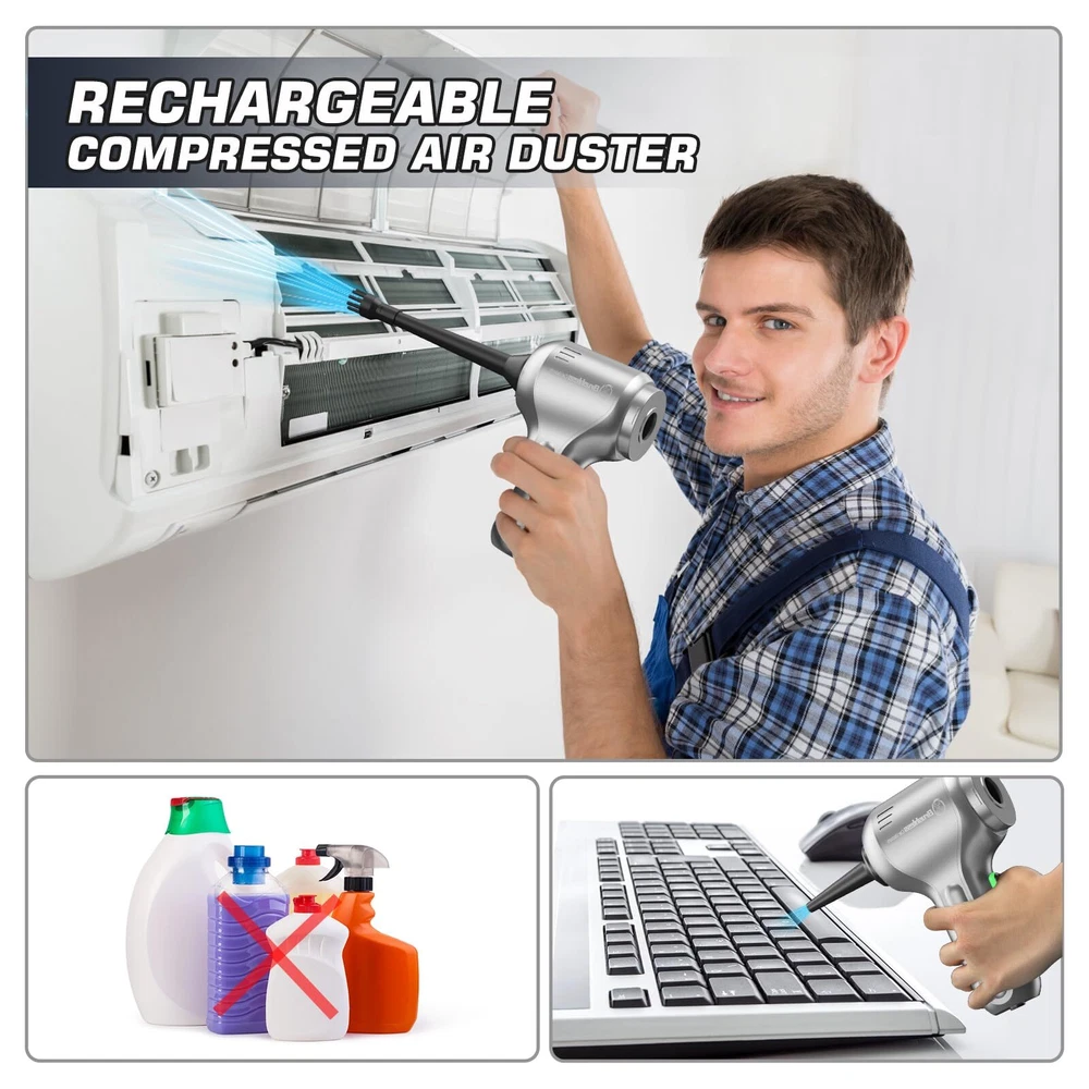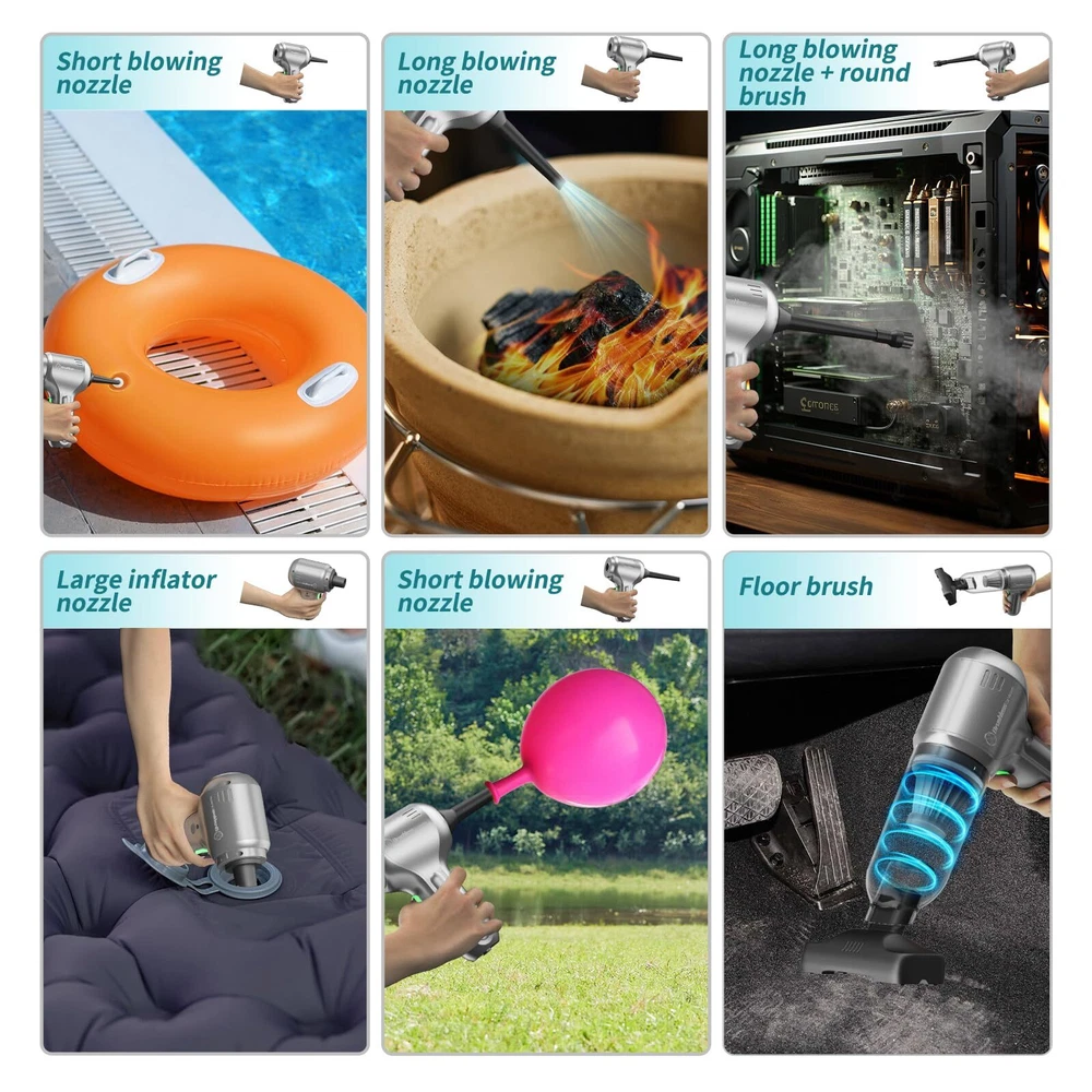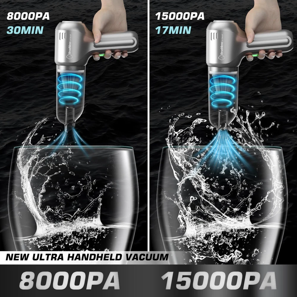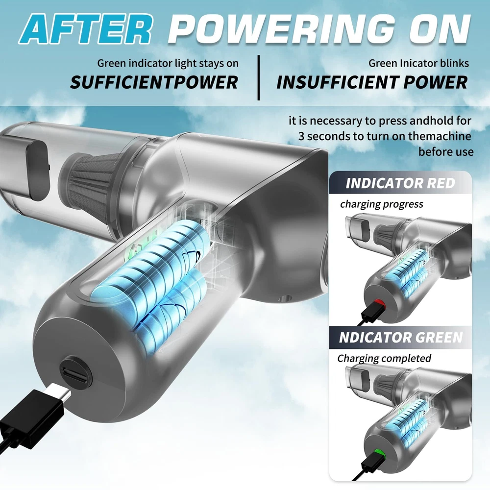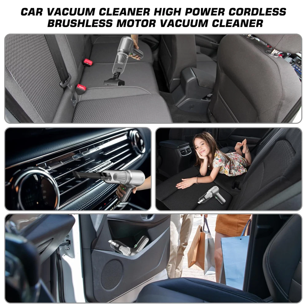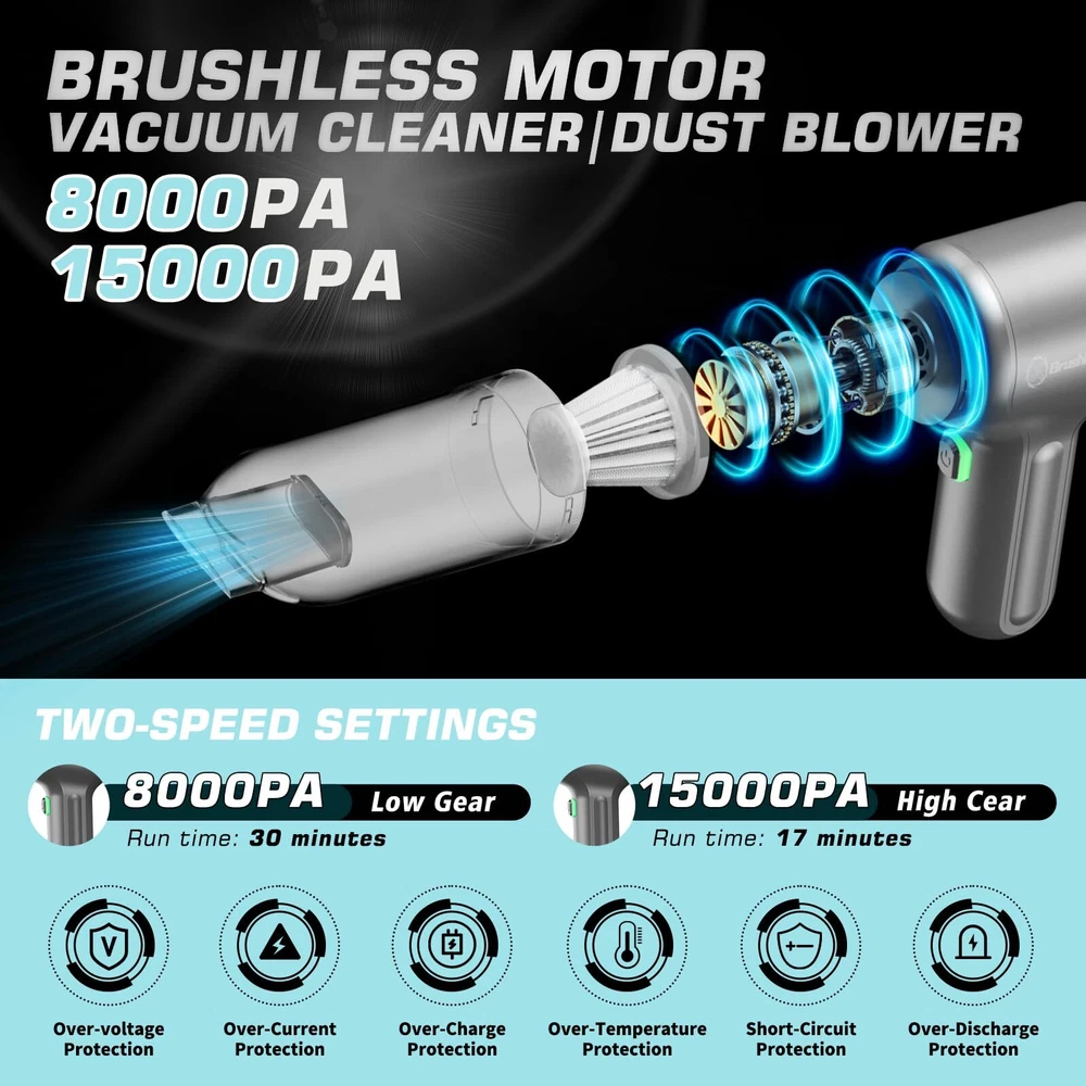 【Powerful 8000PA and 15000PA Suction】 - Our portable car vacuum offers two powerful suction modes, 8000PA and 15000PA, ideal for cleaning your car interior thoroughly. Designed for everyday use, it effectively handles dirt, dust, and debris. Simply press and hold for 3 seconds to power on and switch between modes with a quick press. 【All-in-One Vacuum, Blower, and Pump】 - This 3-in-1 mini vacuum cleaner combines vacuuming, blowing, and pumping functions, making it a versatile tool for your car and home. Clean crumbs, pet hair, and dust from carpets, upholstery, and tight spaces. Additionally, use it as a BBQ fan or a tire inflator, enhancing its functionality. 【Efficient Type-C Charging and Battery Indicator】 - Equipped with a Type-C USB charging cable, car vacuum clean charges fully in just 3 hours and runs for 15-20 minutes. The green power indicator ensures you know when the battery is fully charged, while the built-in power reminder alerts you when it’s time to recharge. 【Compact and Lightweight for Easy Handling】 - Weighing only 0.83lbs, the cordless handheld vacuum is designed for easy maneuverability and storage. Its small size makes it perfect for quick clean-ups in your car and around the house. The washable HEPA filters and de-tangling brushes keep the vacuum in top condition. 【Complete Set】 - Our cordless car vacuum makes an excellent for car and home owners. It’s perfect for Christmas, birthdays, and other special occasions. The 13-piece set includes various attachments and a storage bag, all packaged in an elegant box, providing a comprehensive cleaning solution.