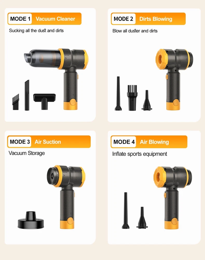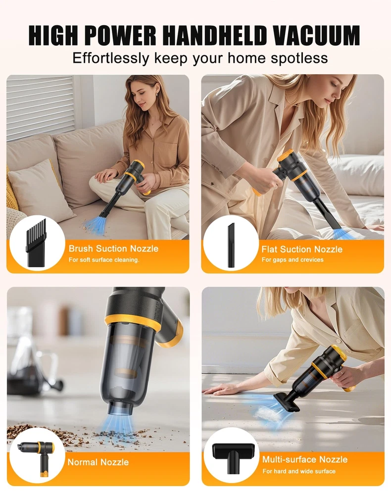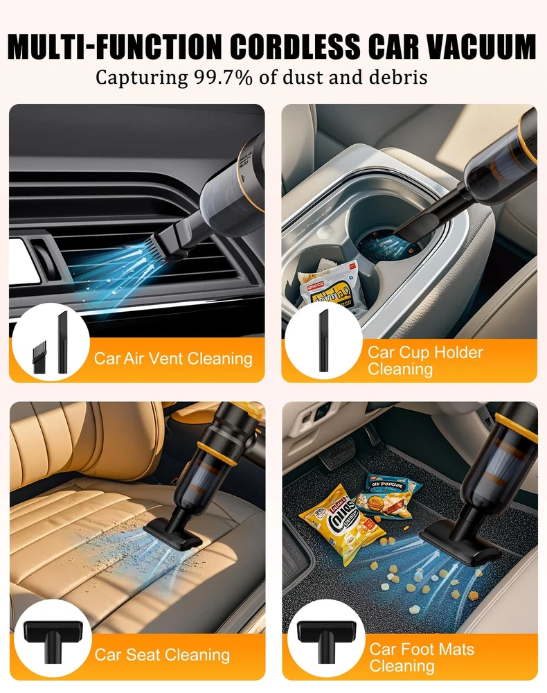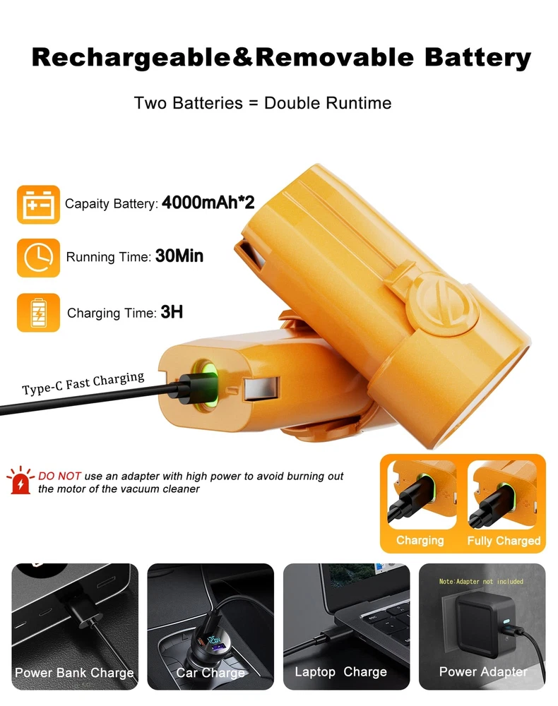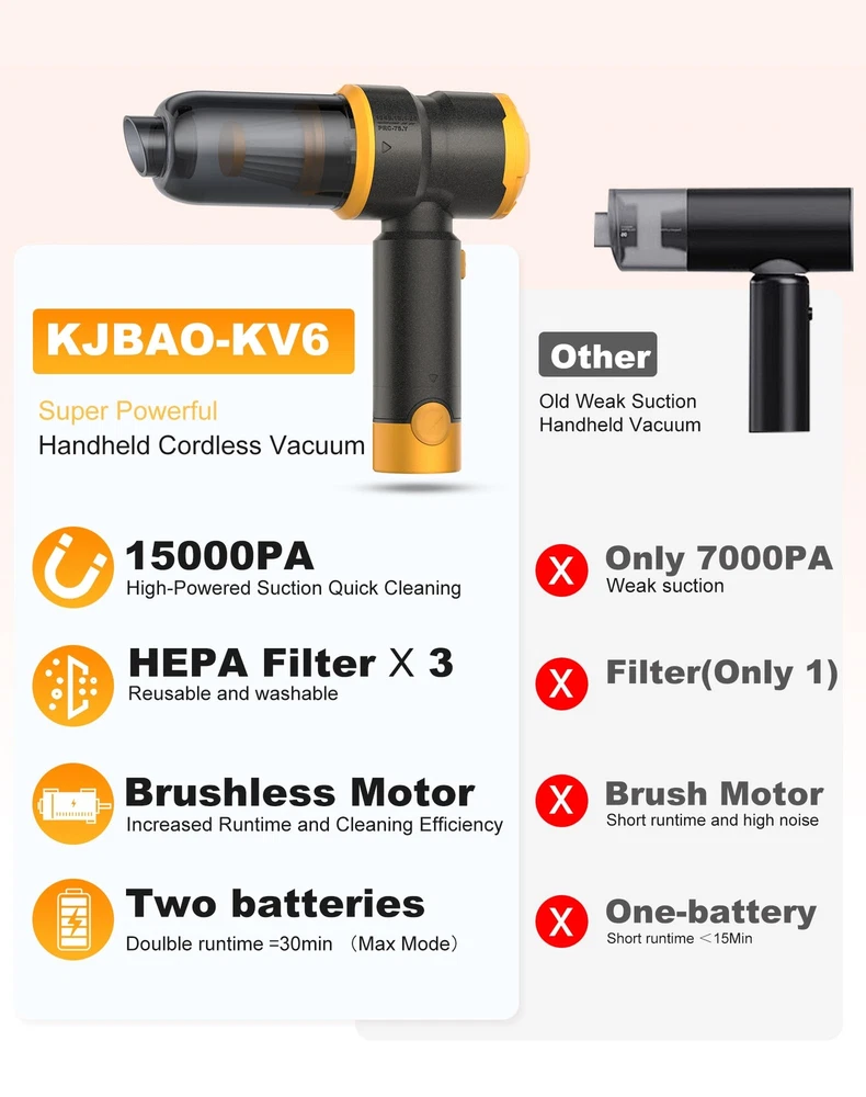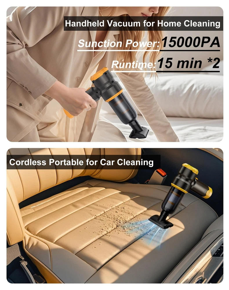 NOTICE: Fully charge the battery before using this car vacuum cleaner. 【Two Removable & Rechargeable Batteries】KV6 car vacuum cleaner equipped with two removable&rechargeable(3 hours Type-c charge) 4000mAh batteries,single battery provide 15 minutes runtime in 15kPa suction mode(Two Batteries-30 mins runtime),the two batteries can be used alternately 【Upgraded Brushless Motor】 The high power portable car vacuum uses an upgraded high-speed brushless motor with 15000PA super suction.Whether it is a large area or a small area,sand,dust and debris can be easily cleaned 【Small size, Easy to carry】The lightweight (only 0.96Lbs) mini car vacuum cleaner is small in size, cordless use is not limited by space, and it is equipped with a storage box that can hold all accessories, which can be put into the glove box/storage box/drawer after use, so that your car and home are always tidy 【Widely Application】KV6 portable cordless vacuum also as a mini blower to quickly blow out the dust and pet hair in your car,window, keyboard,camera or any hard-to-clean place,it could works as a BBQ fan,too.(CAN’T ABSORB WATER OR LIQUID) 【WASHABLE HEPA Filter】 The handheld cordless vacuum is equipped with two additional filters. The HEPA filter can be washed&reused and 2-3 months service life.The upgraded filter can be used again with a simple wash. The HEPA filter captures a whopping 95.99% of dust and particles 【THOUGHTFUL GIFT FOR CAR & HOME】car vacuums with best suction cordless, serves as an ideal and considerate gift for both men and women, suitable for home, office and cars. Perfect for occasions like Christmas, Valentine's Day, birthdays, Father's Day, Mother’s Day, Thanksgiving Day and anniversaries