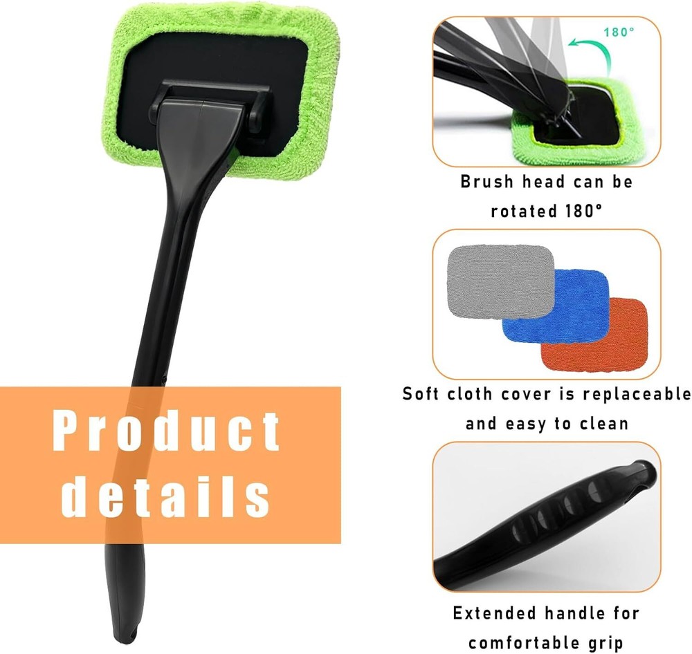 Car Windshield Cleaning Tool, Microfiber Window Cleaner with 4 Washable and Reusable Cloth Pad & Long Handle, Auto Glass Wiper Cleaning Kit with Spray Bottle, Car Accessories 【Package Includes】: This cleaning kit contains 1 handle, 1 spray bottle and 4 microfiber cloth covers. It is convenient to spray water with the spray bottle while cleaning. The 4 cloth covers come in different colors, green, gray, blue and orange, they are not only plentiful, but the bright and beautiful colors also make your cleaning work a little less boring. 【Microfiber Cloth Cover】: The soft microfiber cloth cover is absorbent and has strong cleaning ability. You can clean your car glass quickly and efficiently without even needing detergents or soapy water, and that too, without using too much force. In addition, it can be cleaned and used repeatedly without deformation. 【Long handle】: The handle of this cleaning tool is 18 inches long, and the elongated design allows you to clean farther and higher places, such as the car roof. In addition, the handle is ergonomically designed for a comfortable grip and is also non-slip, so you won't get your hands tired after a long period of use. 【Clever Design】: This cleaning brush has a removable handle that can be split in half when you're not using it, just by the snap and switch, making the storage more space-saving. In addition, its brush head rotates 180 degrees, so you can clean hard-to-reach corners easily and at multiple angles. 【Extensive Use】: The cleaning kit is suitable for defogging and dusting work on the interior and exterior of various vehicle glass, suitable for cars, suvs, vans and so on. In addition, it can also be used in home and office, you can clean windows, monitors, kitchen walls, bathroom mirrors and so on with it. Product Description Ohleats Car Windshield Cleaning Tool