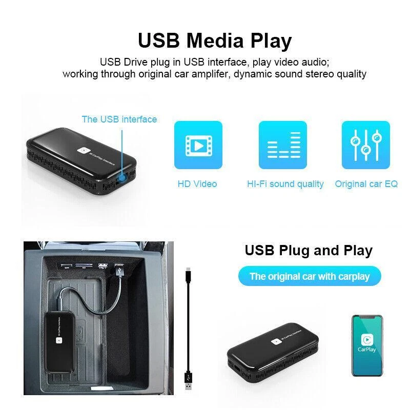 DESCRIPTION Car Support Wired To Wireless Carplay Smart with Mirror Link Screen For Apple/Android Phone New version of Wired Carplay to be Carplay Dongle Features: Important: Please make sure your car has an original Apple Carplay wired Note: This product is compatible with the car and has a built-in Apple game If you are not sure if this is the product that fits your model, please contact us before placing an order USB Smart Link Carplay Dongle Box for iOS Phone Navigation Player System Description: Carplay wires to operate carplay (Compatible with built-in Apple Carplay cars in car) Usage- Introducing our product to insert usb into port car, enjoying active carplay apple on road System: Android 9.0 Processor: H6 A53 4 cores 1.8HZ RAM: DDR3 1G EMMC: 8GB Status view: Mapping through CarPlay protocol WiFi module: IEEE802.11a / b / g / n / ac 2.4G + 5G GPS module: Built-in Port: LED indicator, TYPE-C female, USB female, boot button Characteristics: Plug and play Bluetooth connection Phone link Apple Carplay mirroring link Steering wheel support, control knob, voice control (action is it you original car) Material: Plastic Product Size: 90 * 45 * 15 mm Weight: 55 g Packing box: 106 * 90 * 60 mm Weight: 184 grams Cake list: Carplay Box * 1 User Guide * 1 Type-C cable * 1 Compatible models: Fit for Audi, Mercedes-Benz, Porsche, Volkswagen, Volvo, Peugeot, Citroen, Cadillac, Buick, Chevrolet, Nissan, Honda, Ford, Pioneer, Kenwood, Hyundai, Lexus, Toyota, Mazda, Kia, Alpine, C Yip, Dodge, Suzuki, etc. eBay Cross Border Trade powered by ChannelEffect