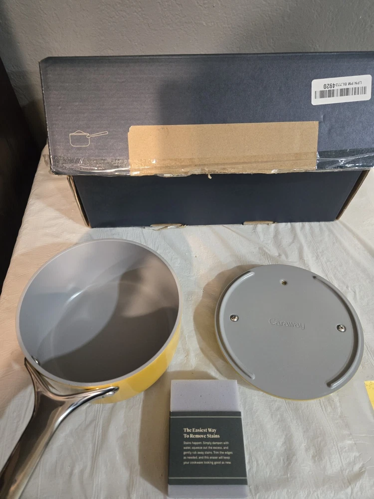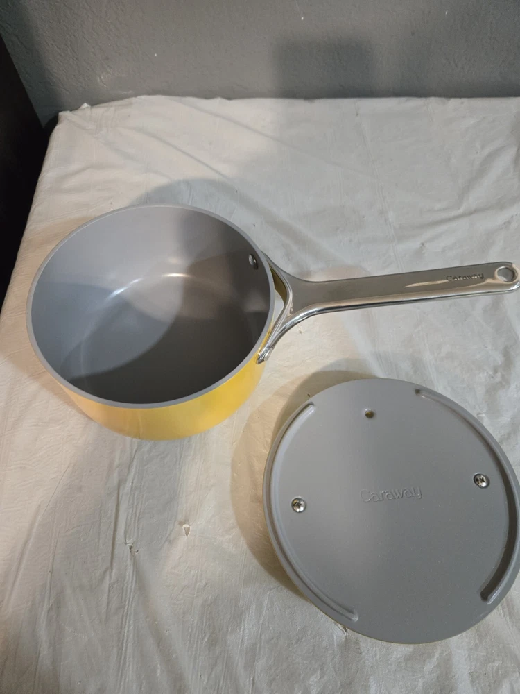 Open Box Upgrade your cooking game with this Caraway Nonstick Ceramic Sauce Pan with Lid. This versatile pan is compatible with induction, electric, and gas stove types and features a 1.75 qt capacity, perfect for your sauce and soup cooking needs. Its yellow color adds a pop of fun to your kitchen, while its ceramic material ensures durability and safe cooking. The pan's non-stick surface makes cooking and cleaning a breeze, and the included lid helps retain heat and flavor. This saucepan is a must-have addition to your cookware collection, and with its brand reputation, you can trust its quality. Get ready to enjoy healthy and delicious meals with this Caraway Nonstick Ceramic Sauce Pan with Lid.