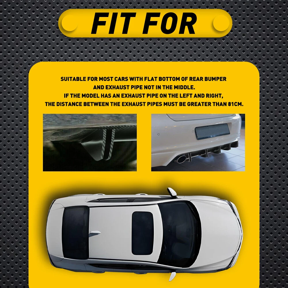 Fit for: Suitable for most cars with flat bottom of rear bumper and exhaust pipe not in the middle. If the model has an exhaust pipe on the left and right, the distance between the exhaust pipes must be greater than 81cm. Specifications: Product Material: ABS Color: Carbon fiber (as pictures show) Placement on Vehicle: Lower, rear Features: 【Reduce Air Resistance】 This shark fin diffuser designed to increase a vehicle's aerodynamic performance and improve the stability of vehicle during fast driving. 【Excellent Appearance】 Carbon Fiber Rear Diffuser Lower Bumper Splitter Spoiler For VW Jetta MK5 MK6 M Fit for: Suitable for most cars with flat bottom of rear bumper and exhaust pipe not in the middle. If the model has an exhaust pipe on the left and right, the distance between the exhaust pipes must be greater than 81cm. Specifications: Product Material: ABS Color: Carbon fiber (as pictures show) Placement on Vehicle: Lower, rear Features: 【Reduce Air Resistance】 This shark fin diffuser designed to increase a vehicle's aerodynamic performance and improve the stability of vehicle during fast driving. 【Excellent Appearance】 Shark fin and clean lines design with beautiful appearance to decorate your car, which gives your vehicle a more aggressive racing look. 【ABS Material】 Made of ABS material with high-quality, waterproof, durable functions and will not easy to break. 【Universal Fit】 Universal fit for most cars, please measure the size before purchasing. Note: Please confirm the size and make sure that there is enough space to install before purchasing!!! Professional installation is required. Packaging Include: 1 x Rear Shark Fin Bumper Diffuser 1 x Screws kit 1 x Double sided adhesive tape ABOUT US Carbon Fiber Rear Diffuser Lower Bumper Splitter Spoiler For VW Jetta MK5 MK6 M Fit for: Suitable for most cars with flat bottom of rear bumper and exhaust pipe not in the middle. If the model has an exhaust pipe on the left and right, the distance between the exhaust pipes must be greater than 81cm. Specifications: Product Material: ABS Color: Carbon fiber (as pictures show) Placement on Vehicle: Lower, rear Features: 【Reduce Air Resistance】 This shark fin diffuser designed to increase a vehicle's aerodynamic performance and improve the stability of vehicle during fast driving. 【Excellent Appearance】 Shark fin and clean lines design with beautiful appearance to decorate your car, which gives your vehicle a more aggressive racing look. 【ABS Material】 Made of ABS material with high-quality, waterproof, durable functions and will not easy to break. 【Universal Fit】 Universal fit for most cars, please measure the size before purchasing. Note: Please confirm the size and make sure that there is enough space to install before purchasing!!! Professional installation is required. Packaging Include: 1 x Rear Shark Fin Bumper Diffuser 1 x Screws kit 1 x Double sided adhesive tape FAQ Shipping Returns Contact Us Payment Why swith to LED? LEDs not only give your vehicle a clean, modern look but, with proper use, will outlast any halogen bulb and HID bulb! Low energy draw, high lumen output, and instant on/off LED technology out shines stock bulbs in every way. Which bulbs are used in my vehicle? Check Sylvania automotive lamp replacemnt guide , you can select the year, make, and model of your vehicle, then select the application you want to replace or upgrade from stock. What does CAN Bus mean? CAN Bus means Controller Area Network Bus. This system monitors your vehicle and reports operating conditions. CAN Bus systems are commonly found in European vehicles such as BMW, Audi, Mercedes, Volkswagen, Porsche, and in many American vehicles. While most late model American vehicles have CAN Bus systems, it is always good to check with your vehicle dealer to see which system your vehicle has before purchasing electrical products. When do you need Warning Canceller? Some vehicles with cmplex internal computers(such as Audi,BMW,Jaguar,Mercedes,etc.) might report on-dash errors or flickering on the headlights. The warning canceller fixes the dashboard warning and flickering effect. Bulb Out Dashboard Error: On some vehicles, the dashboard will report as if you have a headlight bulb missing or burnt. It does not affect the headlights functioning, but the light on-dash will be on. The warning canceller fixes the issue. Flickering Issue: This happens when your vehicle does not recognize the new headlights installed. When turning the headlights on, the vehicle's computer does not understand the signal back from the headlights hence thinking they are still off. This triggers the headlight flickering effect. The warning canceller solves this issue. LED Advantages: Very low and efficient energy consumption than halogen bulbs & HID Bulbs Compared with HID bulbs, LED bulbs Light up instantly, no warm up period Low voltage protection, high precision constant current driver chip Longer lifespan than HID and halogen bulbs Light can be controlled easily in color and intensity Easy to install a LED headlight conversion kit (1) We will ship your item(s) within 24 hours. (2) We ship this item to US only via USPS first class mail. It usually takes 3-6 working days to deliver. How Long Will It Take to Receive My Refund? If you have emailed us for a refund ,once we have approved it ,after 60 days your money will be refunded. The estimated time for the refund to appear in your account is based on the payment method you use. Paypal is the only supported in NIGHTEYE Store. Please notify us within 30 days after you've received your purchased item. All return requests must be submitted through your eBay account. NOTE: Buyers pay for the return shipping fee. Items to be returned must be in resalable condition, for example: You do not satisfy the item quality Item do not fit your vehicle perfect Item can not reach your expectation The item arrived be broken You do not receive the item Parcel Lost Rece