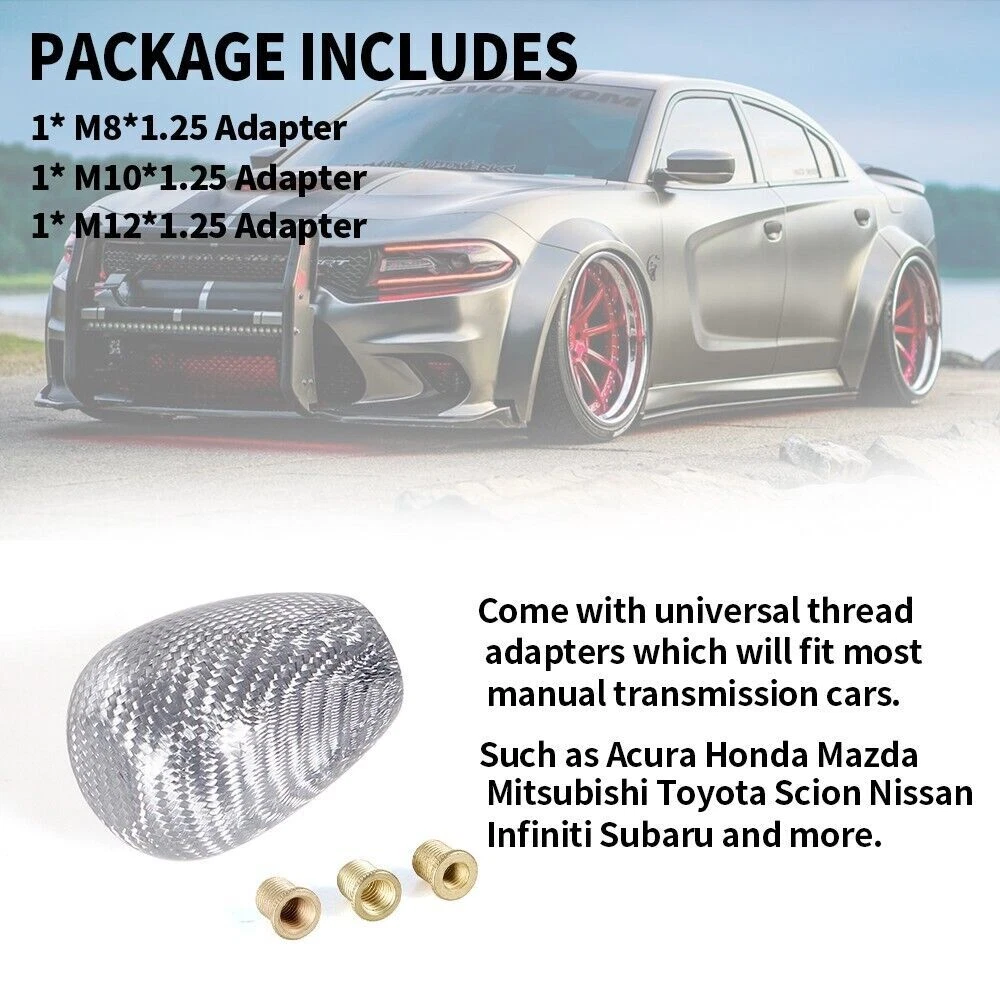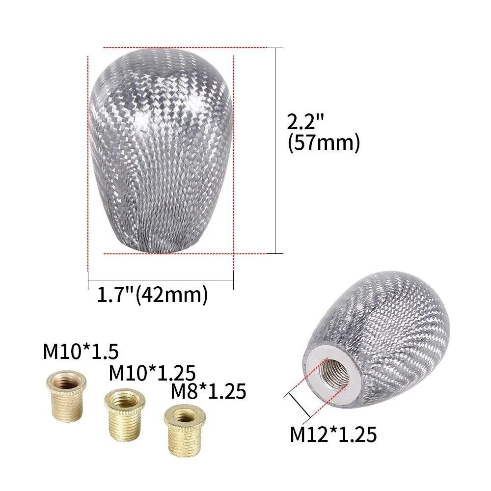 Product description: Carbon Universal Car Shift Knob Features: Material: carbon Color:Silver ( We also have Red/Black ) Fitment: fit for most of M8, M10, M12 Installation: 1. Take out the gear knob 2. Select the proper size of the adapter, and insert into gear shift rod 3. Make shift knob insert into the a dapter, the installation is complete Package including: 1* shift knob 3* adapter Please Note: 1. Universal shift knob, but some cars can not fit. These 2 kinds of gear knobs can not fit: - 1.1 Manual: need to lift up to get into reverse gear (namely, reverse gear R in the upper left corner) - 1.2 Automatic: reverse gear has a button 2. Please make sure the item is a suitable replacement for your car. 3.Please allow 1-3mm differs due to manual measurement Shipping Information We will only ship this item to buyers by Normal Mail, please confirm your address is correct, and if you want to change the delivery address, just feel free to contact us when you purchase. Usually, we will ship the orders out and upload the tracking number within 1-2 business days(Monday to Saturday from 8:30am-5:30pm) after you complete the payment. NOTE: If there is any custom duties, local Taxes or any other important fees, buyer will bear these costs. Each country has different customs tax threshold, so you need know your country's tax policy. Payment Information We only accept eBay Payment and other payments through eBay Credit Cards processed by eBay. Return Policy 100% Satisfaction Guarantee, Please contact us with any concerns. We offer not less than 30 days for return and refund policies. If you receive the items that have any quality problems or damaged, please feel free to let us know and provide the photos, we will resend it or refund you. But we will not accept the return if the item damaged by the buyer’s operational errors.Return shipping cost is to be paid by the Buyer. Contact Us For any reason you want to contact us,We aim at satisfying every visitor, no matter what kind of situation you meet with, we will be right here to serve you. Please contact our team. If you are happy with the transaction with us, leaving us an ALL-5-STAR positive feedback would be greatly appreciated. Have a good shopping. SHIPPING INFORMATION PAYMENT WARRANTY ABOUT US CONTACT US SHIPPING INFORMATION We will only ship this item to buyers by Normal Mail, please confirm your address is correct, and if you want to change the delivery address, just feel free to contact us when you purchase. Usually, we will ship the orders out and upload the tracking number within 1-2 business days(Monday to Saturday from 8:30am-5:30pm) after you complete the payment. PAYMENT We will only accept eBay payment. Please pay using eBay payment ONLY within 7 days from the date of transaction be made. WARRANTY Please inspect your order upon receipt.No damage claims will be honored after 14 days of delivery. All item we sold come with 90 days defective warranty from the date. ABOUT US We are a powerful factory producing auto parts,and we have a professional sales and after-sales team that can provide you with excellent products and services. CONTACT US For any reason you want to contact us,We aim at satisfying every visitor, no matter what kind of situation you meet with, we will be right here to serve you. Please contact our team. If you are happy with the transaction with us, leaving us an ALL-5-STAR positive feedback would be greatly appreciated. Have a good shopping.