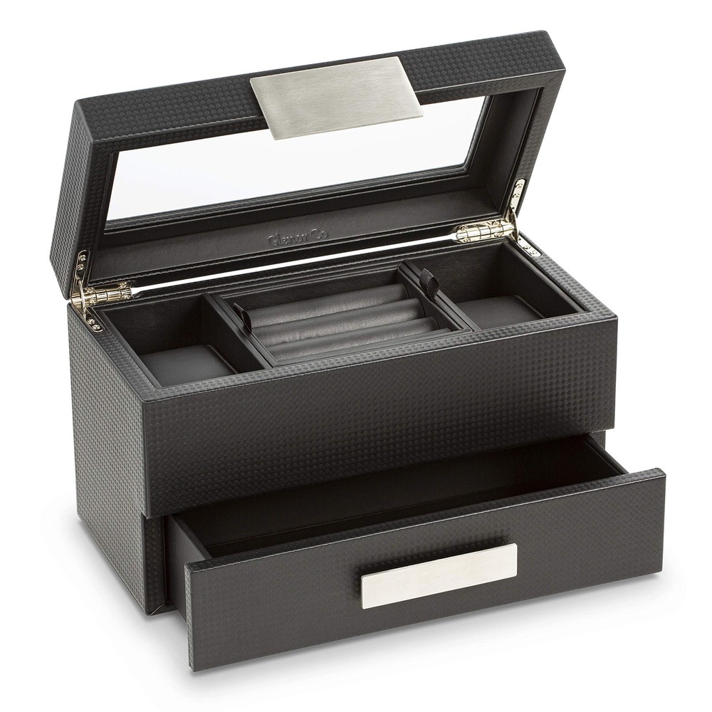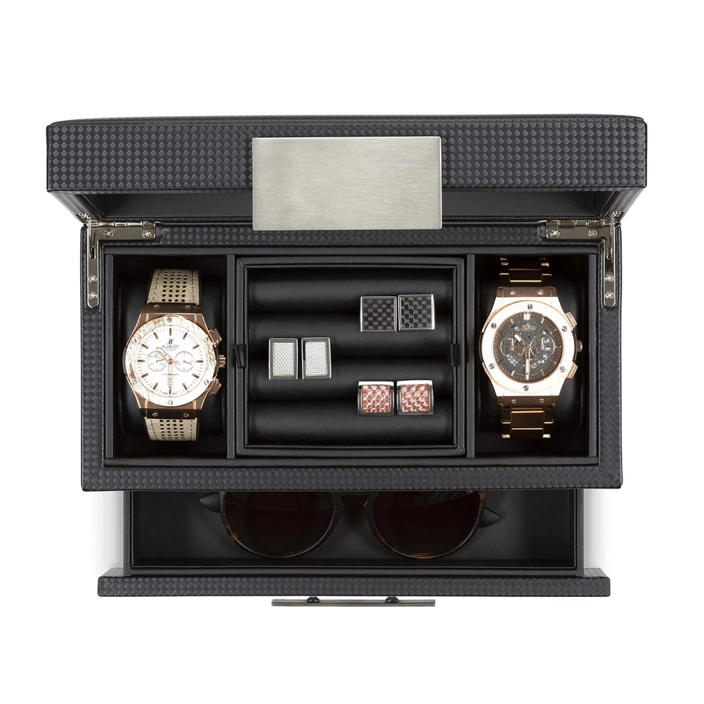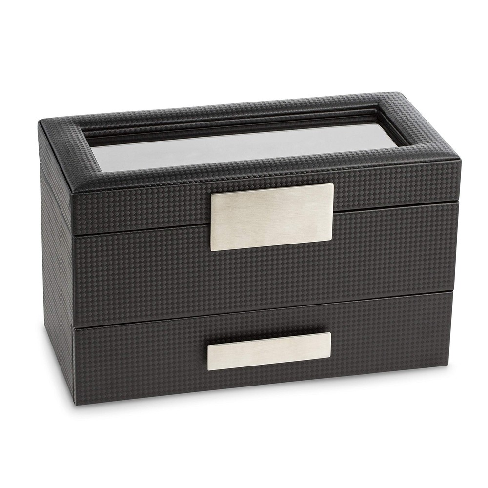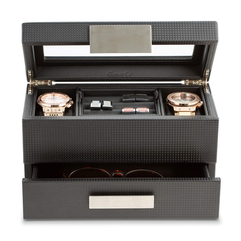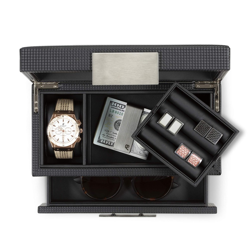2 Slot Watch Box with Cuffling Tray and Valet Drawer STAY ORGANIZED - Keep your watches, sunglasses and other valuables organized , all in one place and in one glance. This small valet box takes up minimal space on your dresser but holds a whole lot. It will hold ; 2 large watches , 6 pairs of cufflinks, tie clips or cash in the hidden compartment, sunglasses , purses , pens and other large accessories in the bottom drawer. Save critical time and turn your frantic frustrated mornings into a breeze. CHERISH YOUR VALUABLES: Never misplace your valuables again. Keep your valuables safe from dust, scratches and falls in this handsome box. Keep them in their designated place and misplacing your valuables will be a thing of the past. UPGRADE YOUR DRESSER'S APPEARANCE - . Valet Jewelry Box boasts a unique beautiful and a more convenient design than the other boxes out there. With its small clean look and metal accents this Box's elegance will greatly enhance your dresser and add a sophisticated feel to your room. Additionally, Unlike others, our box can be easily opened and closed with one hand for the most convenient use. BE THE PROUDEST GIFTER: This Valet Jewelry box is so Elegant and Luxurious you will feel so proud to be giving this as a gift at any occasion. It is a definite pleaser. It is also already packaged in an elegant gift box and includes a blank card , all ready for gifting. This makes a wonderful gift for a father, boyfriend, husband, son, colleague, friend or any other special man in your life. A BRAND YOU CAN TRUST: This is an ORIGINAL Men's Valet Box that was designed, Trademarked and Patented by . stands firmly behind its products and only the HIGHEST QUALITY materials and craftsmanship were used to create this box. DIMENSIONS - Exterior: 9½ Inches long x 4¾ Inches wide x 5¾ Inches high.