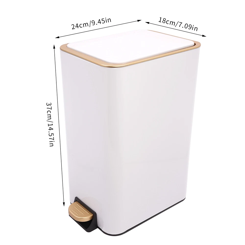 Size: 24*18*37cm/9.45*7.09*14.57in Capacity: 12L/3.17Gal Gross Weight: 2.3kg/5lbs gtin13: Does not apply Assembly Required: No Features: Lid Lock Item Width: 18cm/7.09in Item Height: 37cm/14.57in Item Length: 24cm/9.45in Net Weight: 1.8kg/3.97lbs Style: Modern Type: Step Trash Bin Mount Type: Free Standing Room: Home Office/Study UPC: Does not apply Packaging Size: 39.5*30.5*22cm/15.55*12*8.66in Material: Carbon Steel, PP, ABS Brand: Unbranded Shape: Rectangle Color: White
