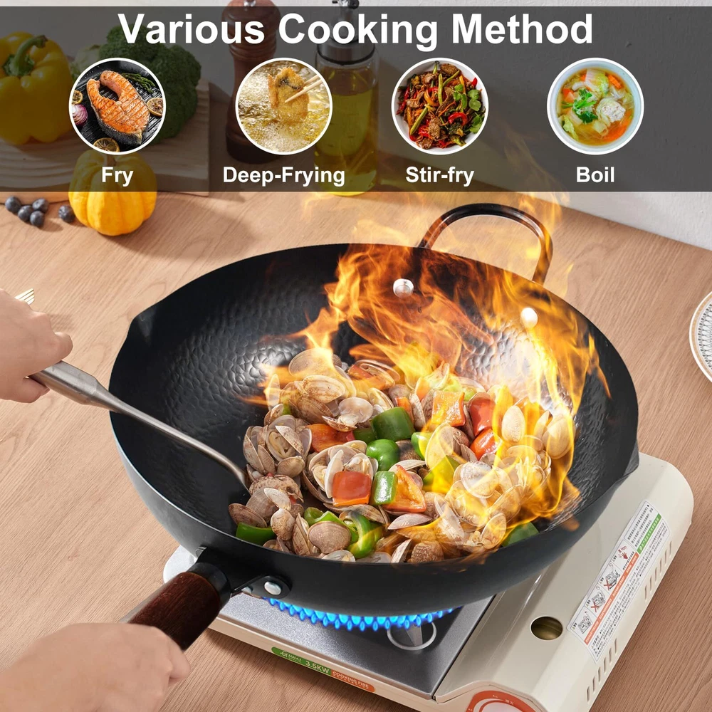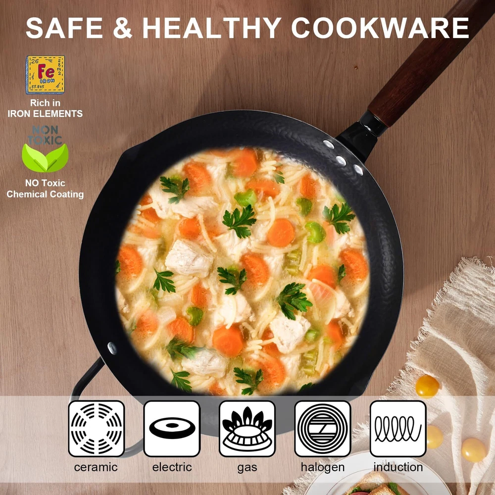 Carbon Steel Wok Pan Safe & Healthy Cookware: The FNTcarbon steel wok is crafted from black carbon steel through nit-riding technology, free from coatings like Teflon. This means that even during intense stir-frying, no harmful substances are released. Similar to cast iron woks, our nonstick wok pan is rich in iron elements, adding nutritional value to daily meals. Ergonomically Designed Handle: The woks & stir-fry pans nonstick boast dual auxiliary handles, offering additional support and stability when handling heavy loads. This design minimizes strain on the wrists and ensures a more comfortable cooking experience. The detachable handle allows this carbon steel wok to be oven-safe. Additionally, the hanging-loop handle facilitates convenient storage, preserving kitchen space by enabling the pan to be easily hung when not in use. Strong durability: This nonstick wok pan adopts a honeycomb structure to maintain stability at high temperatures and resistance to exposure to water and oxygen. Even with the use of metal kitchen utensils, the hammer pattern helps prevent scratches, significantly preserving the appearance of the wok pan and extending this carbon steel wok’s lifespan. Whether you're a professional chef or a home kitchen enthusiast, our durable carbon steel wok will enhance your cooking experience with added joy. Unique Double V-shaped Spouts: Our woks & stir-fry pans nonstick is ingeniously crafted with pouring spouts, perfect for seamlessly drizzling sauces over stir-fried dishes or delicately pouring broth into soups without any spillage. Whether you’re a left-handed or right-handled cook, these spouts are ergonomically designed for ease of use. Multifunctional Cookware: This carbon steel wok is a versatile kitchen essential capable of meeting various cooking needs, including stir-frying, boiling, stewing, frying, etc., catering 4-6 people. Flat-bottom ensures even heating on any stovetop, providing flexibility for your culinary adventures. Suitable size: The carbon steel wok is the perfect size, 11.8 inches wide and 3 inches deep, making it easy to handle whether it is daily home cooking or gatherings with friends.