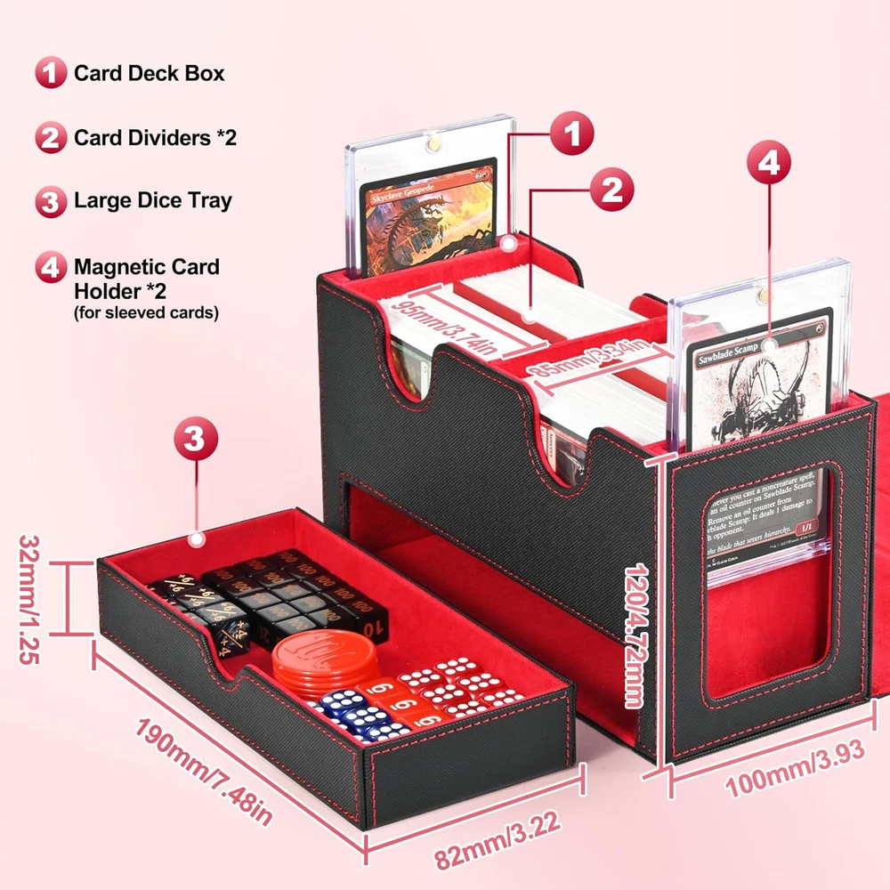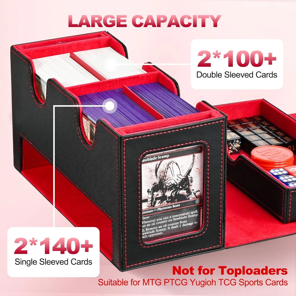 Two Commander Display: The double deck box is specially tailored for commander EDH players; Through the display window you can easily glance at the box's contents without opening the box; Included two 35pt card holder can show the card clearly Durable and Functional: Card deck box is made of PU leather exterior that provides good protection, and soft microfiber interior to protect your cards from scratches; Wide U-shaped opening ensures easy access to your cards, making it convenient Large Capacity: This display deck box works with unsleeved cards, single-sleeved cards, double-sleeved cards; Each case can hold 140+ single-sleeved cards or 100+ double-sleeved cards; Included two card dividers allow you to classify different cards Strong Magnetic: The card storage box features strong magnetic closure that ensures the box stays tightly closed even if it is tipped over, provide good protection for all types of cards; The dice tray design helps you to store dice and counters Good Choice for Card Collectors: UAONO deck case for trading card is a ideal choice for gamer, suitable for storing game card, sports card ect.; Enjoy card games with your friends or family; If you have any questions, feel free to contact us Product Description Card Deck Box With Dice Tray Large Capacity Speaking of capacity, we've tested this card storage box with various popular sleeves. It can comfortably hold up to 200+ double-sleeved cards or an impressive 280+ single-sleeved cards. And don't forget the giant dice tray that can accommodate more than 50 dices – all your gaming essentials are organized and within arm's reach. If you are an avid commander EDH player, then look no further! Our innovative design is tailored to meet the needs of commander enthusiasts like you. With this card storage box, you can safely house your cards and showcase your commander with pride in our unique commander slot. Moreover, 2 magnetic holders can prevent the commander accidentally from shuffling into your cards.