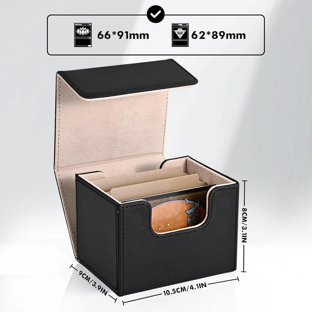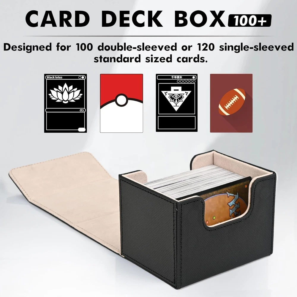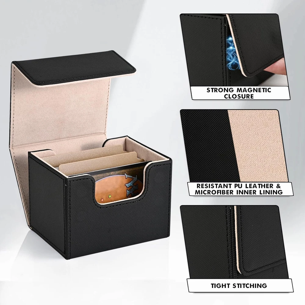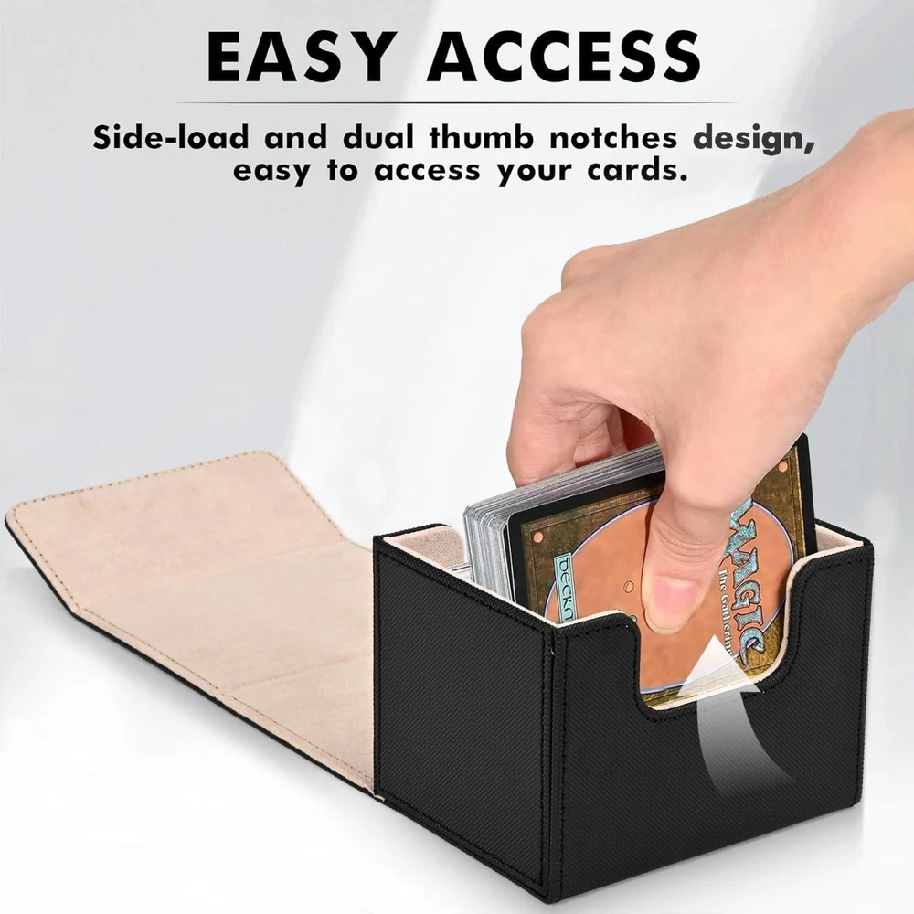 ๐ฃ๐ฟ๐ฒ๐บ๐ถ๐๐บ ๐ค๐๐ฎ๐น๐ถ๐๐๏ผPremium mtg card deck box has two-layer construction, the outer layer that is plasticized water-resistant PU leather material, and the inner layer has a soft microfiber material to protect the cards inside. This box is better than the basic boxes made of single-sheet PVC-type material. Made from archival-safe, non-PVC material, the ZLCA Card Deck Box is the perfect way to store your cards. ๐๐ถ๐ด๐ต ๐๐ฎ๐ฝ๐ฎ๐ฐ๐ถ๐๐๏ผCompared with the traditional plastic card box, the durable leather card deck box gets an upgrade, and offers more room for your cards. Specially designed for Commander EDH players, but also for all regular decks with extra cards or tokens. Designed to hold 100+ double-sleeved cards or 120+ single-sleeved cards. If you donโt sleeve cards and use this for non-premium cards/games, this will hold over 200 cards. ๐ฆ๐๐ฟ๐ผ๐ป๐ด ๐ ๐ฎ๐ด๐ป๐ฒ๐ ๐๐ฒ๐๐ถ๐ด๐ป๏ผTight stitching and 8 powerful magnets keep the card deck case secure during transport. Even when fully loaded and turned upside down, the card holder case stays tightly closed at all times, no need to worry about losing your precious cards. The stitching is clean and all corners look great and are glued well. ๐จ-๐๐ต๐ฎ๐ฝ๐ฒ ๐๐ฒ๐๐ถ๐ด๐ป๏ผThe box features a double-sided, wide-mouth U-shaped design. Even if the box is full of cards, you will be able to easily remove them all at once. The just-right design allows you to put and take cards with ease and without hindrance. ๐ ๐๐น๐๐ถ๐ฝ๐น๐ฒ ๐จ๐๐ฒ๐๏ผOur game card box holds your double-sleeved, KMC inners, Dragon Shield outers, and commander deck perfectly. Also compatible with Magic The Gathering, YuGiOh, and Cardfight Vanguard, Duel Masters, etc, a variety of TCG/CCG/LCG & other collectible cards. We highly, recommend giving these a try. Product Description ZLCA CARD DECK BOX Add to Cart Add to Cart Add to Cart Add to Cart Add to Cart Add to Cart Customer Reviews 4.7 out of 5 stars 669 โ 4.7 out of 5 stars 287 4.9 out of 5 stars 239 4.7 out of 5 stars 453 4.8 out of 5 stars 456 4.7 out of 5 stars 453 Price $9.99 $ 9 . 99 โ $24.99 $ 24 . 99 $13.49 $ 13 . 49 $23.99 $ 23 . 99 $14.99 $ 14 . 99 $12.99 $ 12 . 99 Dice Tray โ โ โ โ โ โ โ Product Size 4.1*3.5*3.1inch 3.2*3.1*4.1 inch 8.86*3.94*4.88 inch 3.9*3.2*4.3 inch 11.4*9.4*4.1inch 6.1*4.1*3.9inch 11.3*3.7*4.3inch Unsleeved Cards 220+ 200+ 600+ 200+ 2400+ 350+ 800+ Single-sleeved Cards 120+ 100+ 300+ 120+ 1800+ 200+ 600+ Double-sleeved Cards 100+ 80+ 200+ 100+ 1050+ 150+ 500+
