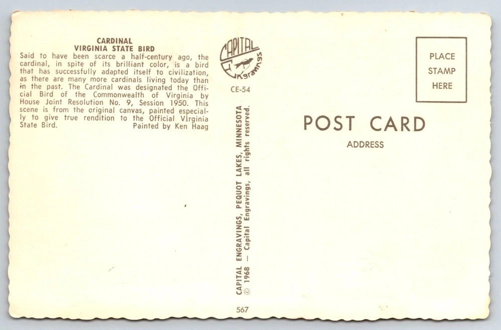 Cardinal Virginia VA State Bird Ken Haag 1968 Vtg Postcard C11