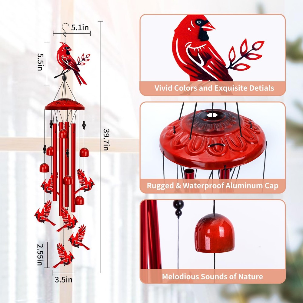 Cardinal Wind Chimes for Outside, Large Cardinal Garden Decor Bird Wind Chime, Memorial Cardinal Gifts for Women, 40" Outdoor Windchimes for Lawn, Porch, Patio, Yard, Christmas Cardinal Wind Chimes: This red cardinal wind chime features a striking design that adds a pop of color and charm to any space. Includes large cardinal ×1, “S” shaped hook ×1, small cardinals ×6, small bells ×6, corrosion resistant aluminum tubes ×4, top cover ×1. Melodious Tunes: Enjoy the soothing sounds of the wind as it gently plays with the delicate chimes, creating a calming and serene atmosphere. This outdoor wind chimes sounds like the wind whispering and makes your body and mind feel relaxed. Sturdy Cardinal Garden Decor: Handcrafted with care, this wind chime is made to last, ensuring long-lasting beauty and enjoyment. Rugged construction with excellent corrosion and weather resistance. Easy Installation: Hang this cardinal wind chime effortlessly in your garden, patio, porch, lawn, or balcony to instantly elevate your outdoor decor. Meaningful Decor: Perfect for bird lovers or anyone who appreciates nature, this cardinal decor makes a thoughtful and symbolic choice for women, mom, grandma and loved ones on birthday, Christmas, New Year's, Mother's Day. Wind Chimes for Outside Shipping We offer FREE shipping on all orders! We ship within Three business days of payment, usually sooner. We use a selection of shipping services such as UPS, FedEx, USPS etc. We only ship to the lower 48 states, no APO/FPO addresses or PO Boxes allowed. Local pickups and combined shipping options are not provided at this time. Return You can return a product for up to 30 days from the date you purchased it. Any product you return must be in the same condition you received it and in the original packaging. Please keep the receipt. Payment We accept payment by any of the following methods: PayPal Please pay as soon as possible after winning an auction, as that will allow us to post your item to you sooner! Feedback Customer satisfaction is very important to us. If you have any problem with your order, please contact us and we will do our best to make you satisfied. Contact Us If you have any queries, please contact us via ebay. We usually respond within 24 hours on weekdays. Please visit our eBay store to check out other items for sale! Thank you for shopping at our store.