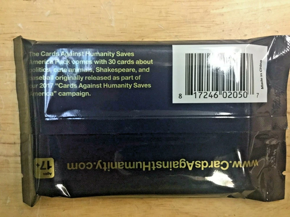 Cards Against Humanity Saves America Pack, 30 Cards Themed Pack This is a Themed pack of 30 cards, main game is required Comes with 30 cards previously released as part of Cards Against Humanity Saves America. They’re mostly about politics, cute animals, baseball, and Shakespeare. --------------------------------------------------------------------------------------------------------------------------------------------------------------------- We are a freight salvage business. Our items are acquired through unclaimed, overages and refusals through the freight industry. Unless otherwise stated, to the best of our knowledge all items are new and in good working condition. We have no further technical knowledge of this item than what is stated in this listing. Please consult a dealer, manufacturer or other source for further information on this product. We are not an authorized distributor or manufacturer's representative of the brands we sell. Private brand names shown in our listings and trademarks are the property of their respective owners. We do not offer any warranties on the product either expressed or implied, other than the product be in working condition at the time of receipt. Any warranties would be the sole discretion of the manufacturer. Individual manufacturers may or may not honor any warranties on the product. 2c/1b0201