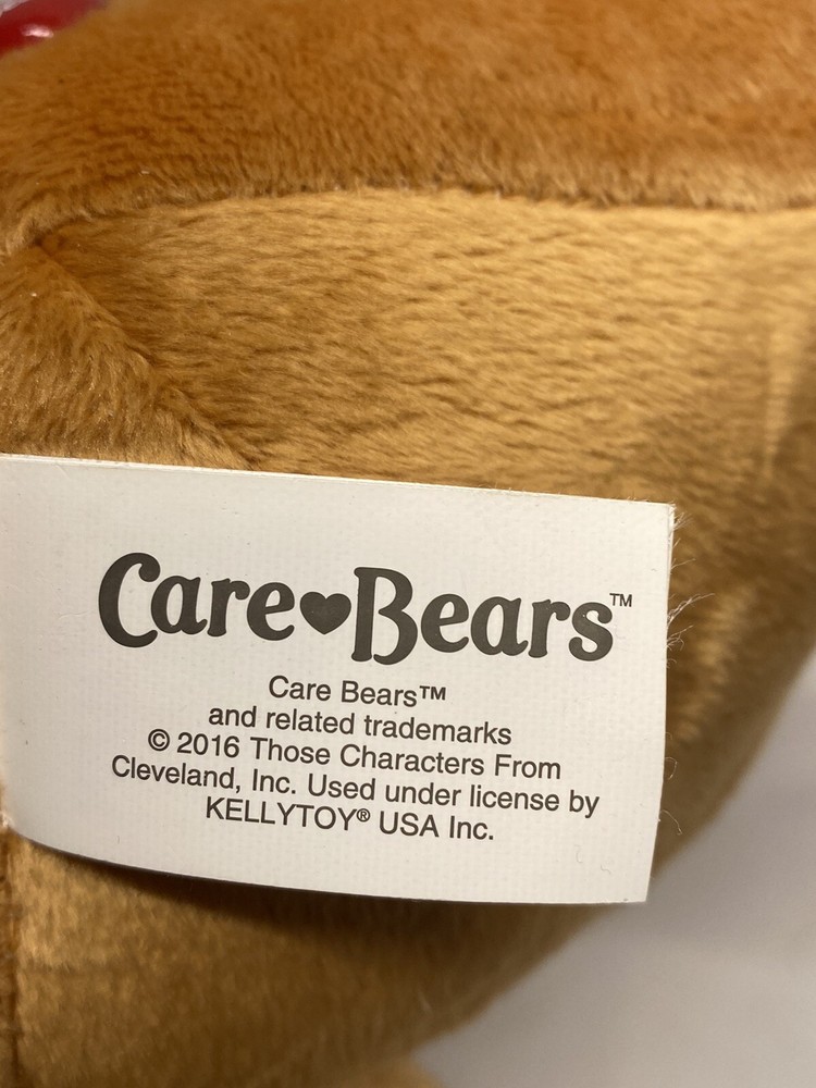 This is a Care Bears Tenderheart Bear plush toy measuring 15 inches. It features a red heart on its tummy, is part of the Care Bears franchise, and was manufactured in 2016. This limited edition stuffed bear is surface washable, representing the character Tenderheart Bear. It is a single unit item and not handmade, suitable for all occasions.