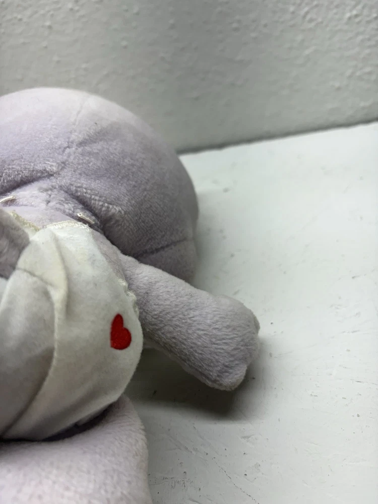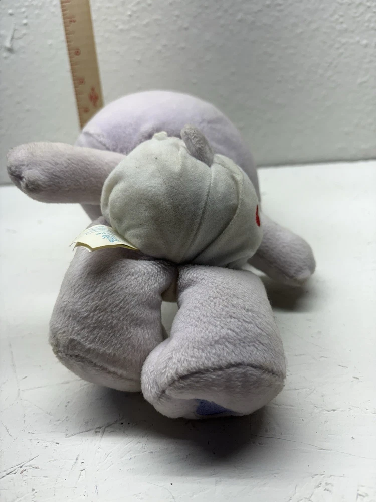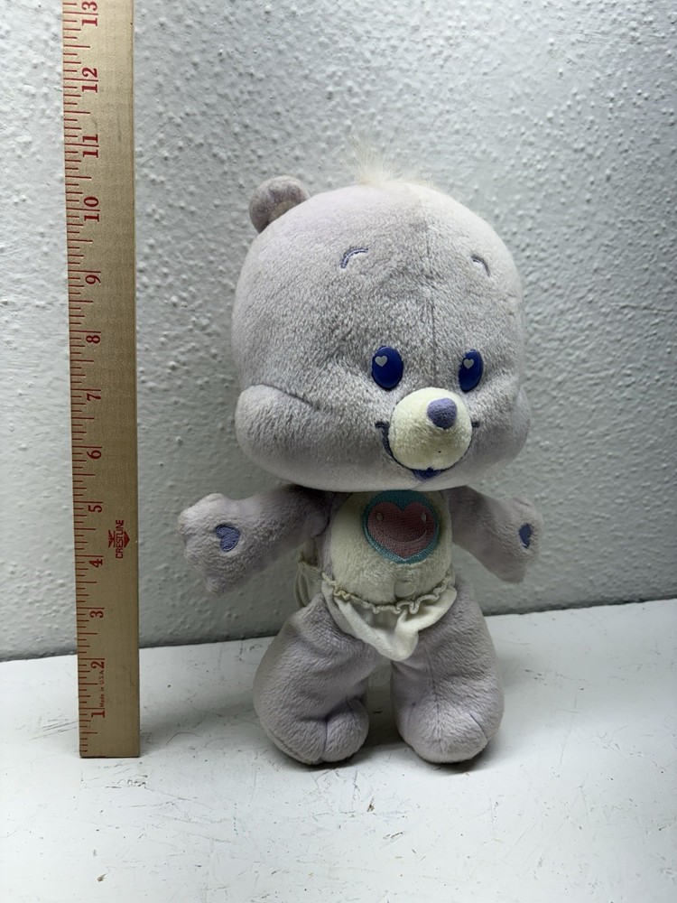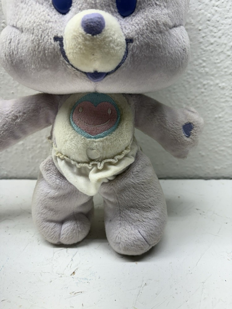 Adorable and cuddly Share Bear Cub from the Care Bears Cubs™ collection! This plush baby version of the classic Share Bear features soft lavender fur, a pastel heart belly badge, and a removable cloth diaper. Rare and hard to find! 💜 Details: • Character: Share Bear (Cubs version) • Official Care Bears Cubs™ plush • Approx. 10” tall • Purple fur with blue heart belly badge • Wears original diaper • Tag reads: Surface washable only. Polyester Fiber. Made in China. 📦 Condition: Pre-owned. Gently loved with minor surface wear and a few loose threads on the diaper (see photos). No holes or major stains. From a smoke-free home. Perfect for collectors of vintage Care Bears or nostalgic gifts for fans!
