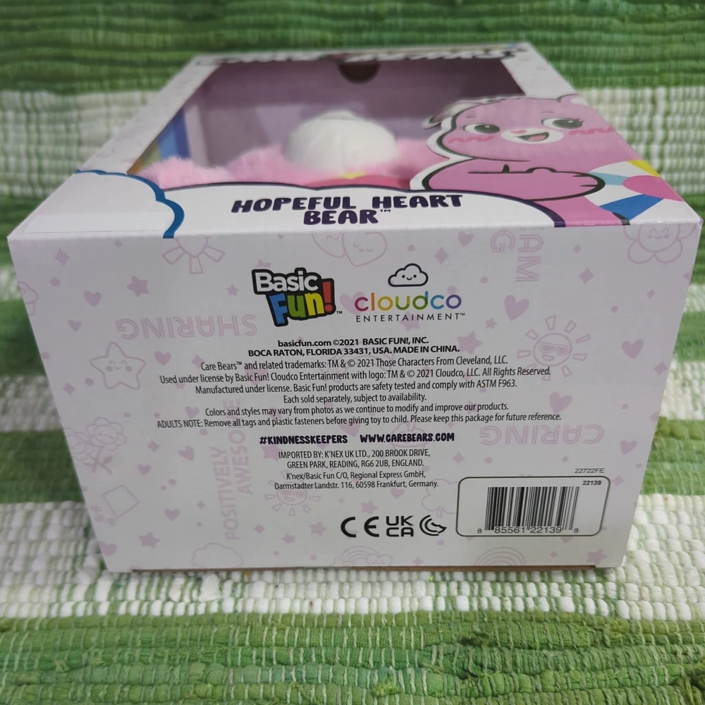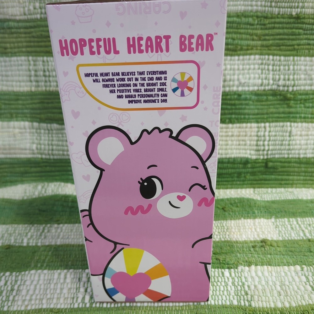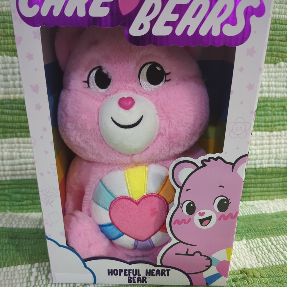 The Care Bears Hopeful Heart Bear is a 14” medium plush toy stuffed animal in pink, featuring black eyes and made of plush material. This original 2021 release from the Care Bears franchise is perfect for all ages, coming boxed and ready for gifting. This cute and cuddly bear is ideal for children aged 3 and up, and adds a fun and colorful addition to any collection or decor.