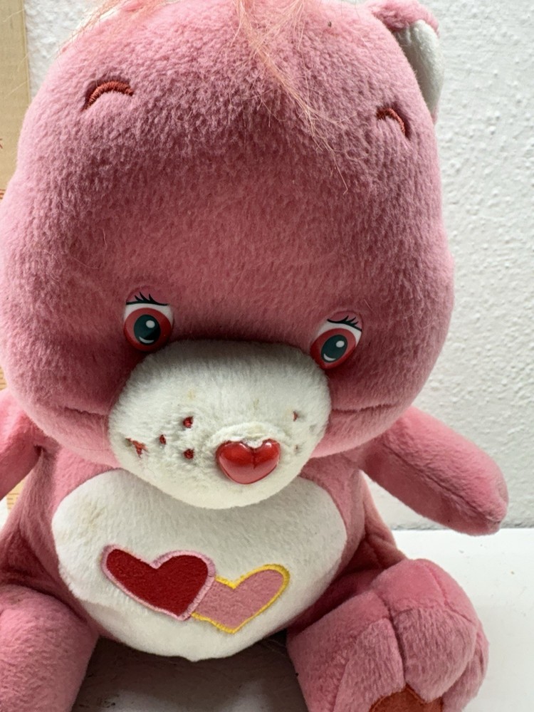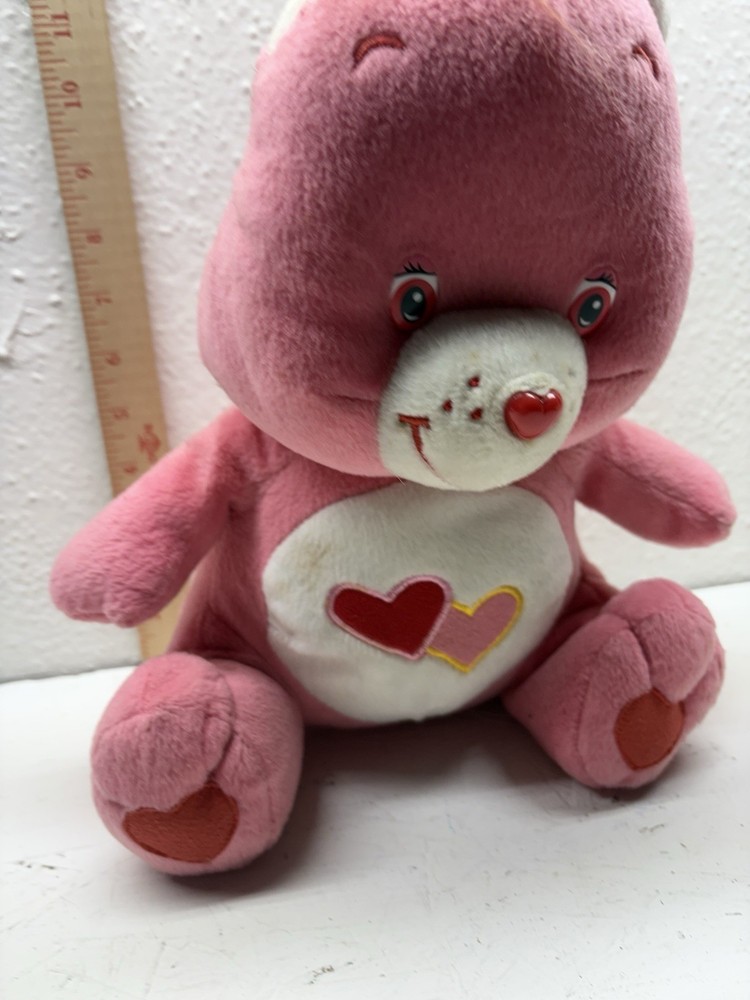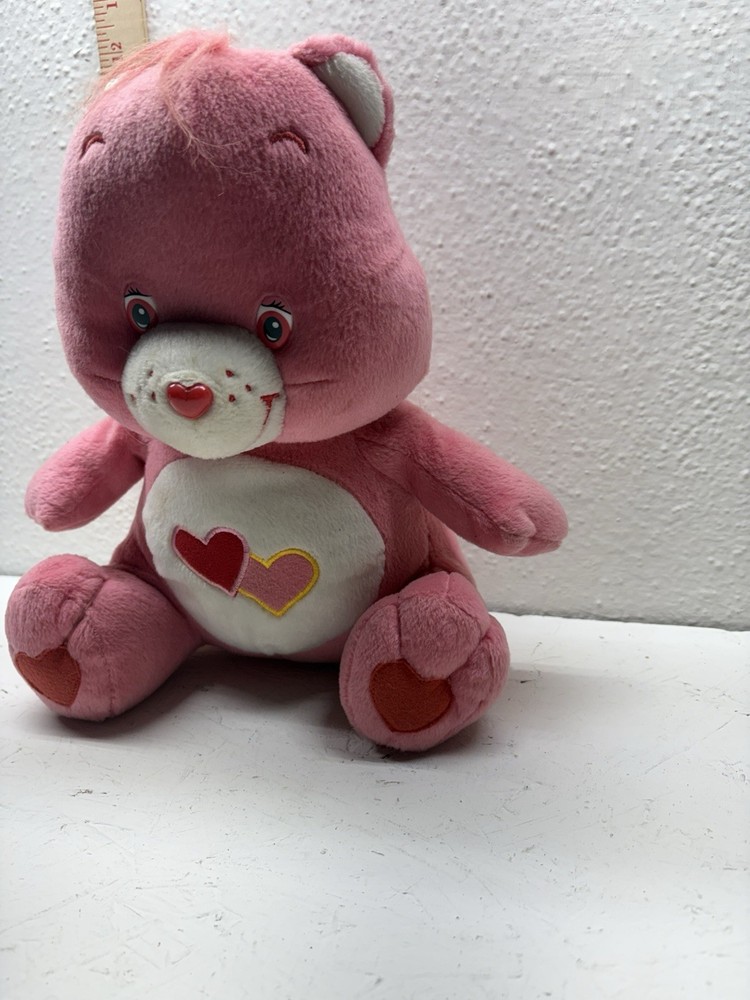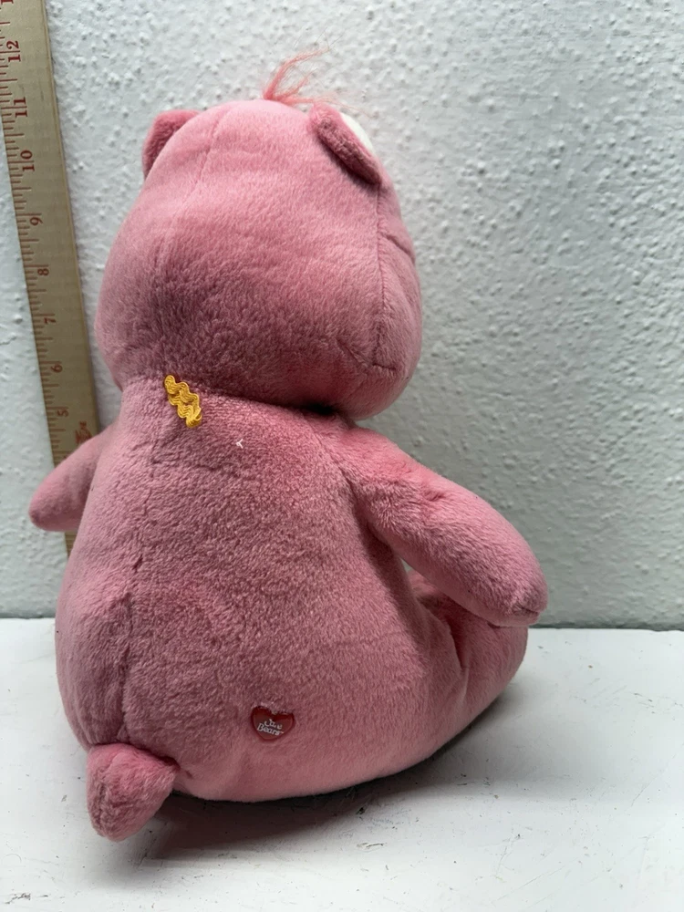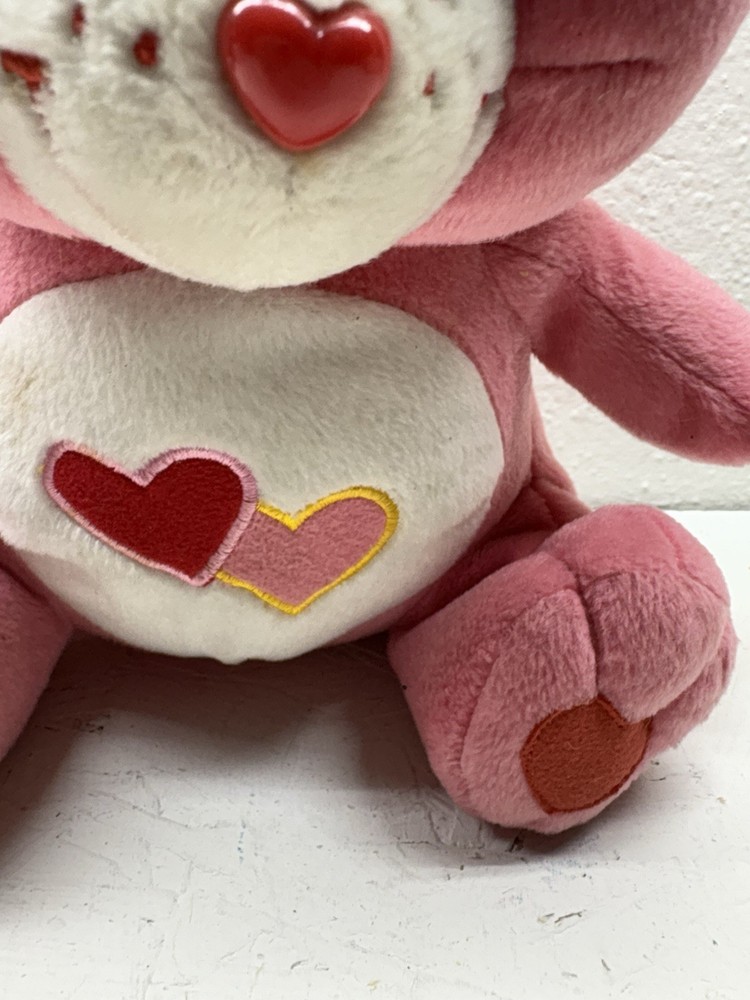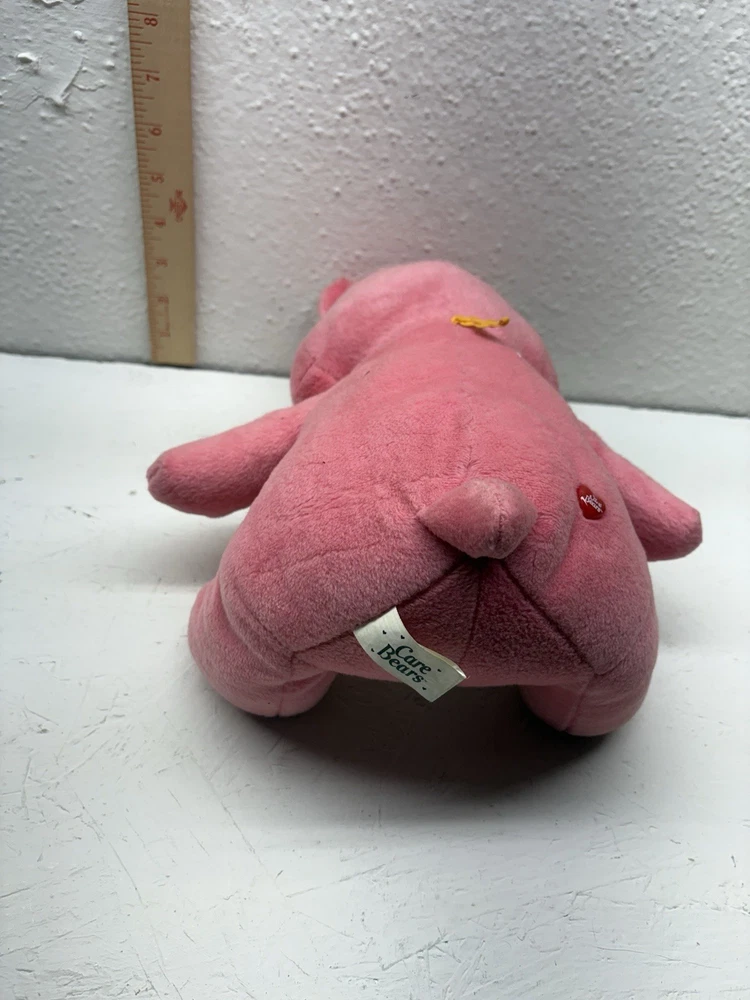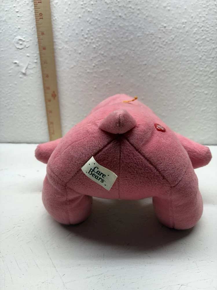 This adorable Love-a-Lot Bear plush is from the early 2000s Play Along Care Bears™ line, licensed by TCFC (Those Characters From Cleveland). It features a red and pink embroidered double-heart belly badge, classic pink plush, heart-shaped nose, and stitched heart paw pads. A nostalgic piece from the revival era of Care Bears! 🧸 Details: • Brand: Play Along / TCFC • Year: Early 2000s • Character: Love-a-Lot Bear • Size: Approx. 10” (sitting) • Features: Embroidered belly badge, red Care Bears heart tush tag • Condition: Gently used, no major flaws unless otherwise noted A great addition to any Care Bears collection!