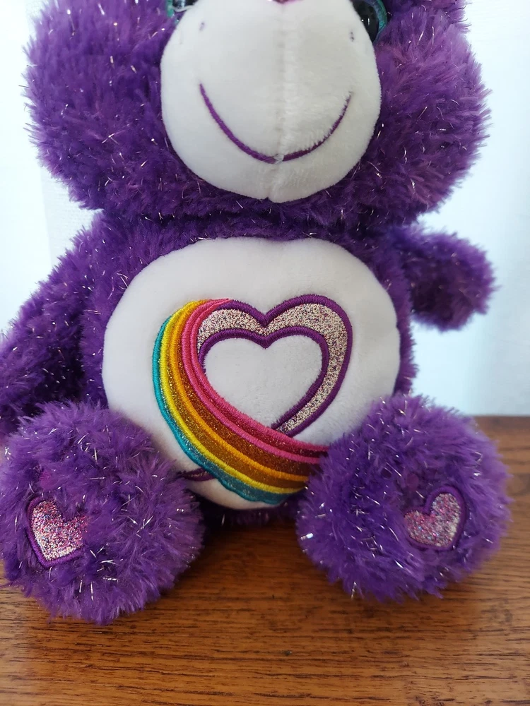 This is a 13-inch plush Care Bears Rainbow Heart bear from the 35th Anniversary collection. It features a purple sparkle design, manufactured in 2017 in China. With a contemporary age range, this adorable bear is part of the Care Bears brand and recommended for ages 2 and up.