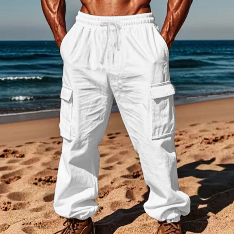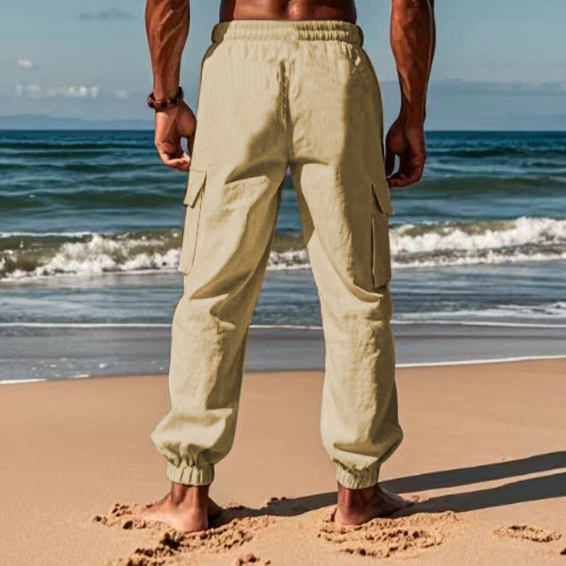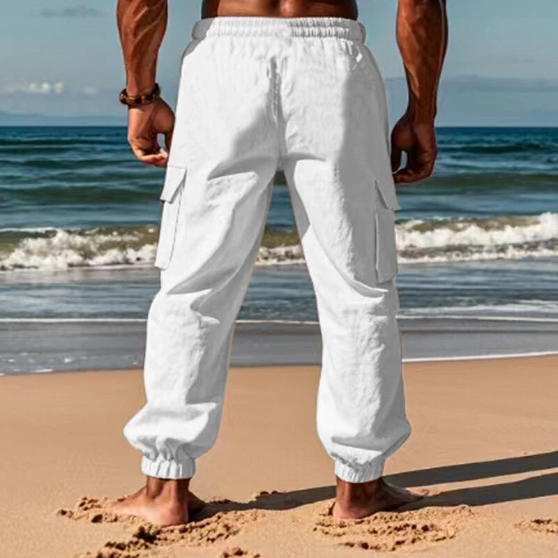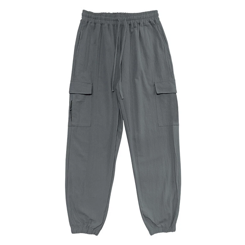 Cargo Pants Casual Men's Drawstring Multi-pocket Thin Linen Blend Sport Trousers