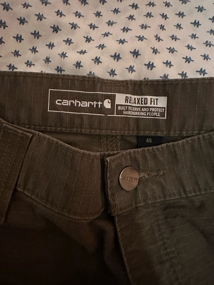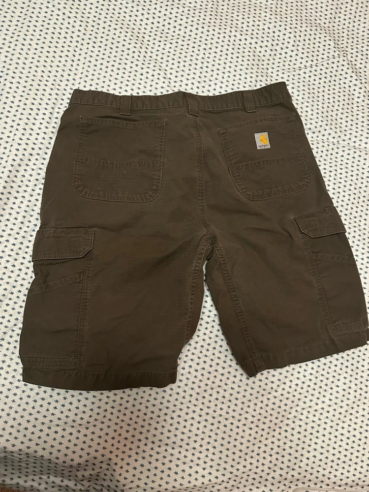 Carhartt 40" waist dark green cargo shorts. Very nice color that goes with a lot of other ones. True to size, but with my height the shorts were just the slightest bit too short compared to traditional carhartt cargo shorts. Lots of pockets too so perfect for any job.