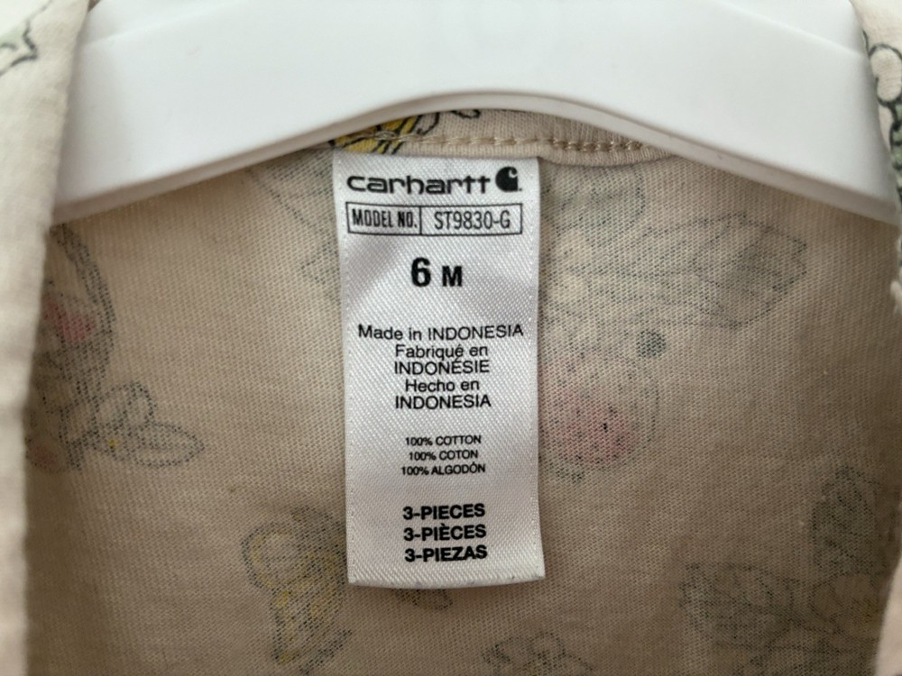 Size: 6 Months Occasion: Casual Closure: Snap Sleeve Length: Short Sleeve Department: Girls Theme: Butterfly, Flower, Food & Drink, Fruit Type: One-Piece Garment Care: Machine Washable Seller Notes: “In very good condition. Free of rips or stains.” Color: Beige Style: Bodysuit Pattern: Floral Brand: Carhartt Number of Pieces: 1 Piece Set Includes: Bodysuit Neckline: Crew Neck Material: 100% Cotton Accents: Button Features: Comfort, Easy Care, Lightweight, Stretch Country of Origin: Indonesia Season: Fall, Spring, Summer