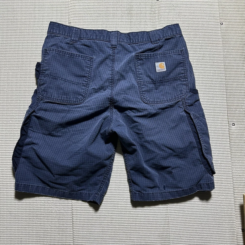 Slight defects in photos The Carhartt Cargo Shorts are designed for men in a relaxed fit style, made of durable canvas fabric in a classic blue color. These workwear shorts have a size 34 waist and feature a stretch material for added comfort and flexibility. With a cargo style, these shorts offer ample storage with multiple pockets for carrying essentials while on the job or during outdoor activities. Perfect for those looking for a rugged and practical shorts option for various work or casual settings.