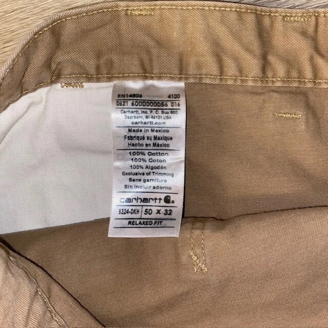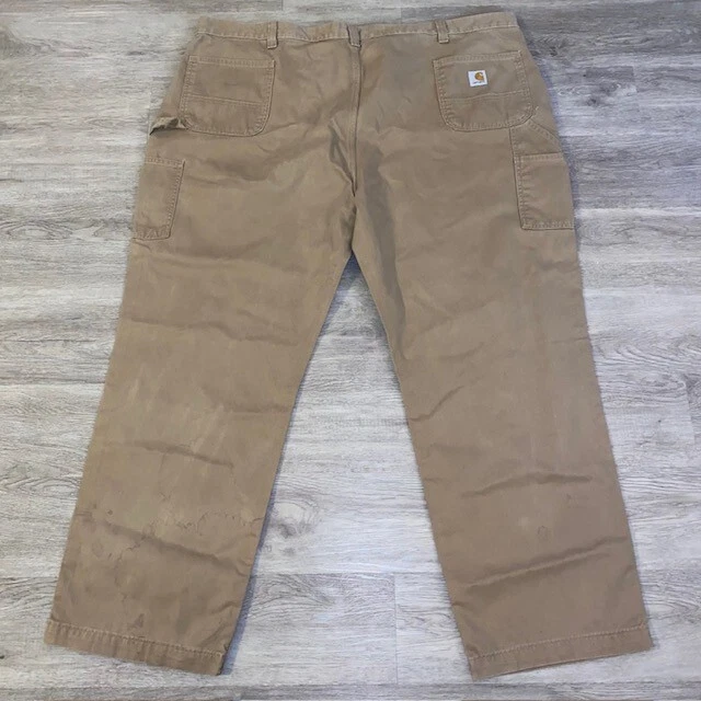 Carhartt Carpenter Pants Mens 50x32 Dark Khaki Rugged Canvas B324-DKH Some stains from use. See photos. 100% Cotton Made in Mexico Machine Washable 50" Waist 14" Rise 31" Inseam