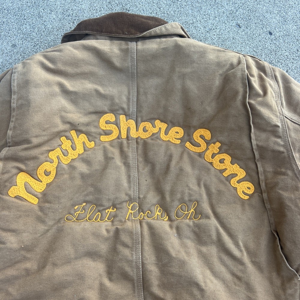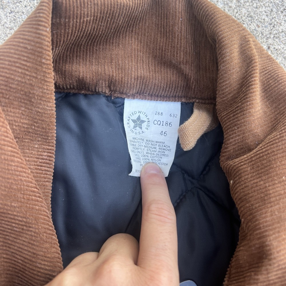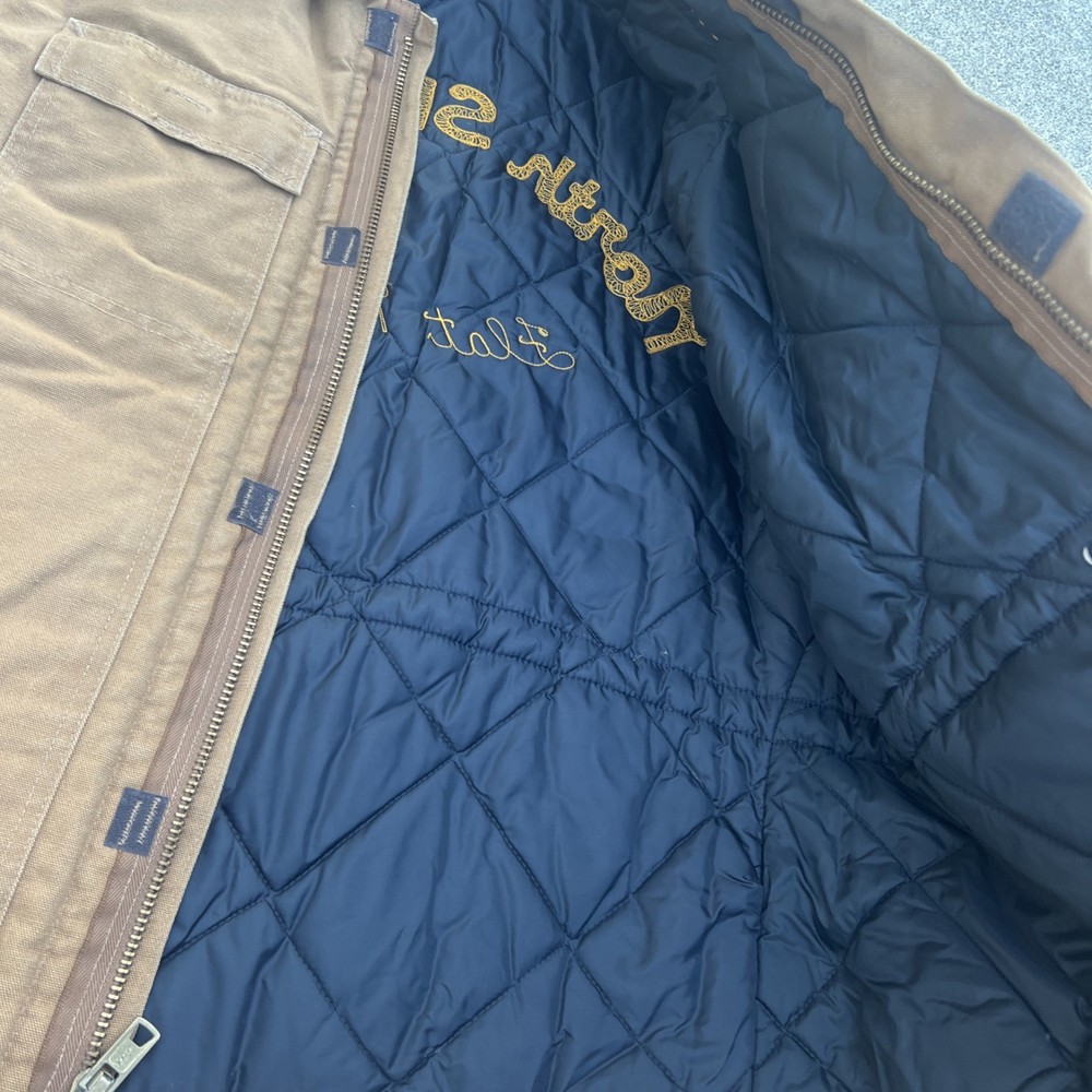 The Carhartt Duck Cotton Chore Jacket in size 46 is a vintage-style bomber jacket perfect for casual, workwear, or business occasions. Made with brown cotton canvas fabric and lined with nylon, this mid-length jacket features a spread collar, quilted details, and multiple pockets for functionality. The jacket is insulated with polyester and has a zipper closure, making it ideal for fall, winter, and spring seasons. With its classic design, rugged construction, and American-made appeal, this Carhartt jacket embodies the brand's heritage and outdoor-themed aesthetic.